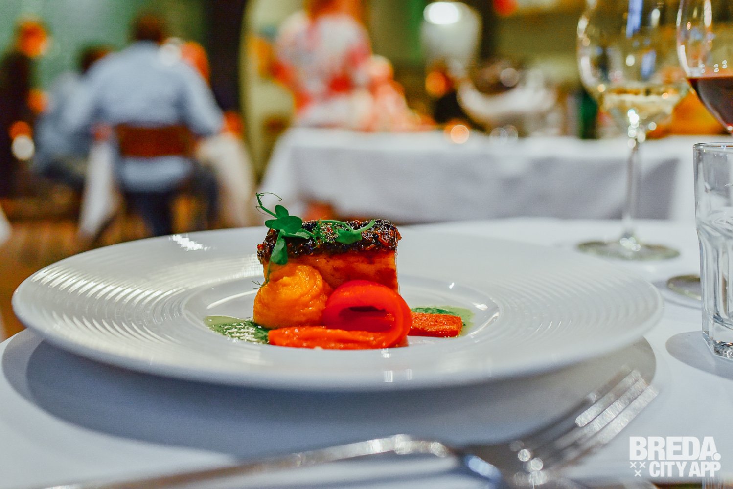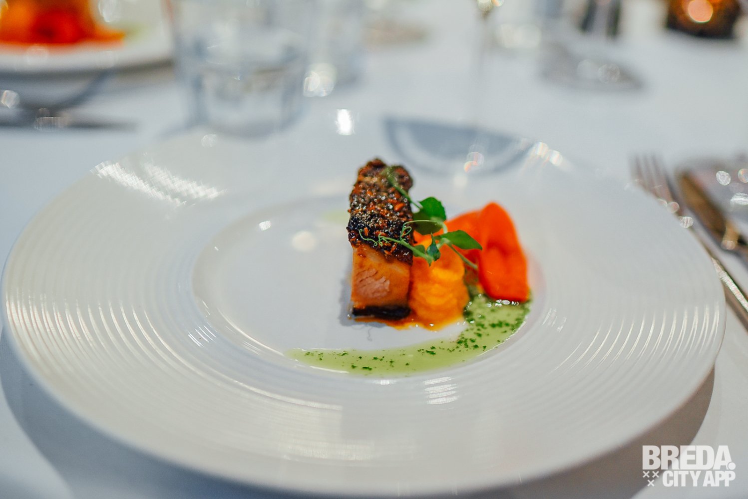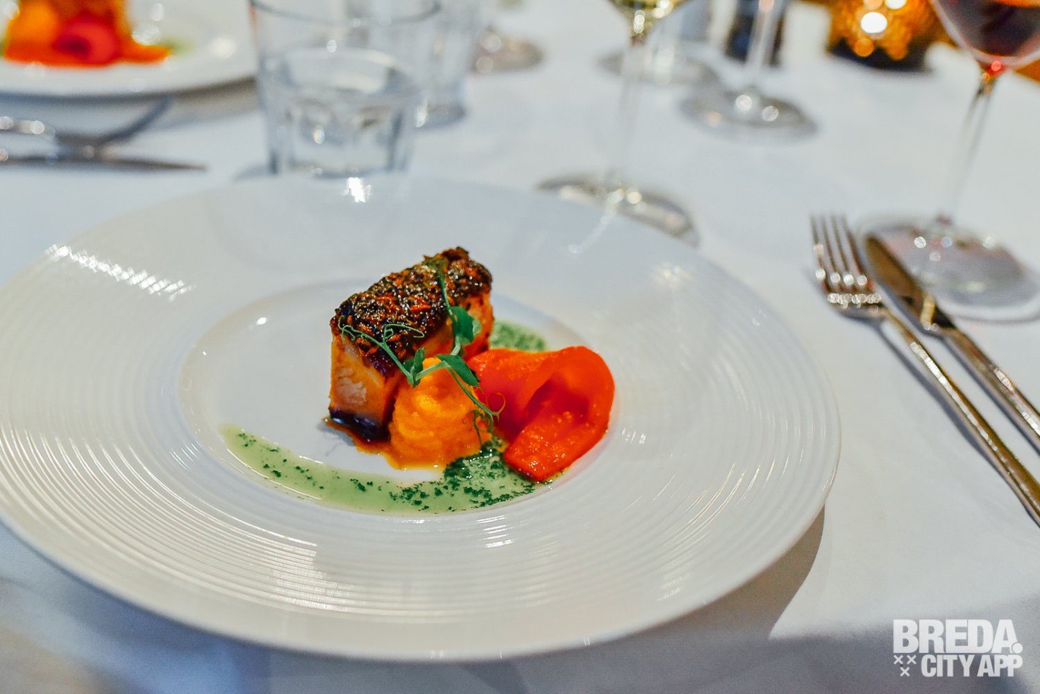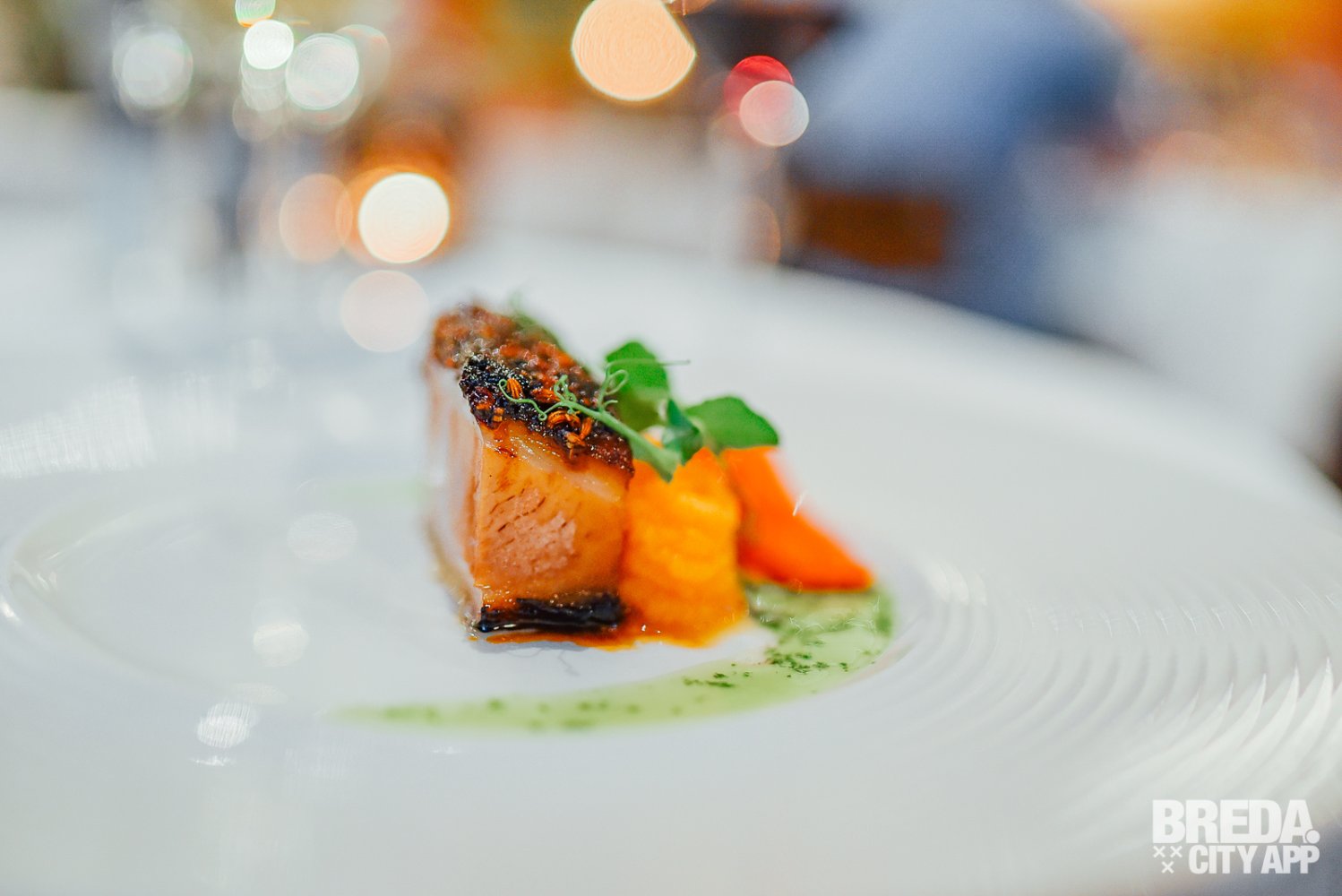 Voor het tweede tussengerecht maken we een overstap naar vlees. Een langzaam gegaard stukje buikspek met balsamico, een puré van zoete aardappel, geroosterde paprika en yoghurt verschijnt voor ons op een mooi opgemaakt bord. Wat ruikt dit lekker! Complimenten voor de presentatie, want ook dit bord ziet er prachtig uit en vormt een waar kleurenpallet. Het malse vlees is voorzien van een laklaagje waarin we onder andere venkel ontdekken. Een gerecht dat op zichzelf staand al een geweldige smaaksensatie brengt, maar Barlucca en Darewines nog weten te versterken met de bijpassende wijnen. Een leuke ontdekking voor ons; we mogen hier zowel een rode als witte wijn bij drinken.