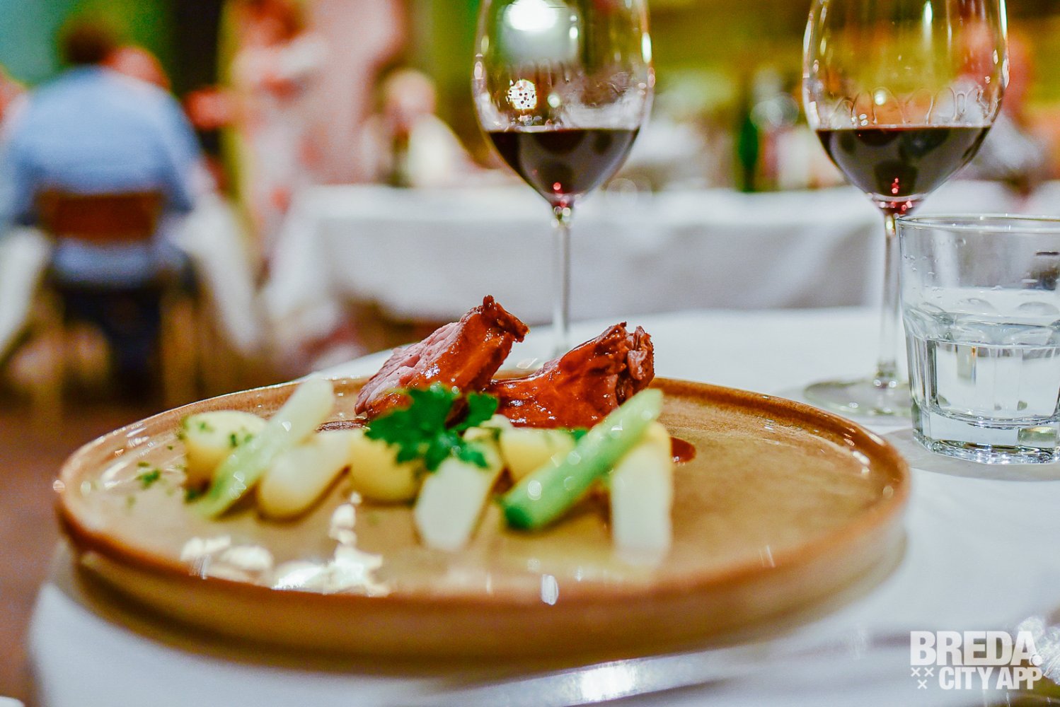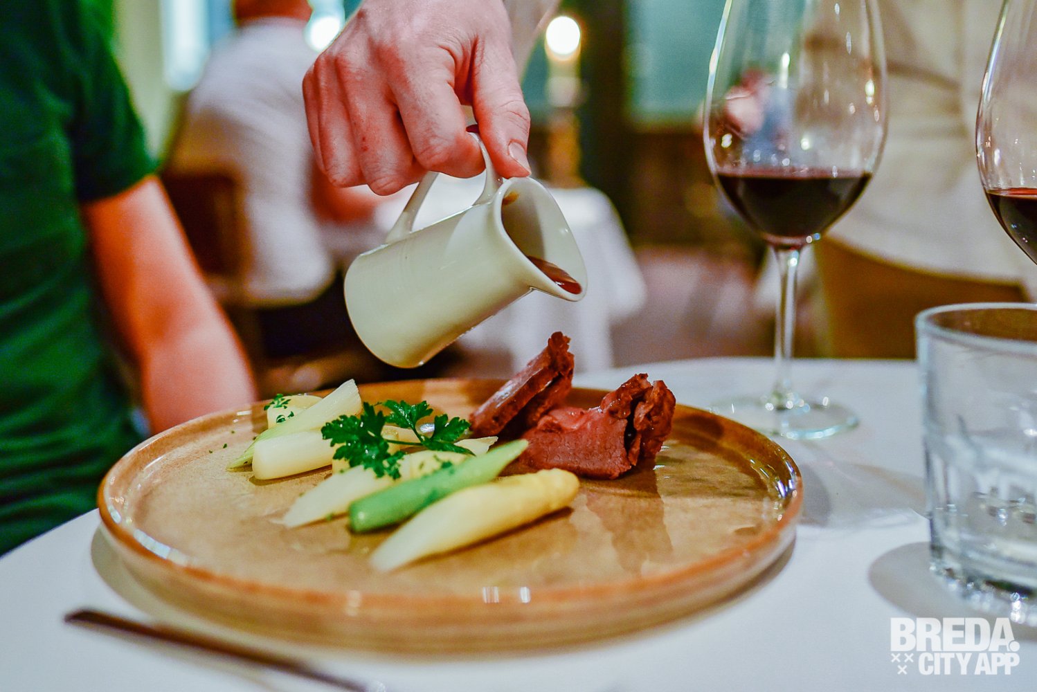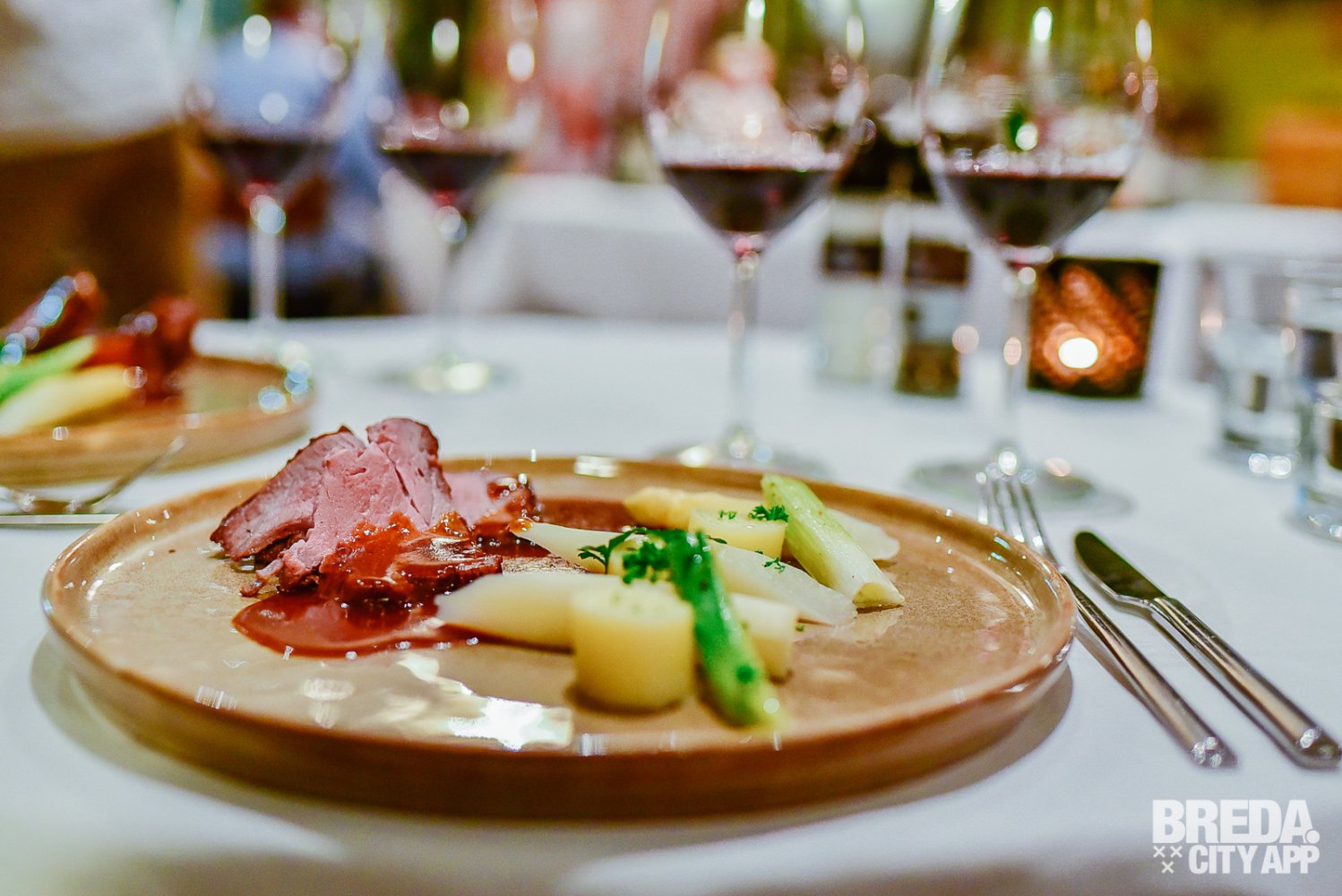 Met gepaste (en terechte) trots serveert Robin ons het hoofdgerecht. De lamsbout is rosé gebraden en ontzettend mals. We proeven hier ook opperdoes, een soort aardappel, bij en genieten wederom van heerlijke asperges. De lente-ui, rozemarijn en lamsjus maken het geheel bijna af. Bijna… want uiteraard proeven we hier ook weer twee prachtige wijnen bij.