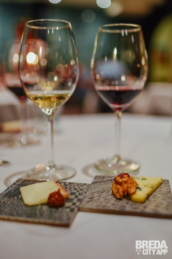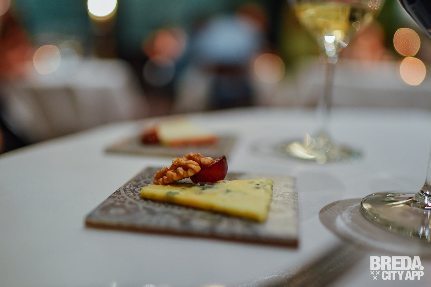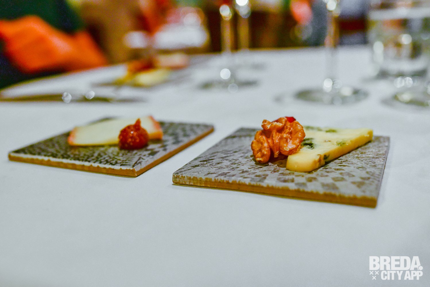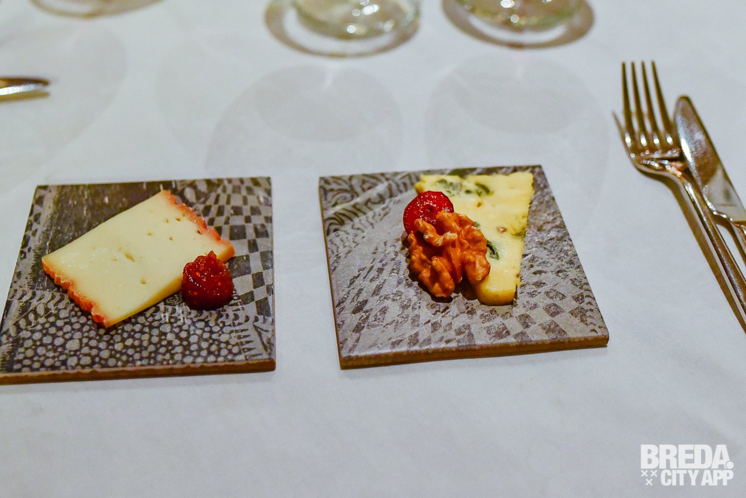 Terwijl we gezellig kletsen met Robin en Lisa verschijnen de kazen op ons gezellige tafeltje voor twee. Een Quadrello Di Bufala en een blauwschimmel genaamd Lazulli. We hebben het genoegen om nogmaals de Chardonnay te proeven. Dit keer in combinatie met de romige witschimmel kaas van de buffel. De Primitivo de Mandria uit de hak van de laars van Italië heeft zoete tonen van rood fruit die goed paart met de pittigheid van de blauwschimmel. De kaas is afkomstig van Nederlandse bodem, maar wordt gemaakt zoals Gorgonzola traditioneel gemaakt wordt.