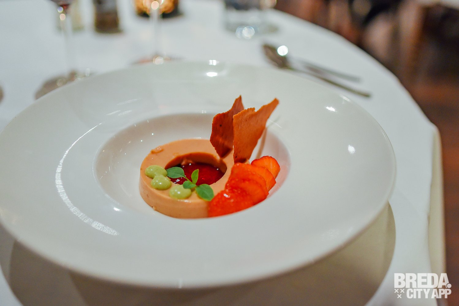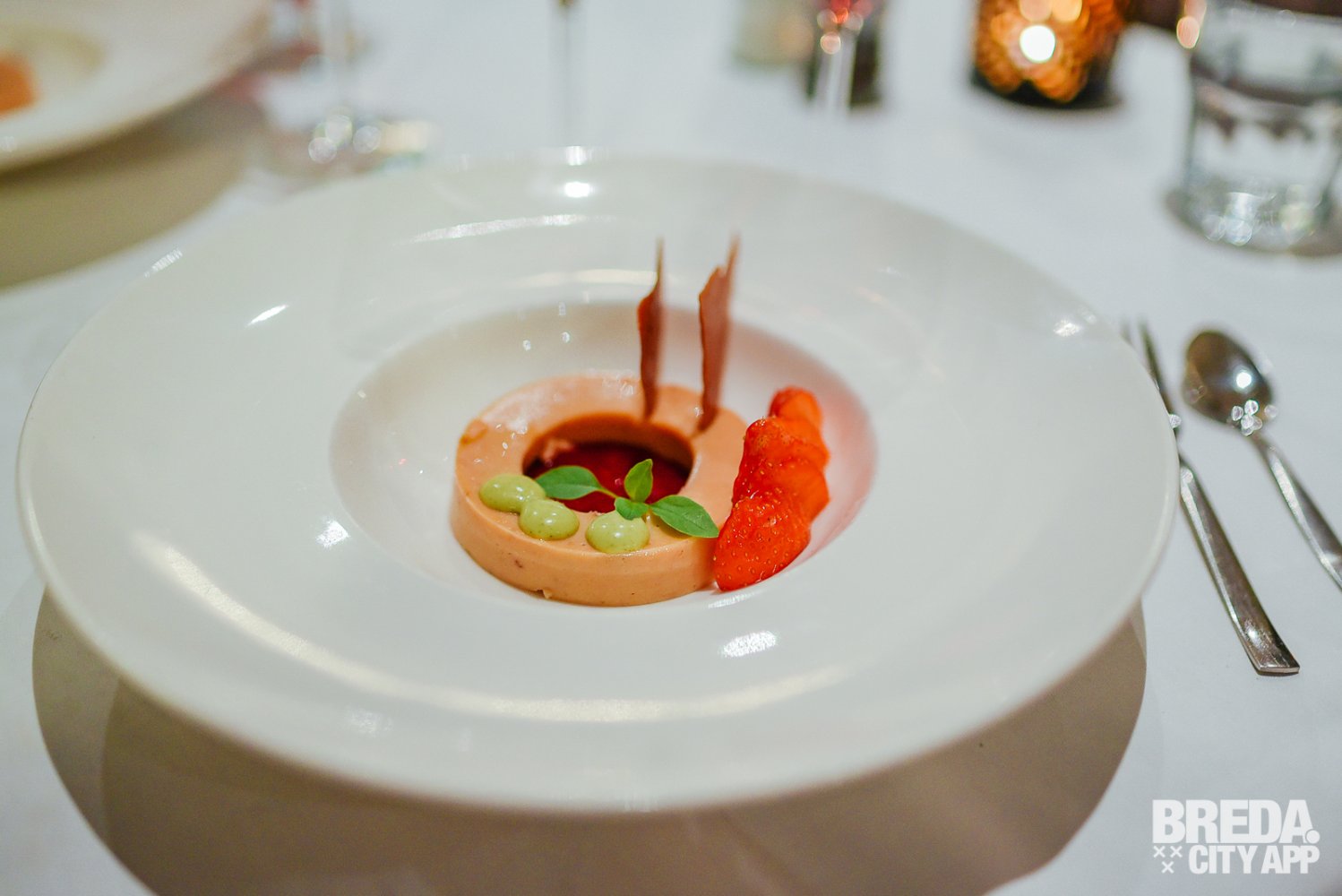 We sluiten deze fantastische avond vol culinaire topstukken en diverse geweldige fijne wijnen af met een dessert van aardbei. Cremeux van aardbei met daarin saus van aardbei en rode biet, geserveerd met een gelei van dragon en room. Hierbij schenkt Lisa ons een rode (ja rode!) Bubbel in. Deze Spumante is zwoel en smaakt naar aardbeien. “Je krijgt hier gewoon zin in aardbeien van” aldus Lisa. Dat kunnen wij alleen maar beamen! De rode dessertwijn (die uit Puglia, de hak van de laars) mocht na de kaas nog even blijven staan en wordt ons bijgeschonken. Deze is namelijk heerlijk bij het dessert!