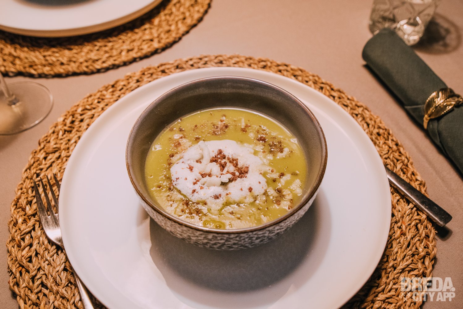 Vanavond proeven we het complete menu en om het af te maken ook nog een dessert. Het complete menu bestaat uit Zuydkroepoek, brood, een voorgerecht, een tussengerecht een hoofdgerecht én friandises. Optioneel kan je hier nog een dessert aan toevoegen. We starten ons diner met de Zuydkroepoek met daarbij pompoendip. Heerlijk!