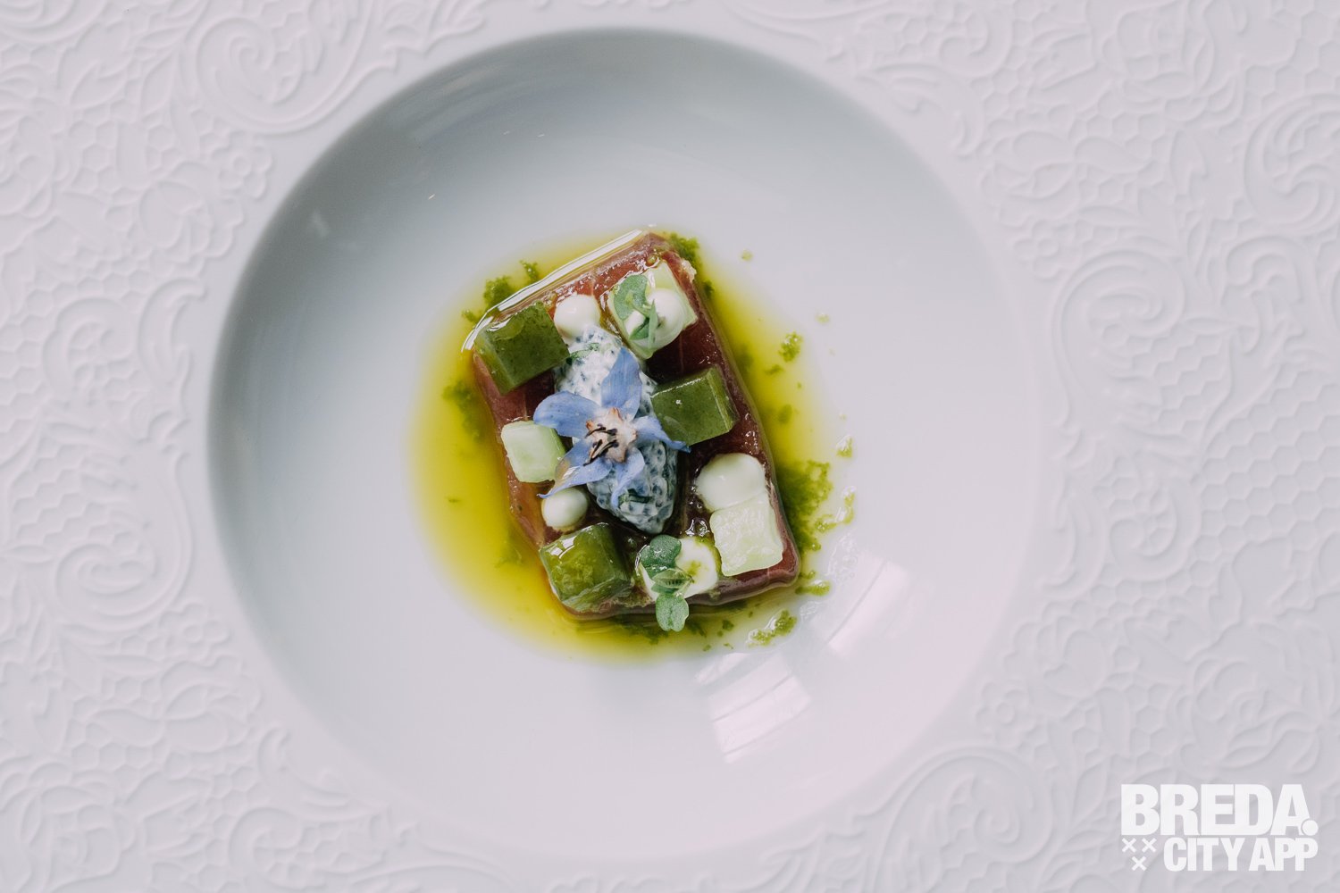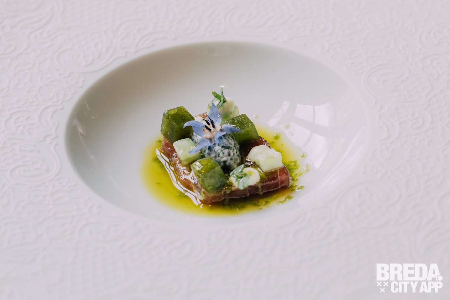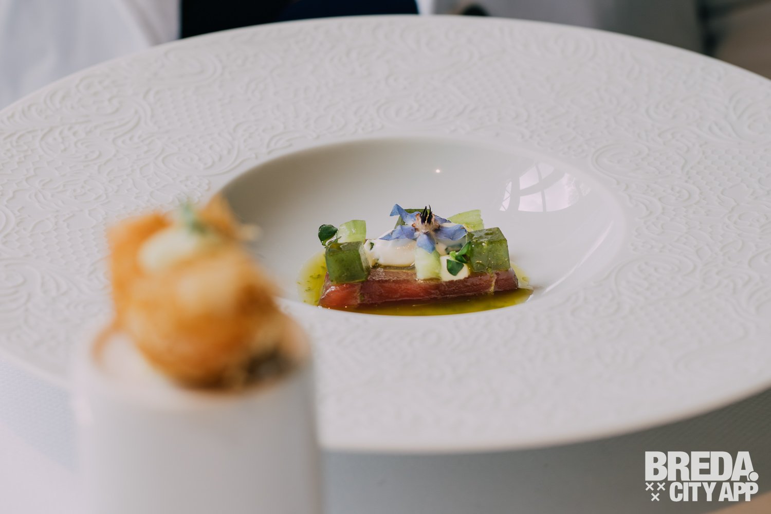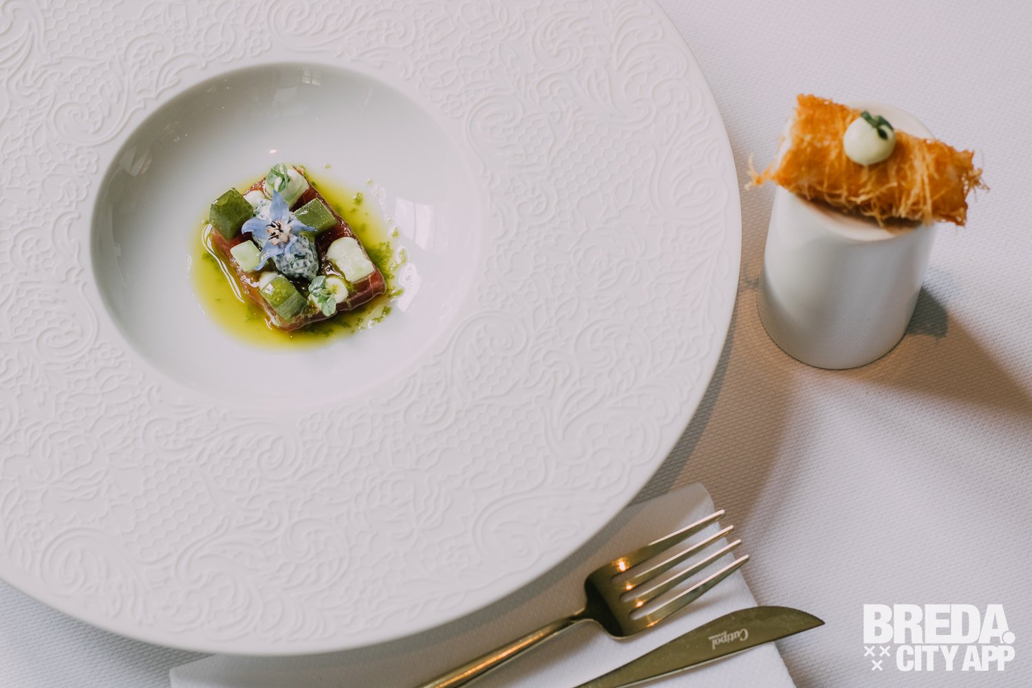 De eerste gang, de Langoustine ingerold met Kataifi deeg en Balfegó tonijn, vertelt een verhaal van duurzaamheid en eerlijke producten die Wolfslaar gebruikt. Ik krijg een Sauvignon Blanc van Weingut Tement uit Oostenrijk uitgeschonken en mijn moeder een Vermentino di Sardegna van Antonella Corda. De verfijning op het bord in combinatie met de wijn laat dat gevoel uitgesproken terugkomen in de mond.