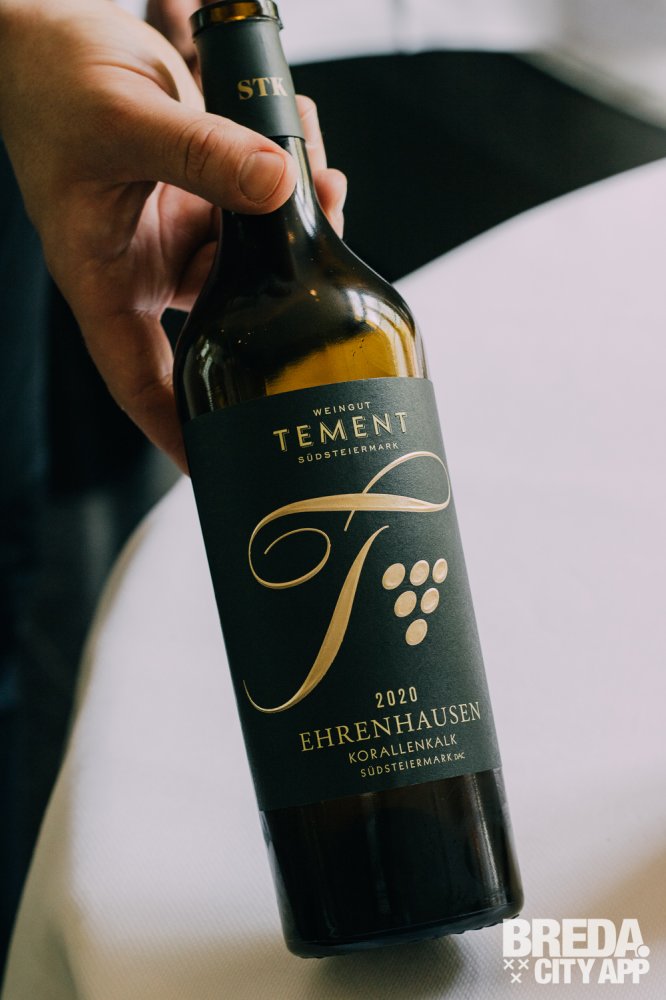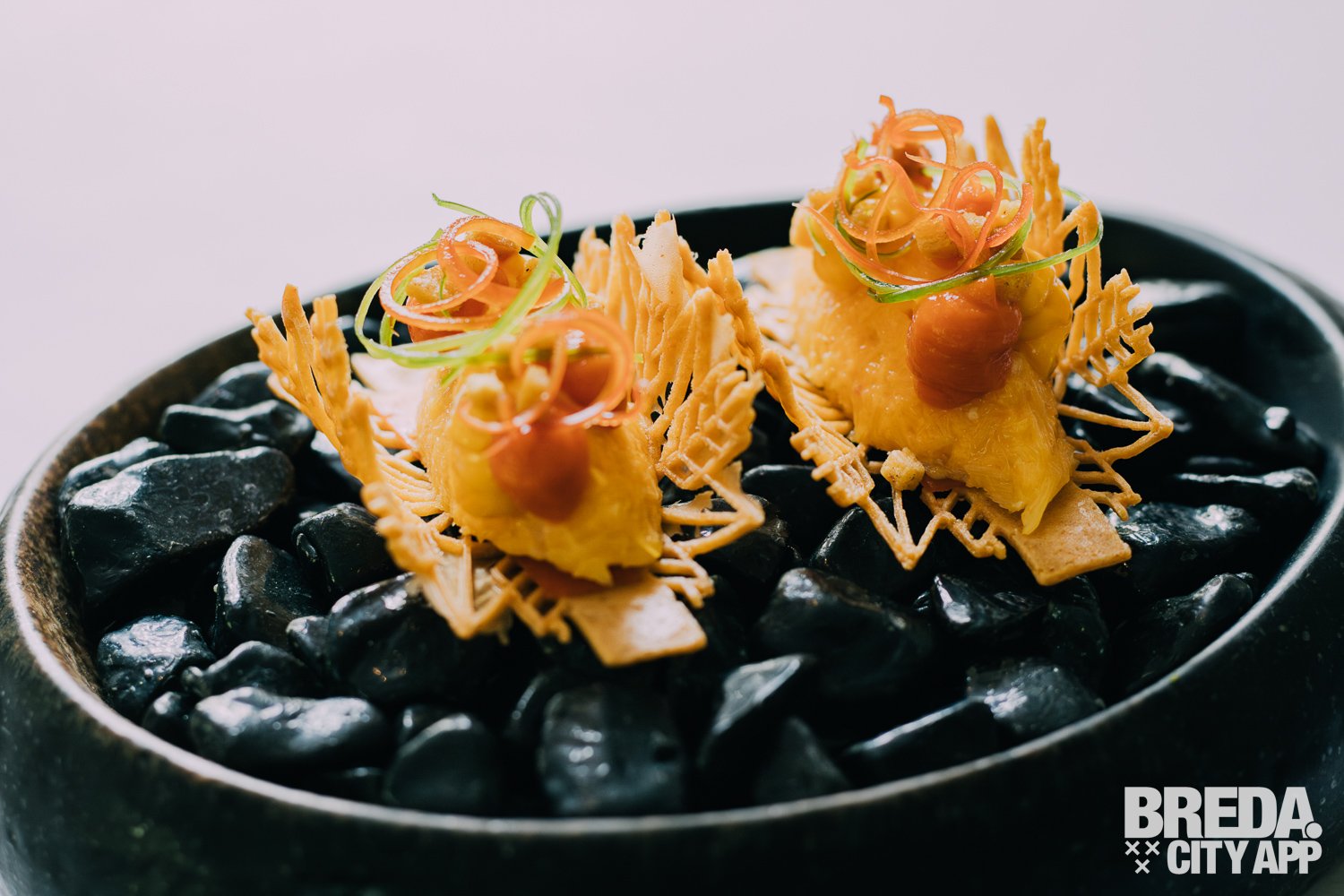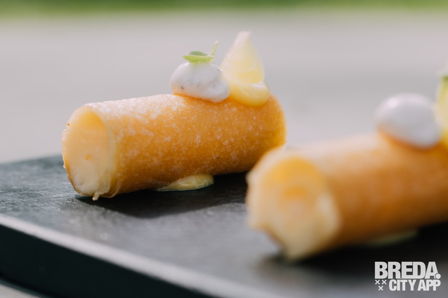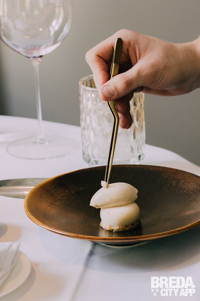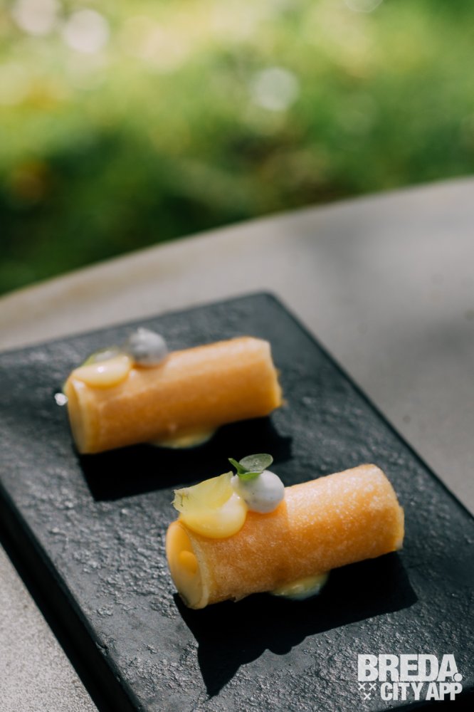 De eerste gang, de Langoustine ingerold met Kataifi deeg en Balfegó tonijn, vertelt een verhaal van duurzaamheid en eerlijke producten die Wolfslaar gebruikt. Ik krijg een Sauvignon Blanc van Weingut Tement uit Oostenrijk uitgeschonken en mijn moeder een Vermentino di Sardegna van Antonella Corda. De verfijning op het bord in combinatie met de wijn laat dat gevoel uitgesproken terugkomen in de mond.