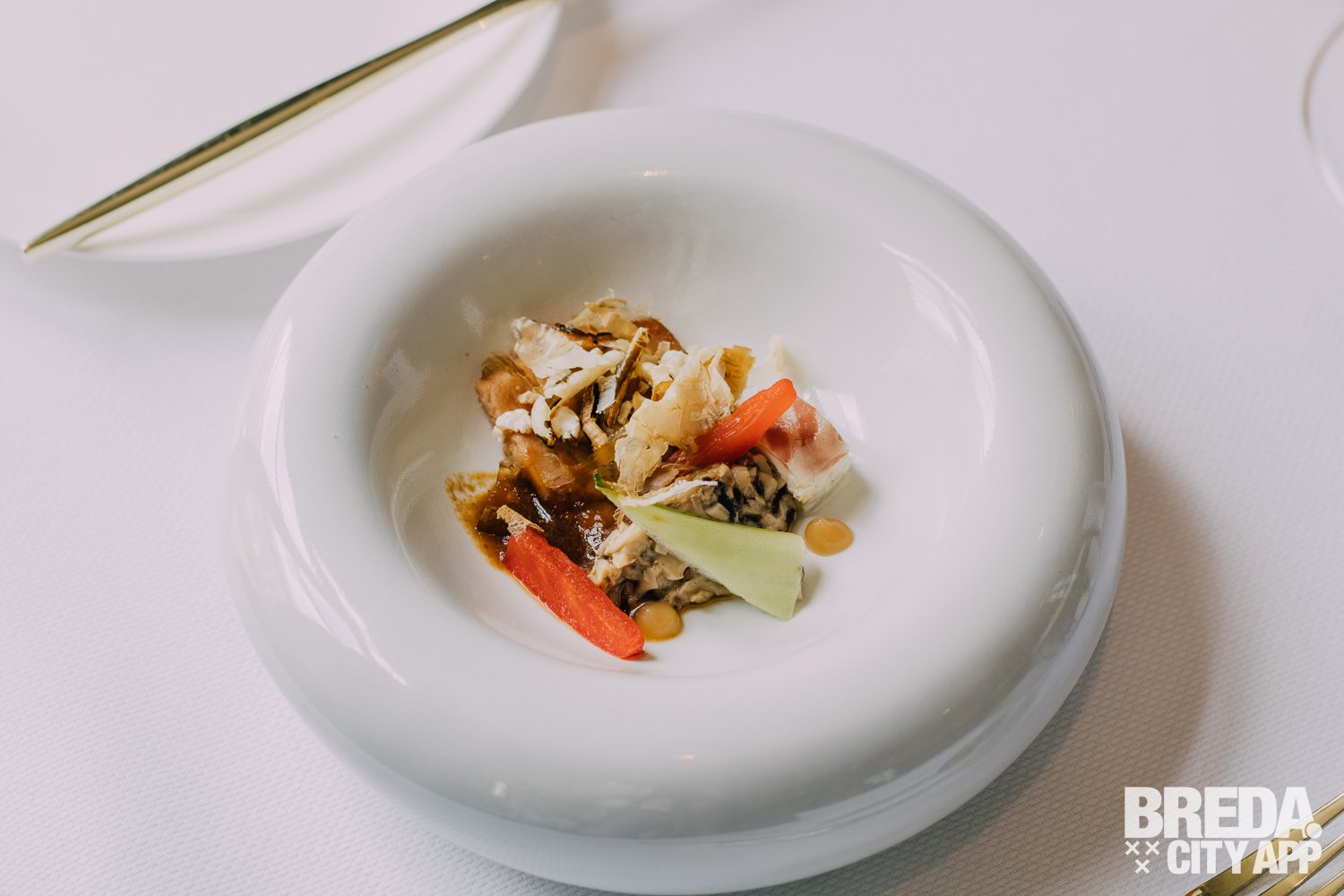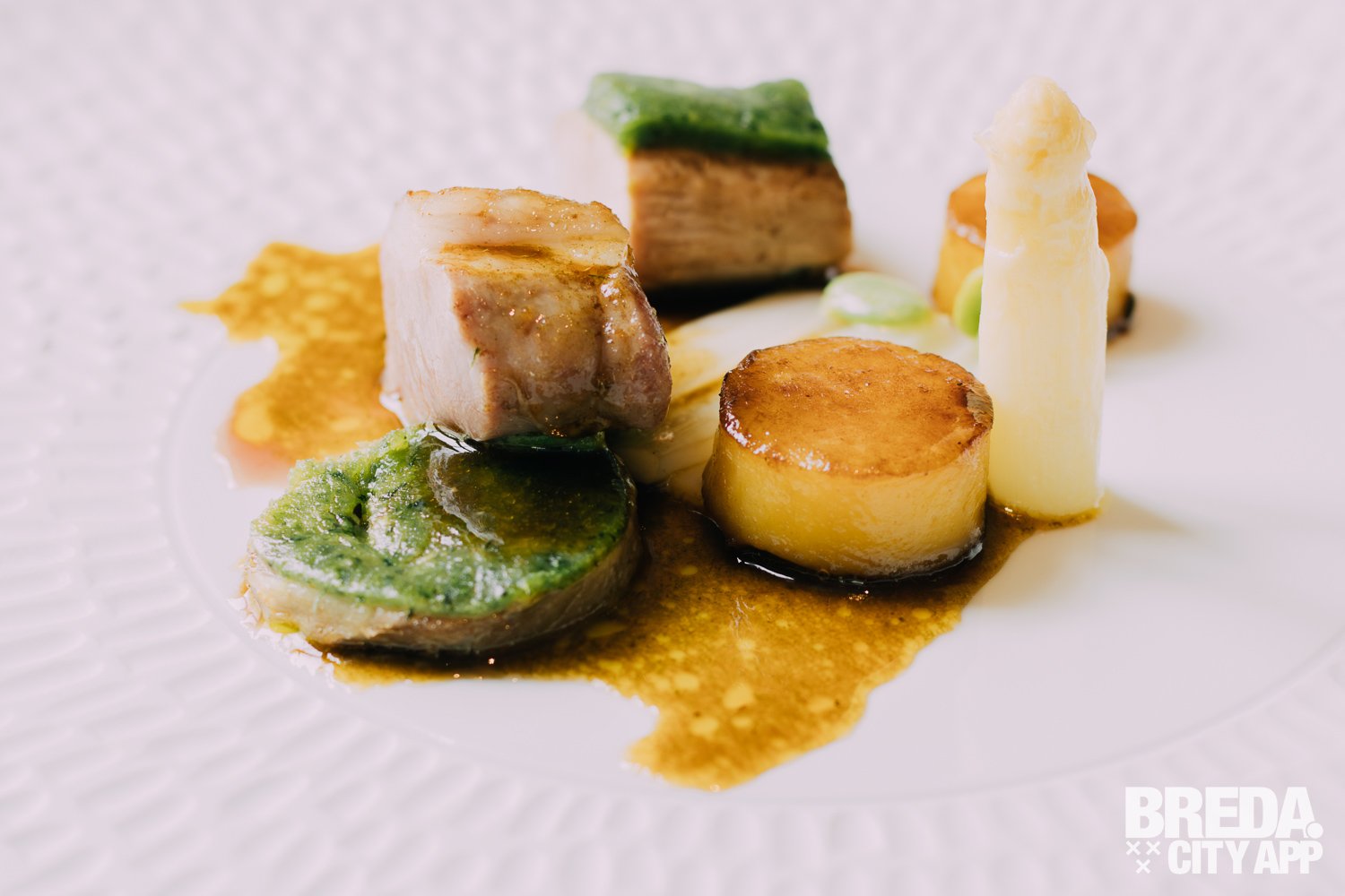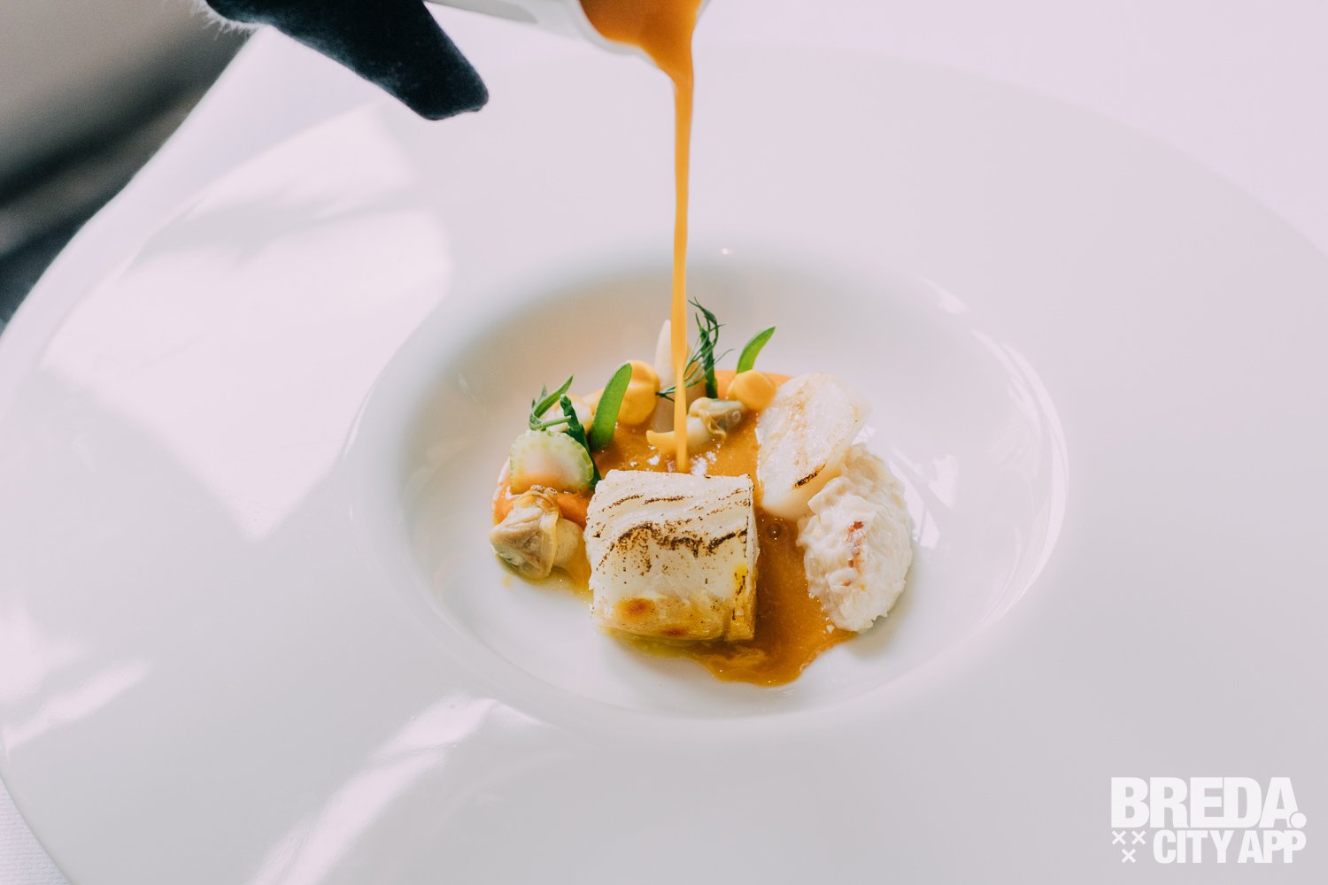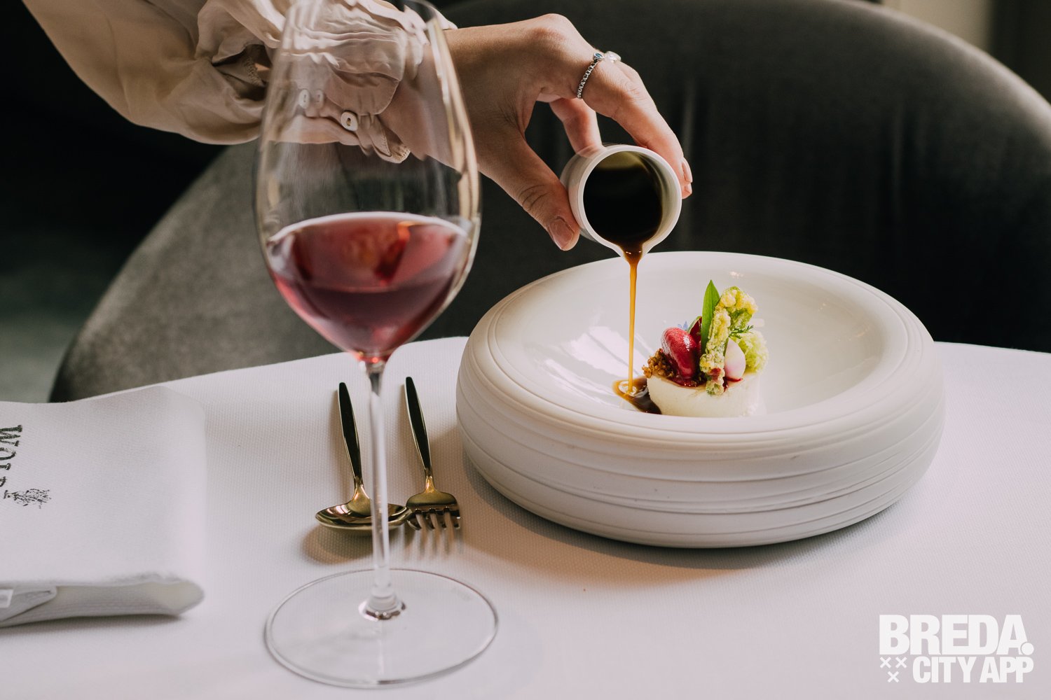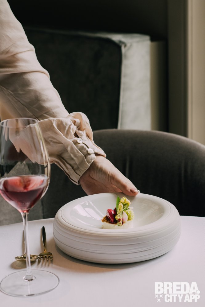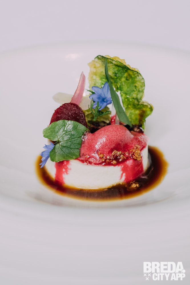 De tweede gang is een kleurrijk gerecht met rode biet, sjalotmousse en een saus van miso en sjalot. De kruiden komen rechtstreeks uit de Wolfslaar Moestuin. Dit gerecht wordt begeleid door een Wilde Rosé van Wijngaard Dassemus uit Chaam.
