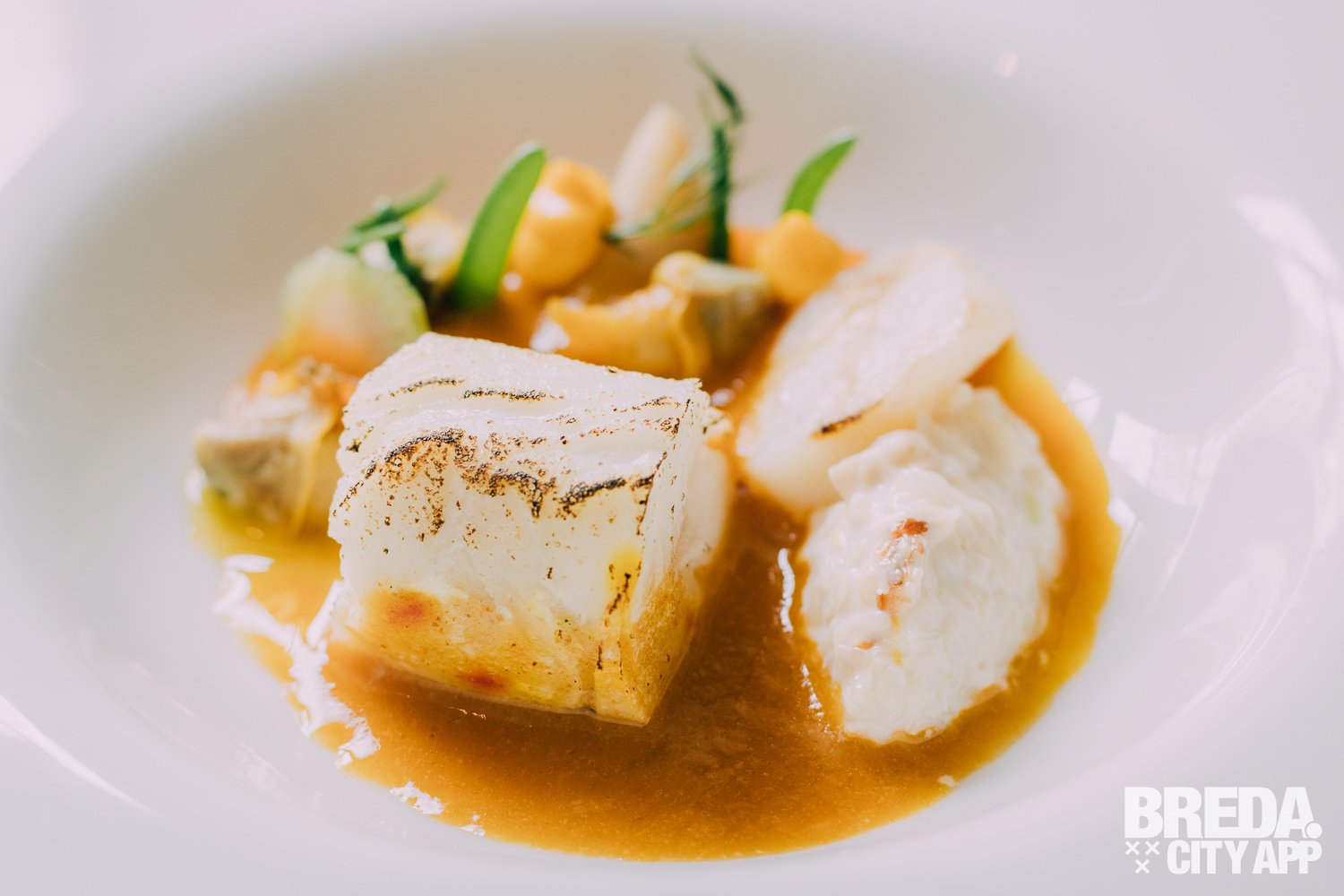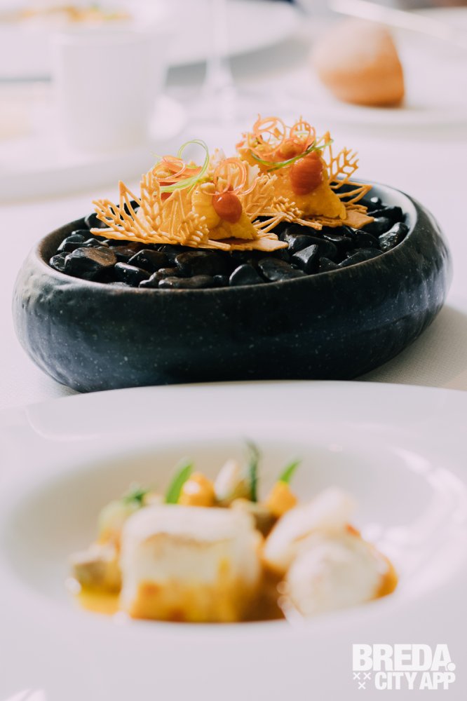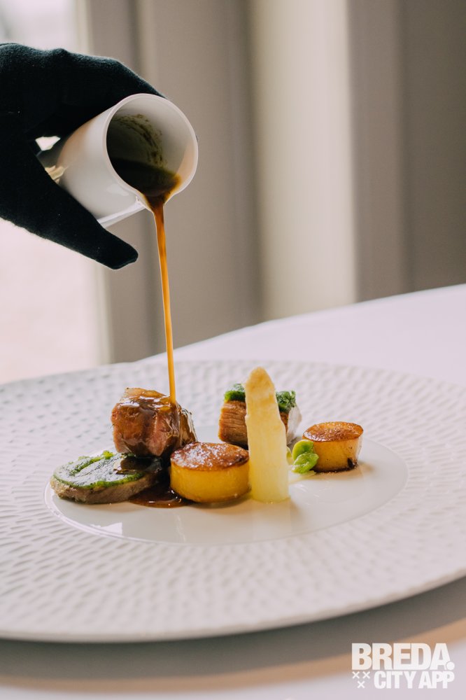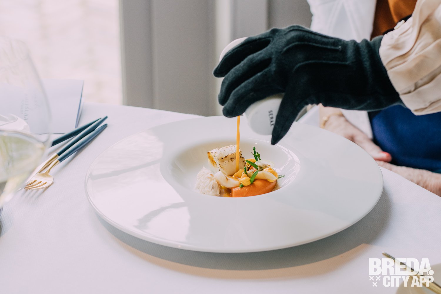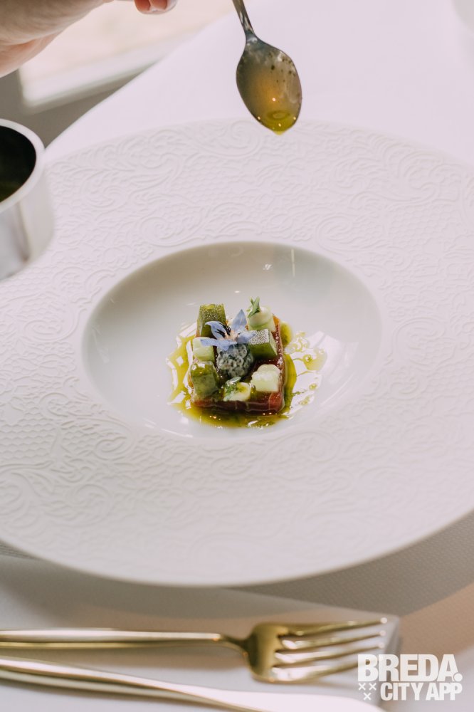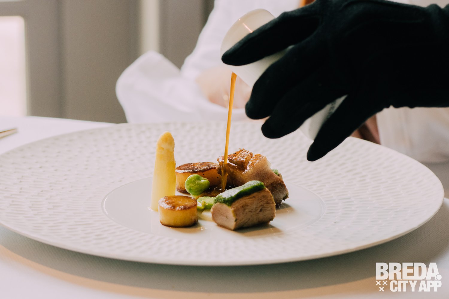 De tweede gang is een kleurrijk gerecht met rode biet, sjalotmousse en een saus van miso en sjalot. De kruiden komen rechtstreeks uit de Wolfslaar Moestuin. Dit gerecht wordt begeleid door een Wilde Rosé van Wijngaard Dassemus uit Chaam.