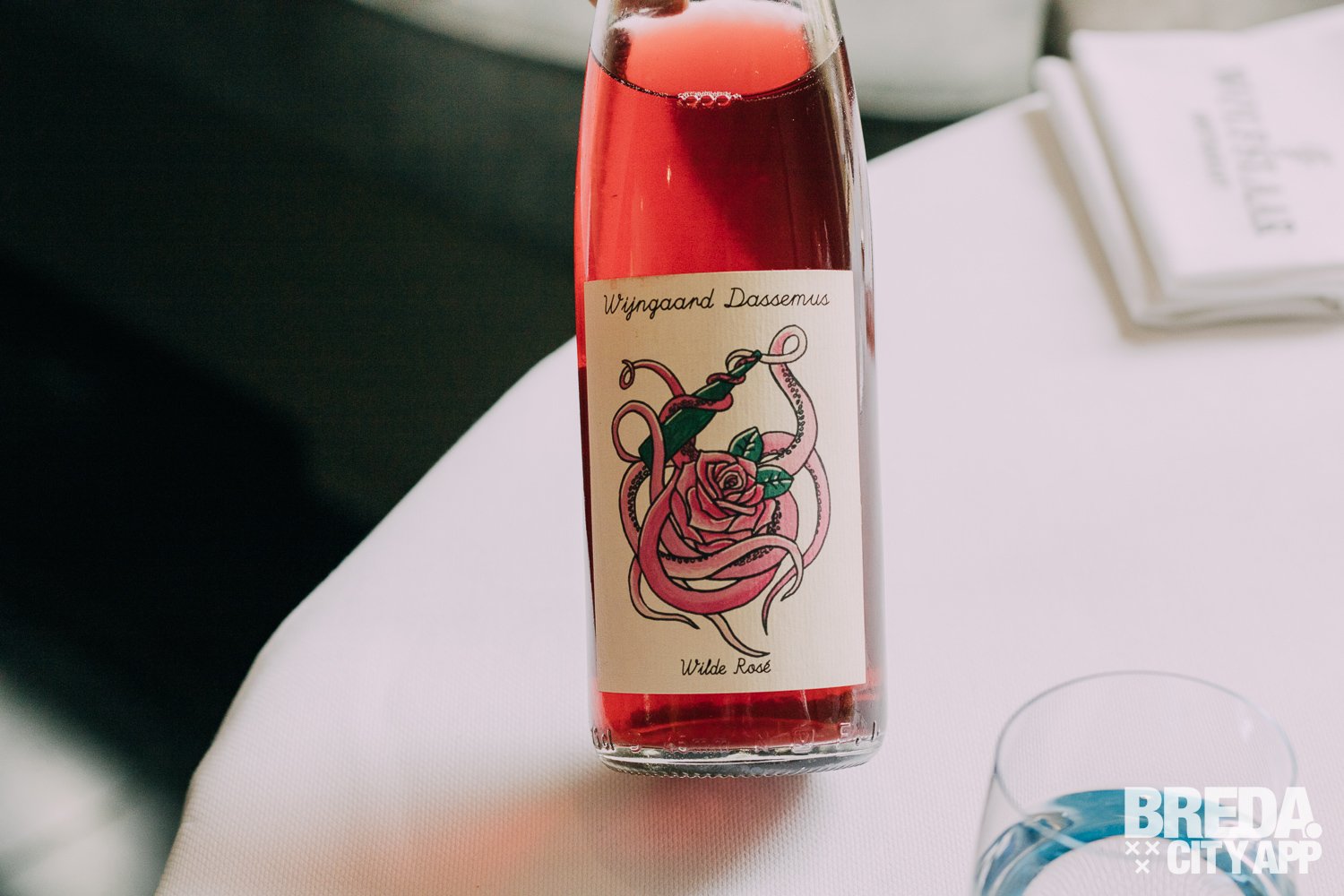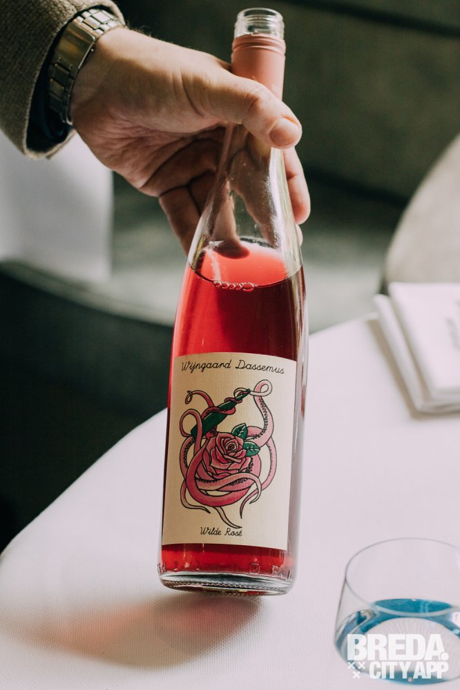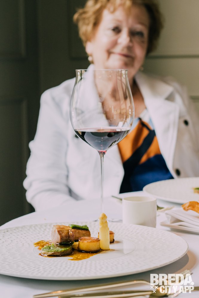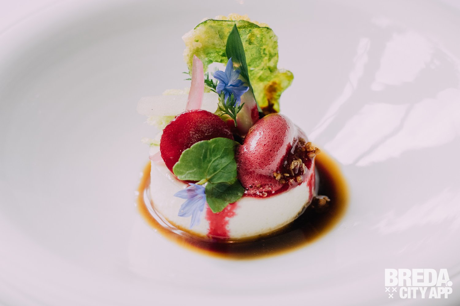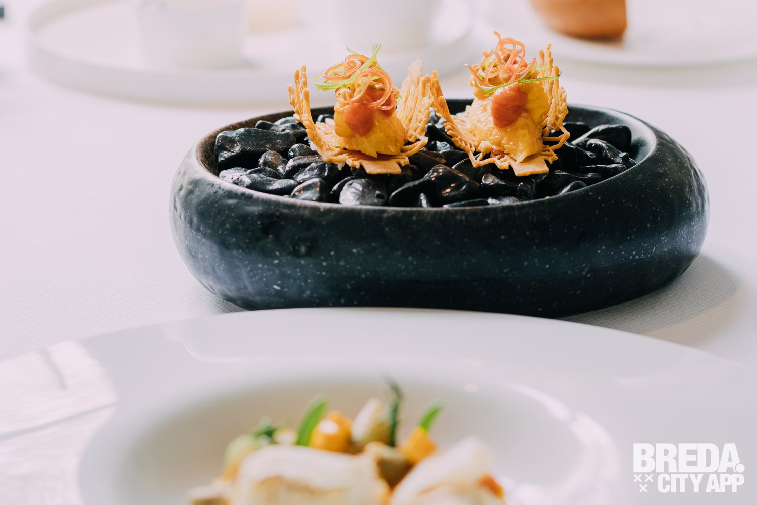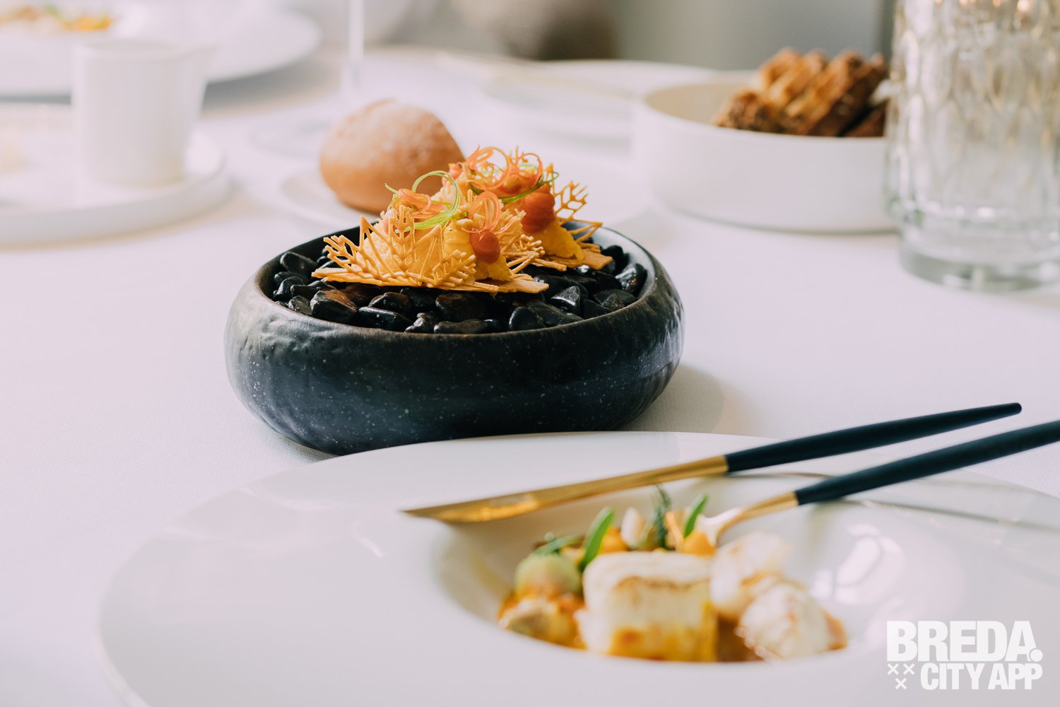 De tweede gang is een kleurrijk gerecht met rode biet, sjalotmousse en een saus van miso en sjalot. De kruiden komen rechtstreeks uit de Wolfslaar Moestuin. Dit gerecht wordt begeleid door een Wilde Rosé van Wijngaard Dassemus uit Chaam.