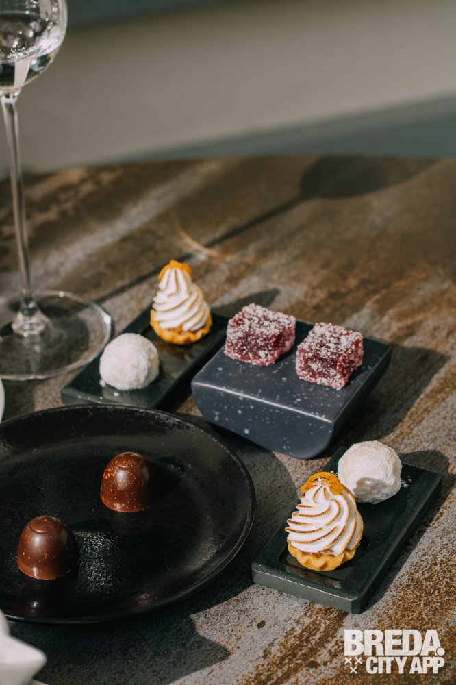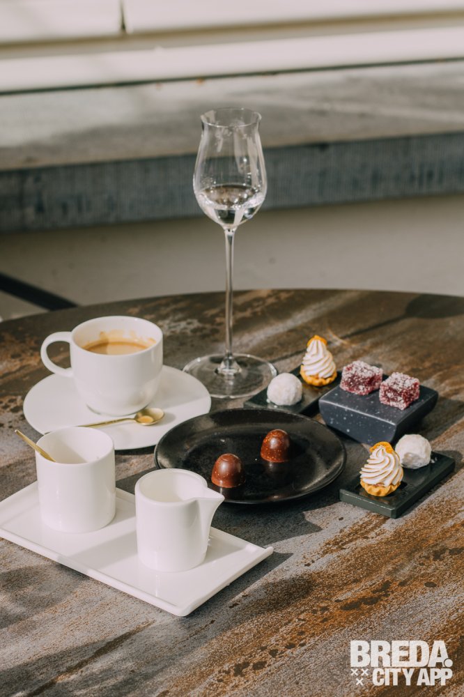 Ricks laatste briljante idee brengt ons terug naar het terras, waar we genieten van een kopje koffie en heerlijke friandises. Met een bonbon van rauwe cacao, een tartellette met wit gebrand schuim en een witte chocolade truffel met citroenblad sluiten we de middag in stijl af.