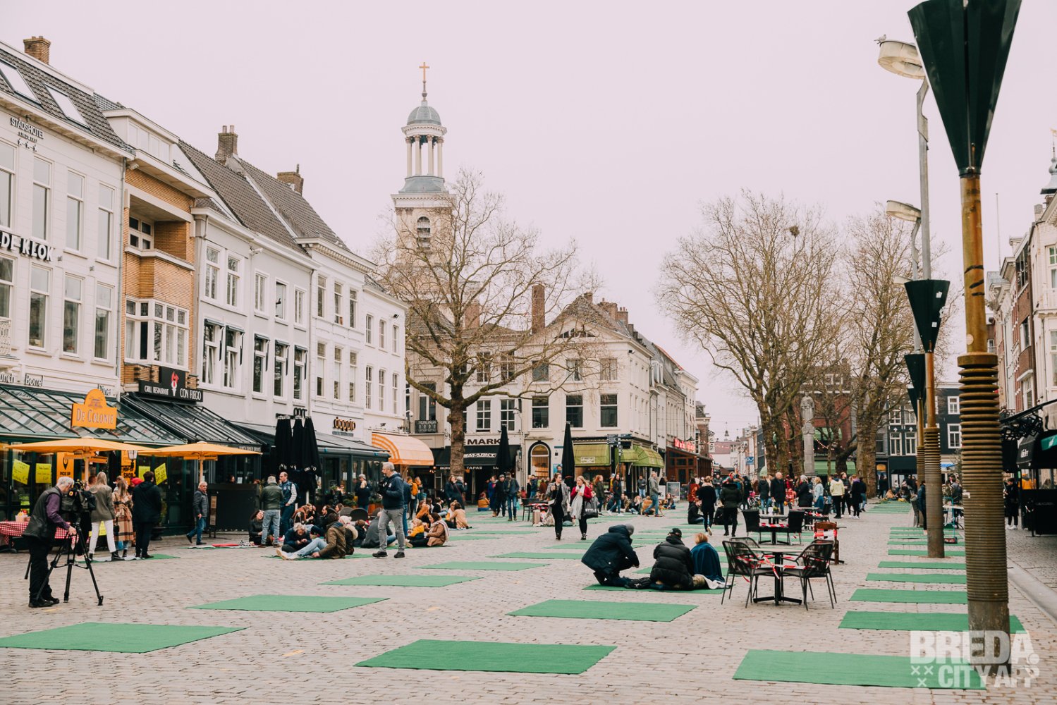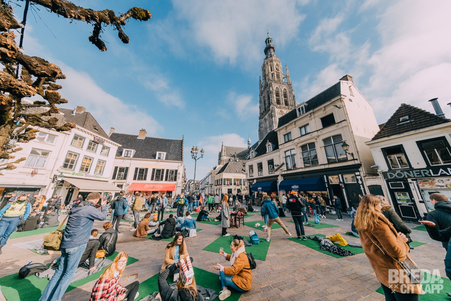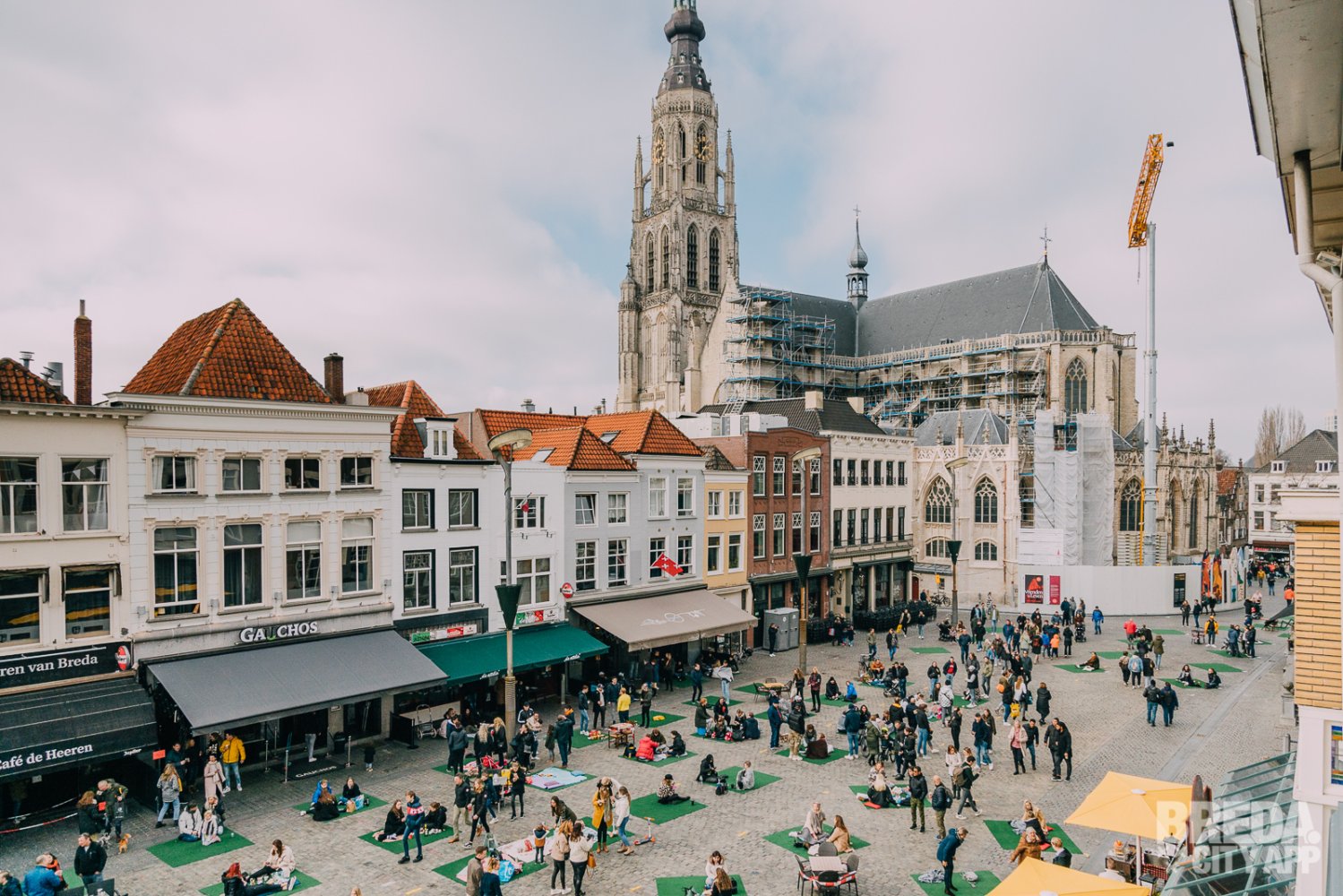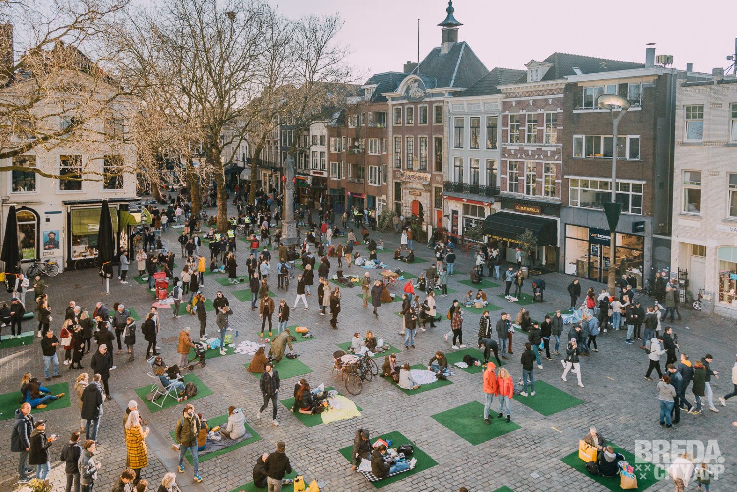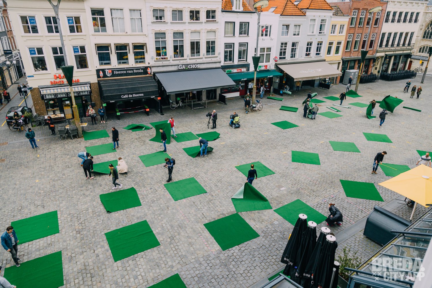 Ruim 2.000 vierkante meter kunstgras veranderden het centrum van Breda vandaag in het grootste stadspark van Nederland. Mensen konden gezellig op o.a. de Grote Markt, Havermarkt, Haven, het Ginneken en de Haagsemarkt gaan picknicken. Deze ludieke protestactie werd gedragen door ruim 60 horeca-ondernemers. Bekijk hier de lifestream, welke ruim een half miljoen mensen bereikte.