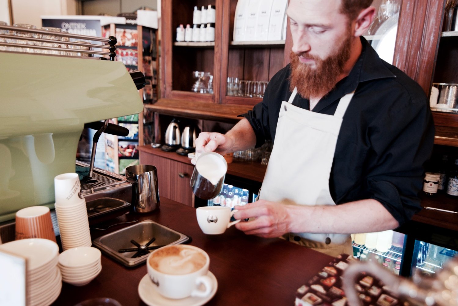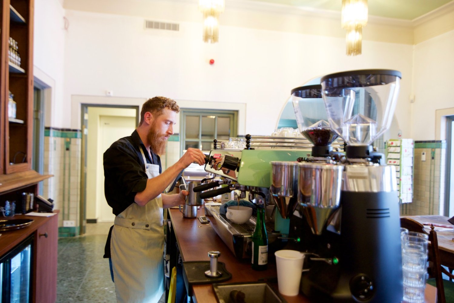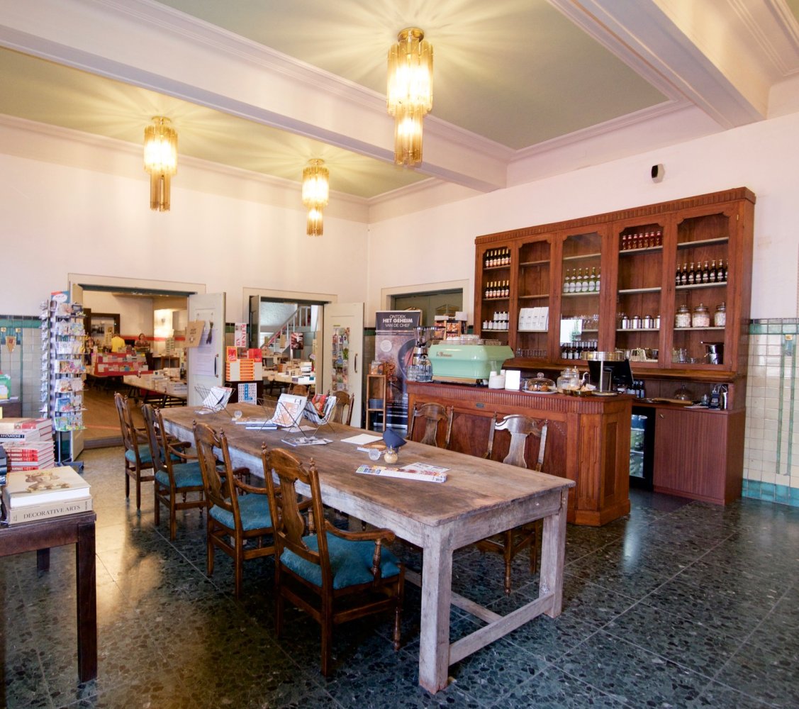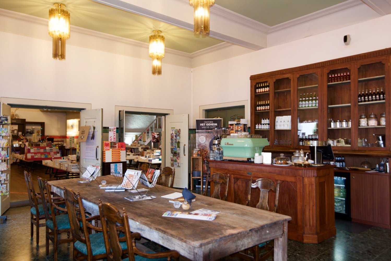 De koffiebar is gevestigd in de prachtige entreehal van het pand en is ingericht met antiek houten meubels. De zaak doet echter niet oubollig aan, integendeel zelfs! De koffiebar heeft een stoere en hippe uitstraling, net als het personeel achter de bar.