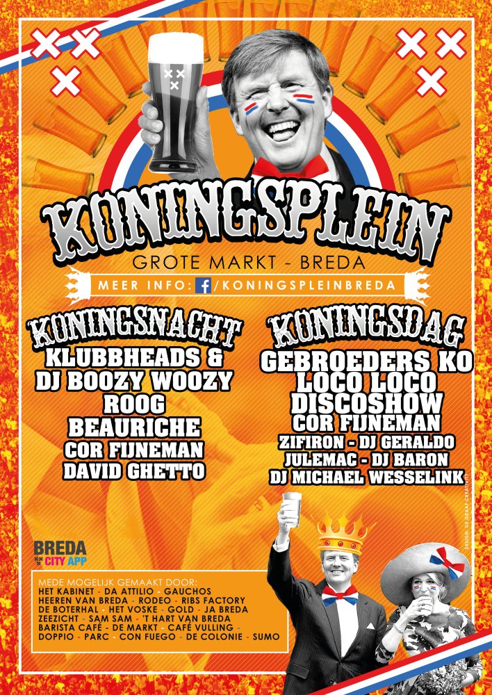 Dit jaar werkt de horeca om de Grote Markt midden en zuid weer samen om er een groot feestje van te maken. De Grote Markt wordt omgetoverd tot Koningsplein met 2 podia en 4 grote barren central over het plein verspreid. Entrée is gratis en voor iedereen toegankelijk.