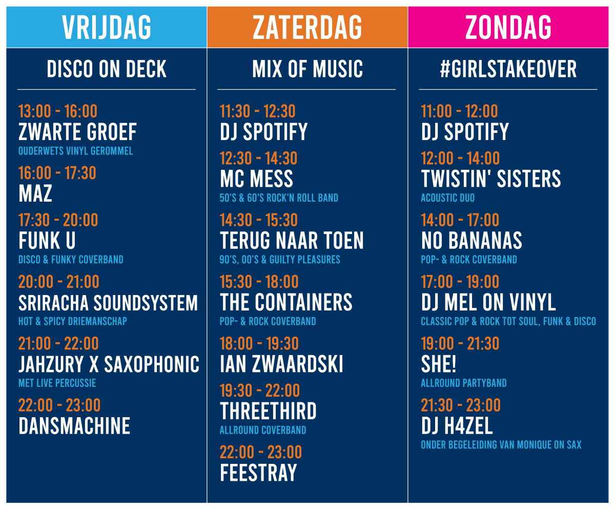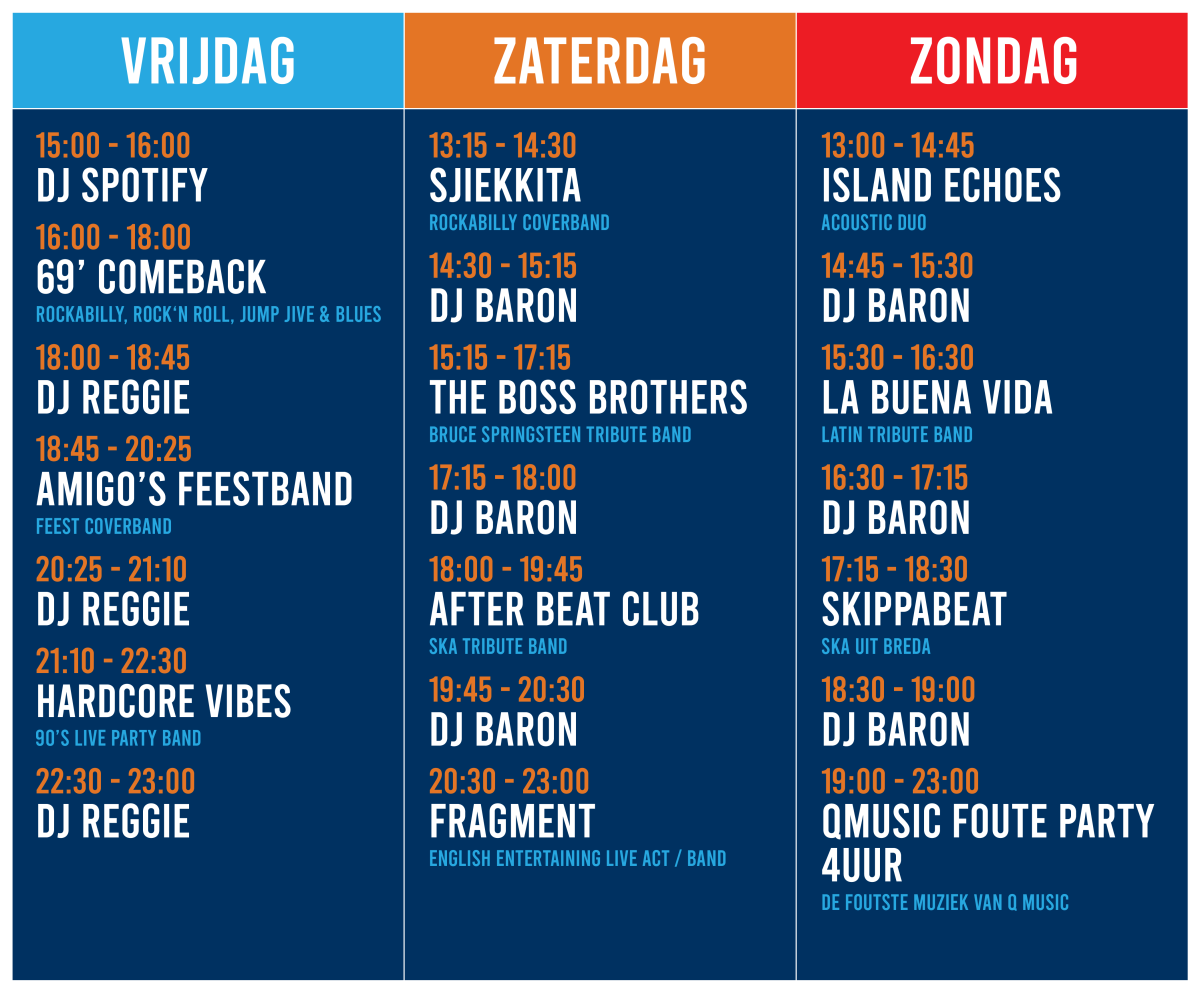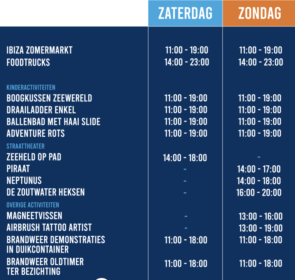 Het programma bestaat uit een Ibiza zomermarkt en vijf verschillende podia met meer dan 25 live acts. Ook lopen er verschillende straatartiesten rond en kun je op zondag magneetvissen. De kinderen kunnen spelen op luchtkussens, in de ballenbak of een airbrush tattoo laten zetten. Ook voor de innerlijke mens wordt gezorgd met 11 verschillende foodtrucks en de omliggende horeca.