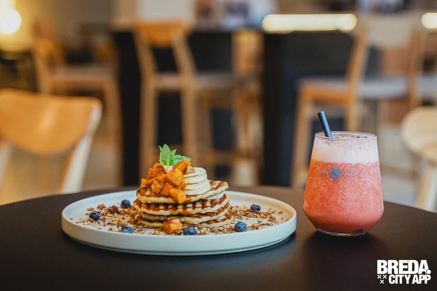 Omdat het gezellige herfstseizoen is begonnen, heeft Jack & Jacky's heerlijke herfstspecials bedacht. Zo kun je buiten de menukaart een rijkgevulde salade niçoise bestellen met diverse groenten en de welbekende verse tonijnmousse. Maar ook een herfstige smoothiebowl met amandeldrink, banaan, kiwi en verschillende superfoods staat op de specials-kaart. Wij besluiten ons zelf extra te trakteren vandaag en gaan voor een mango smoothiebowl van de reguliere menukaart én een herfstspecial: de pancakes. Een uitermate goede keuze, want zo hebben we het beste van beide werelden te pakken. Yummmm! Tip! Vraag naar de herfstspecials in de zaak en probeer ook een nieuw gerecht!