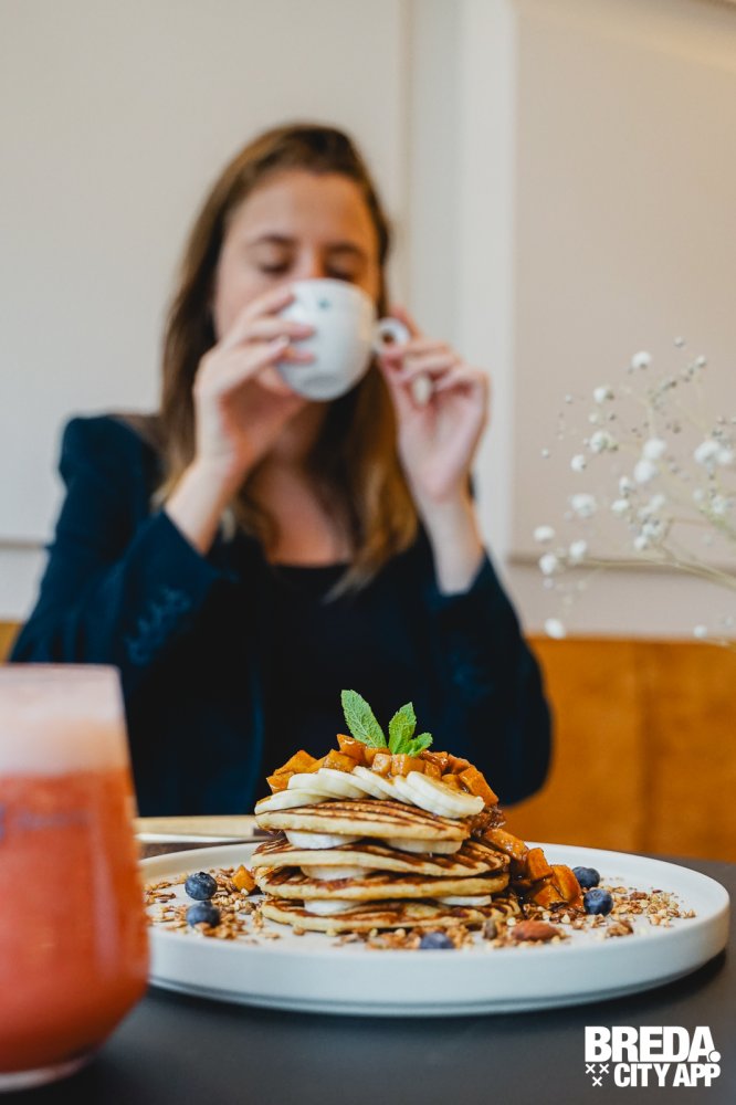 De pancakes worden geserveerd als een rijke stapel warme pannenkoekjes, met daarop gekaramelliseerde kaneelappeltjes, granola, blauwe bessen, banaan, agavesiroop, afgetopt met een takje munt. En daar kunnen we heel kort over zijn: onwijs lekker!!! We krijgen meteen de herfstkriebels te pakken, en dit gerecht past perfect bij een warm kopje koffie of thee. Voor de frisse nasmaak nemen we een slokje van onze energizer juice, en voor ons is dit ontbijt meteen compleet. Perfect voor de koudere dagen!