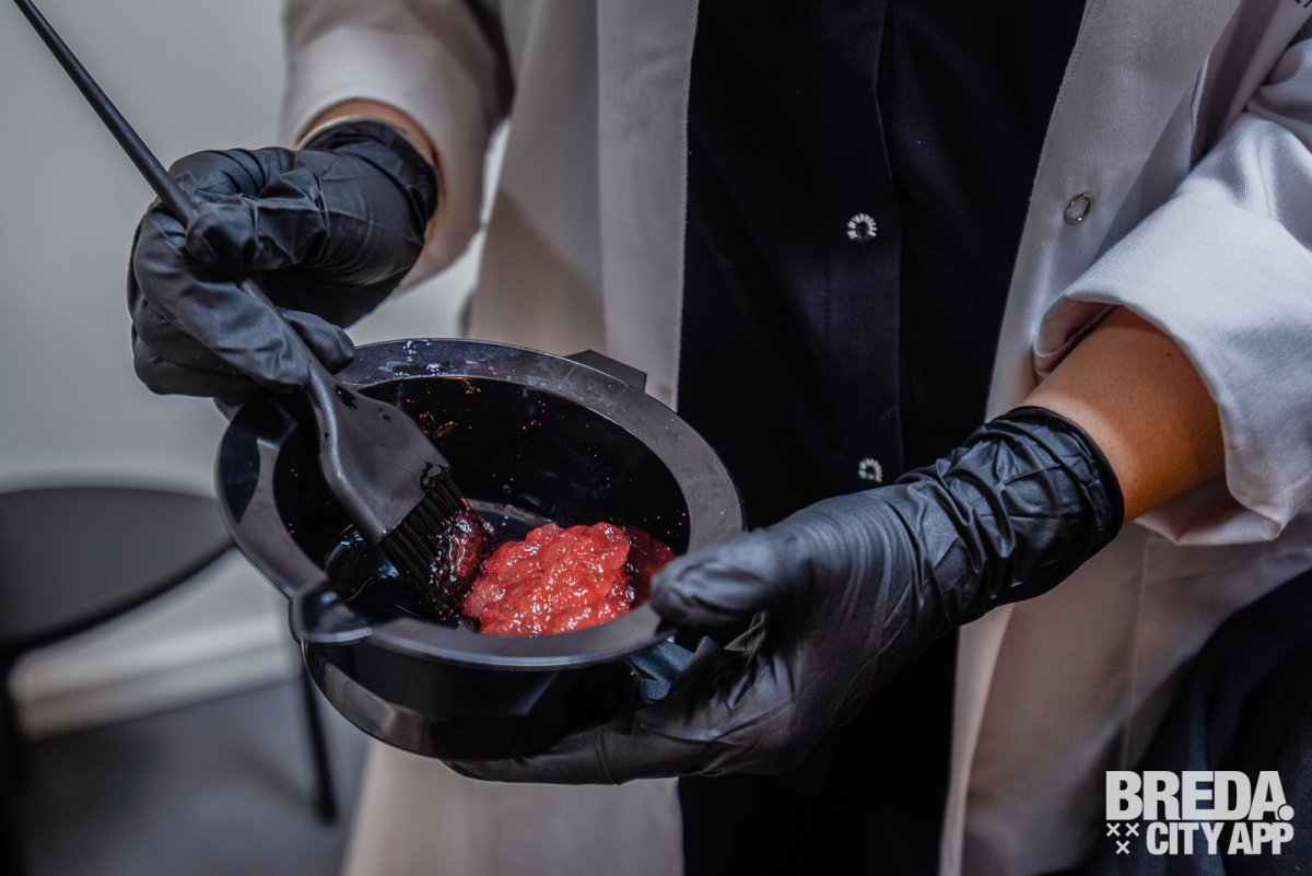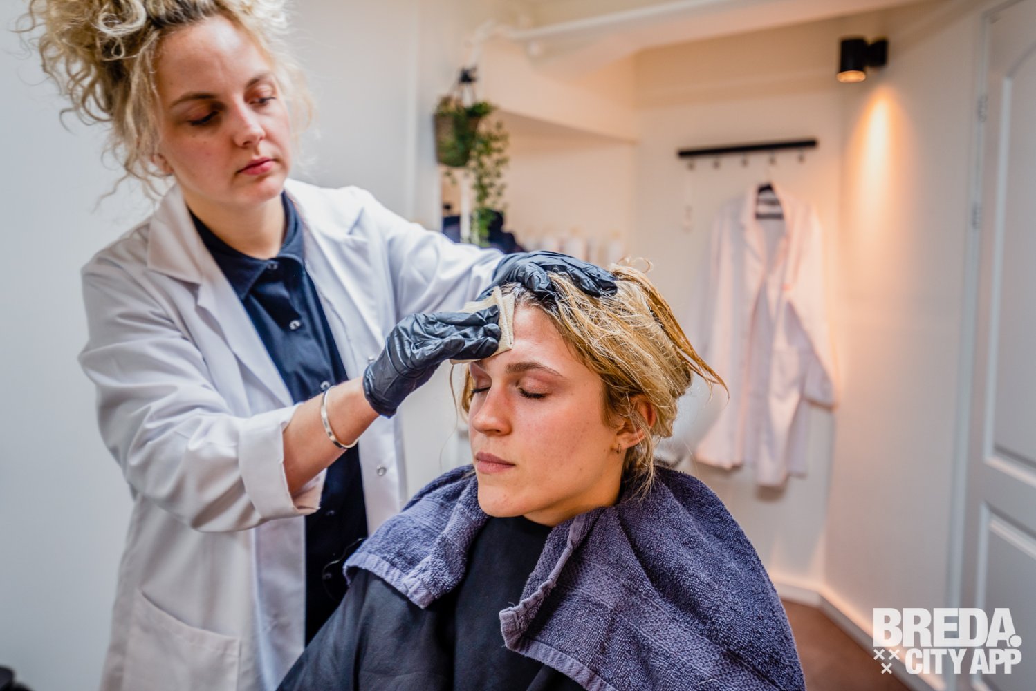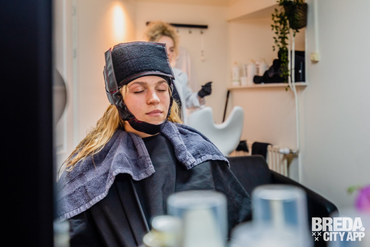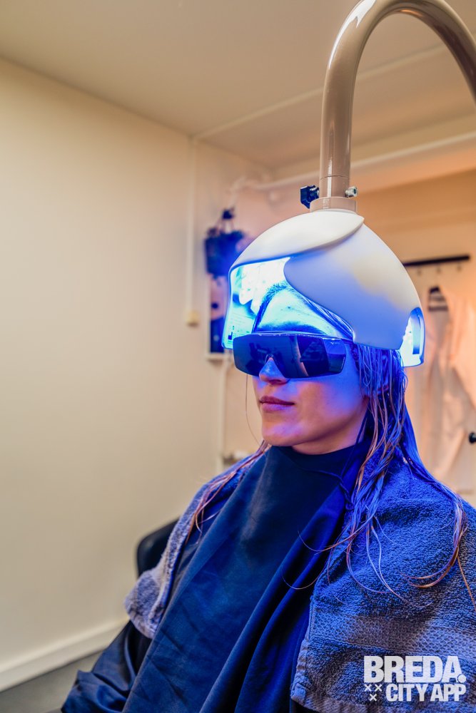 Hierna kan de behandeling beginnen. Er wordt een relaxt muziekje aangezet en een kaarsje aangestoken. De behandeling begon met een grondige reiniging van mijn hoofdhuid met een CRLAB-scrub die is ontworpen om mijn haarzakjes te voeden. Toen ging daar een stoom-/ozonkap overheen om de hoofdhuid week te maken en de poriën te openen. Dit duurde zo’n 10 minuten. Vervolgens ging er een massageband om mijn hoofd om de bloedsomloop te stimuleren en de hoofdhuid los te maken. Ook dit duurde 10 minuten. Een erg apart gevoel in het begin, maar dit gevoel gaat over in volledige ontspanning.