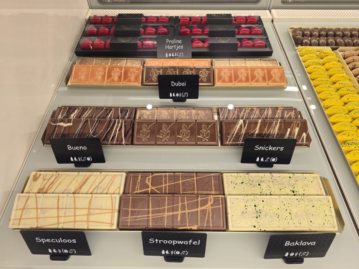 De bonbons zijn verkrijgbaar in stijlvolle doosjes met 8, 15 of 24 stuks voor fijne prijzen. Ook maatwerk is mogelijk. Denk aan chocoladeletters met zelfgekozen vulling – vrijwel alles wat in de bonbons zit, kan ook in een letter worden verwerkt. Daarnaast vind je bij Bon Appetit een luxe assortiment notenchocolade, oud-Hollandse chocoladesnoepjes en seizoensproducten rond Pasen, Sinterklaas en Kerst. Liefhebbers van iets bijzonders kunnen bovendien kiezen uit zeven verschillende 100-grams repen in smaken als baklava, kinder bueno, stroopwafel en Dubai. Deze luxe repen kosten € 9,95 per stuk en zijn perfect als cadeau of verwen moment.