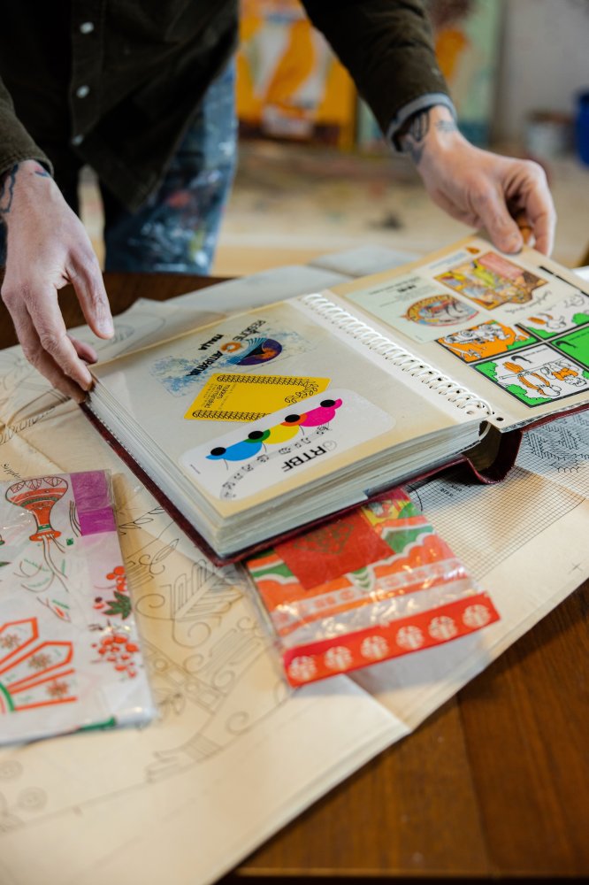 In de ruimte vind je veel tekeningen, schetsen en boeken. “Van kinds af aan had ik al een redelijke verzamelwoede, vooral plaatjes. Voor sommigen is dat prullaria maar ik vind het prachtig”, zegt Rutger. De plaatjes vindt en koopt hij op allerlei plekken. Zijn show in de Gallery is voor een groot gedeelte geïnspireerd op oude reclames en afbeeldingen uit Breda.
