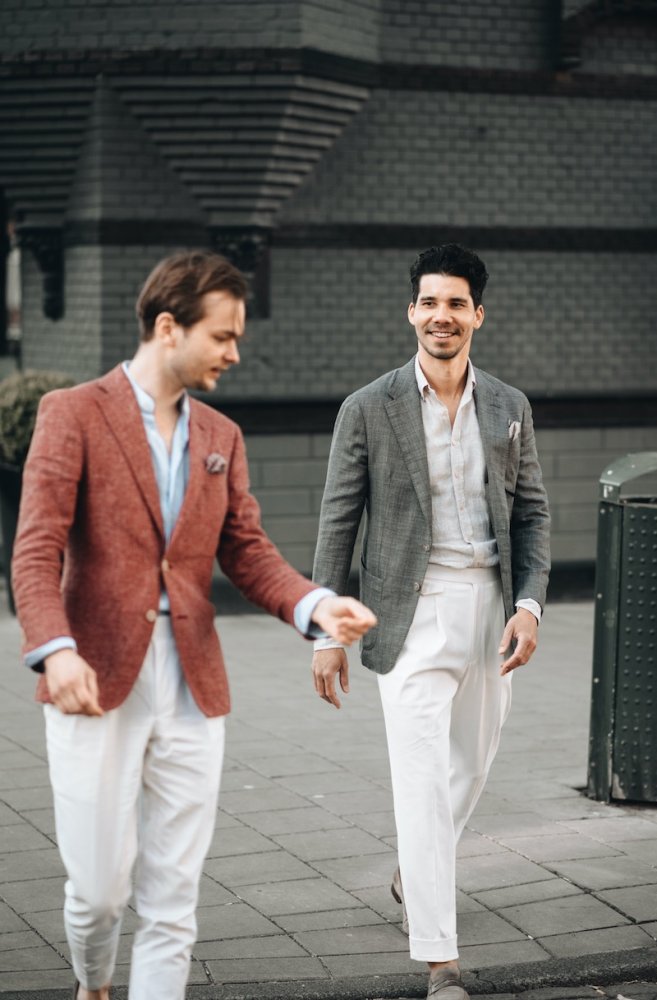 "Natuurlijk zien wij de verschuiving ook, maar het zijn juist de maatwerk items die het mogelijk maken om op elegante wijze je garderobe casual te dragen. Wij zijn bijvoorbeeld helemaal fan van de pantalon met bandplooi en lossere fit die we steeds meer zien. Zeker bij een lossere fit is het belangrijk dat het geen hobbezak wordt en dat het nog steeds jouw sterke kanten naar voren haalt. Eigenlijk zijn alle onderdelen van een maatpak ook casual te dragen, mits deze de juiste pasvorm hebben. Maatwerk maakt het mogelijk een casual outfit te dragen, die lekker zit met de juiste hoogwaardige uitstraling. Je kunt net als iedereen een jeans aantrekken met een shirtje, maar om je te blijven onderscheiden pak je dit net iets anders aan."