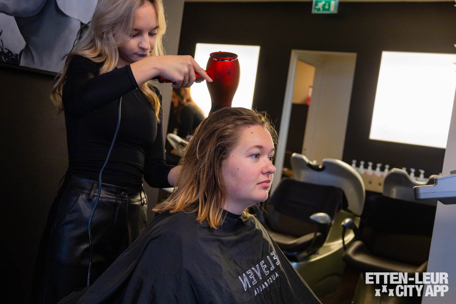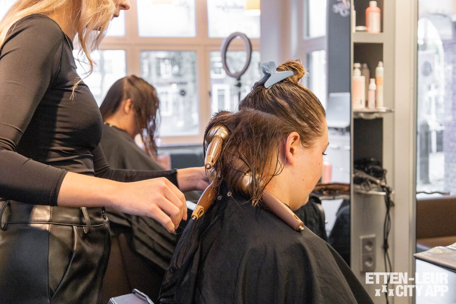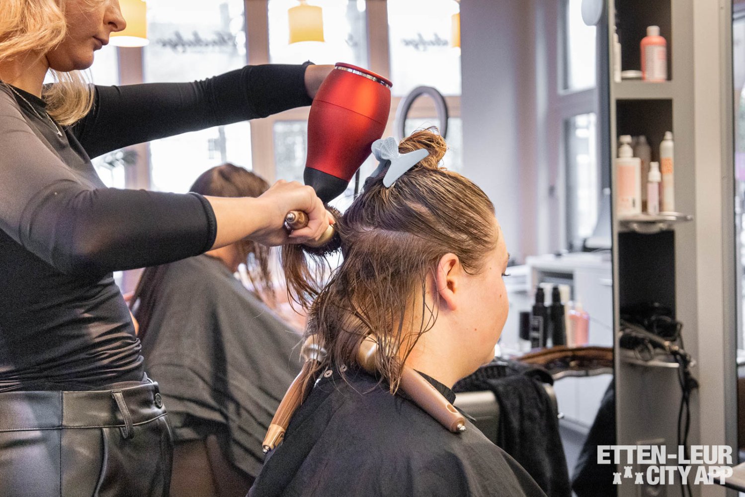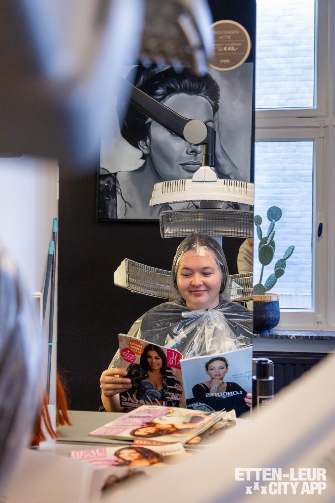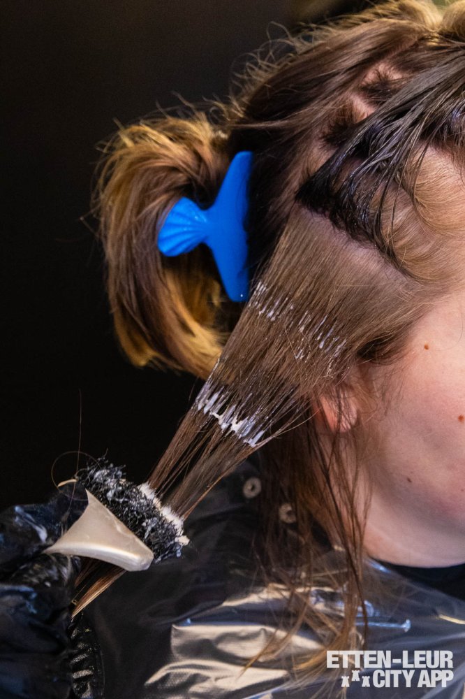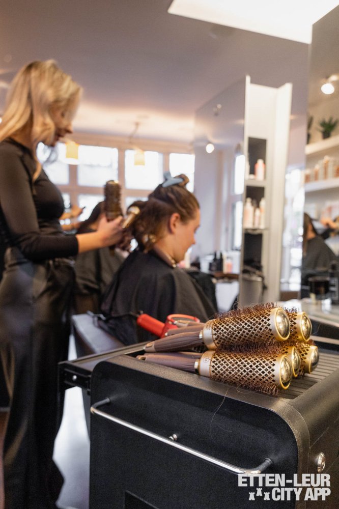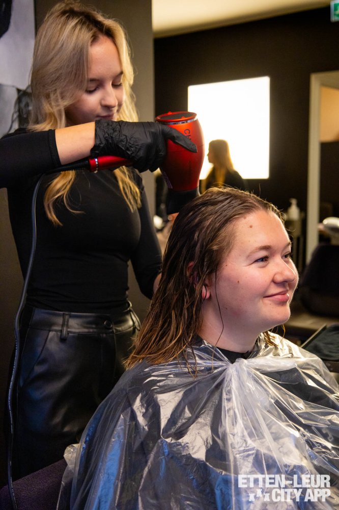Met behulp van dikke ronde borstels wordt het haar geföhnd. Dit proces kan enige tijd in beslag nemen, vooral bij dik haar, maar de styliste zorgt ervoor dat het haar grondig wordt gedroogd en neemt hier ook voldoende tijd voor.