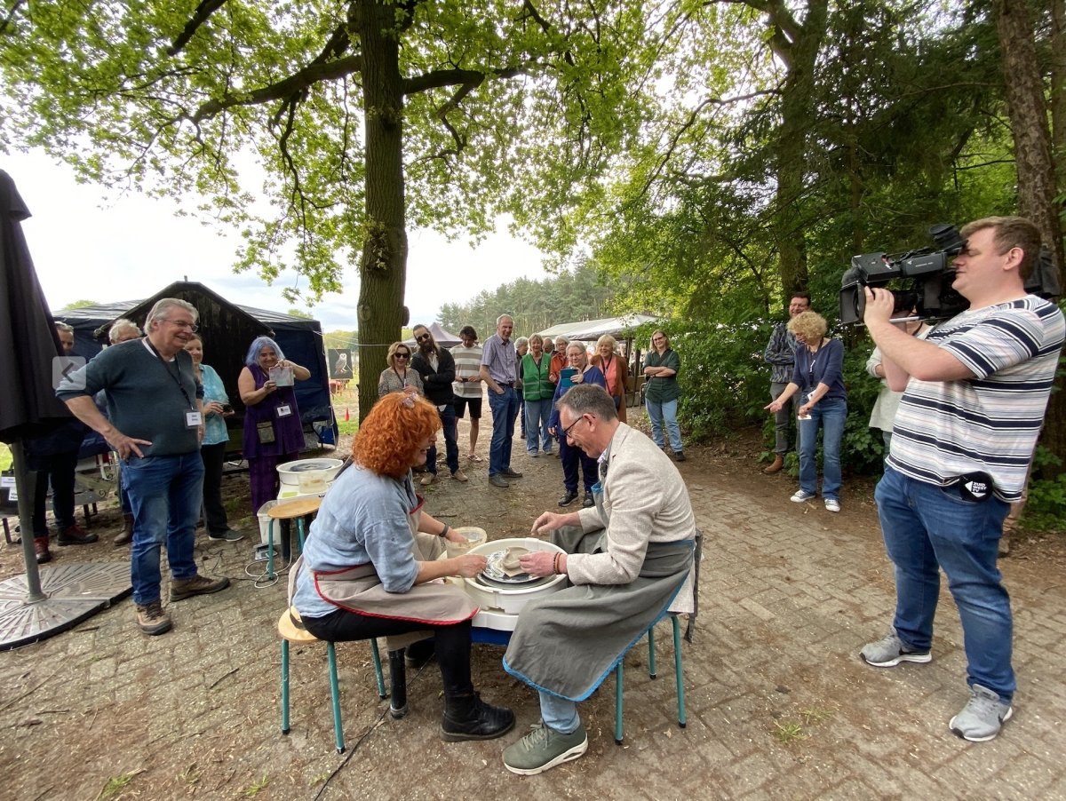 De creamarkt werd afgewisseld met demonstraties van pottenbakken, schilderen, raku stoken, kantklossen en sieraden maken. Bij een aantal deelnemers konden bezoekers ook zelf een poging wagen; vooral het pottenbakken op de draaischijf bij Monique had grote belangstelling. Zelfs de wethouder van cultuur deed een poging om een potje te draaien……dat bleek toch lastiger dan verwacht.
