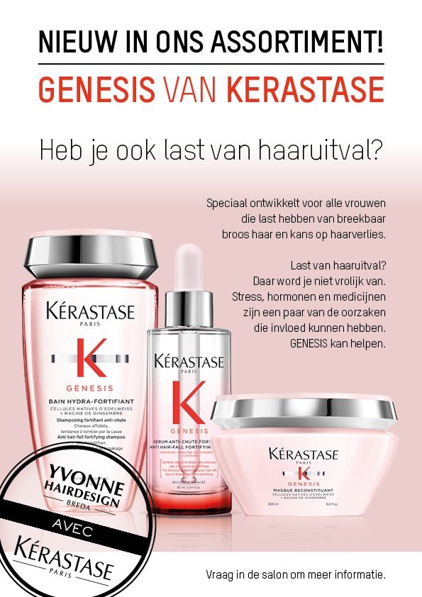 Voor iedere klant is de persoonlijke aandacht vanzelfsprekend. Van de juiste coupe tot de juiste kleur en zelfs de make-up! Maar ook voor haarproblemen ben je bij Yvonne Hairdesign aan het juiste adres. Vanaf nu kun je in de salon namelijk terecht voor de GENESIS lijn van Kerastase!