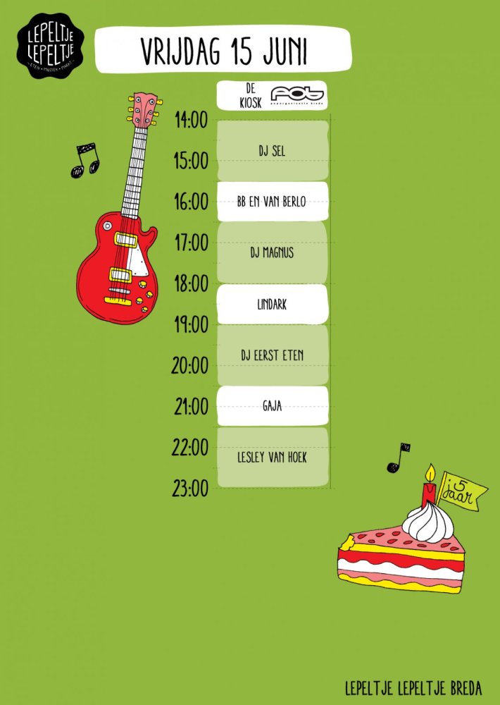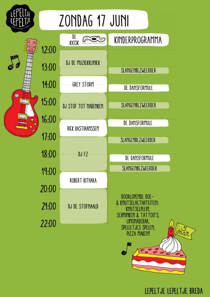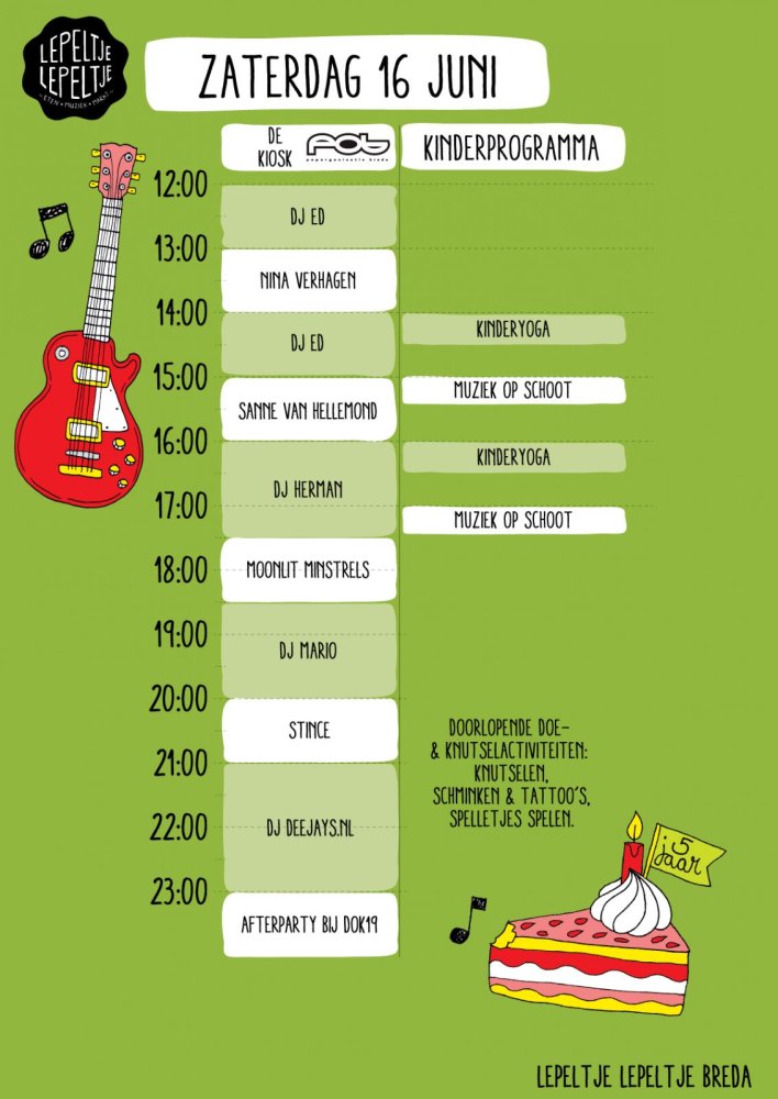 Een kleurrijk podium prijkt in het midden van het park, waar bands en DJ’s spelen voor hongerig publiek. Lepeltje Lepeltje heeft voor het muziekprogramma samengewerkt met Poporganisatie Breda (POB), waardoor er veel lokale artiesten te zien zijn het gehele weekend. Zo komen de akoestische duo’s GaJa en Lindark spelen. Daarnaast zijn er veel songwriters zoals Sanne van Hellemond, Nina Verhagen en Rick Bastiaanssen. Voor iedere smaak wat wils.