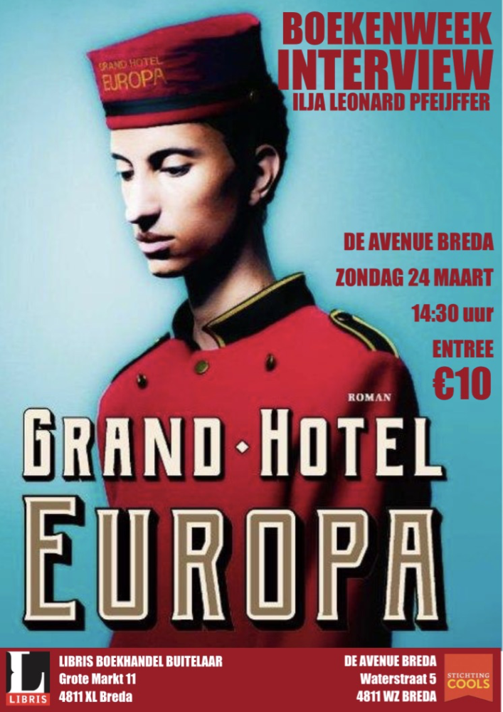 Op zondag 24 maart wordt er om 14:30 een lezing gehouden met Ilja Pfeijffer, georganiseerd door Libris Boekhandel Buitelaar. Hij schreef Grand Hotel Europa, wat nu al de beste roman van het jaar wordt genoemd! Grand Hotel Europa gaat over het oude continent, waar zoveel verleden is dat er voor toekomst geen plek meer is en waar het meest reële toekomstperspectief geboden wordt door de exploitatie van dat verleden in de vorm van toerisme. Het is een theatraal en lyrisch boek over de Europese identiteit, nostalgie en het einde van een tijdperk.