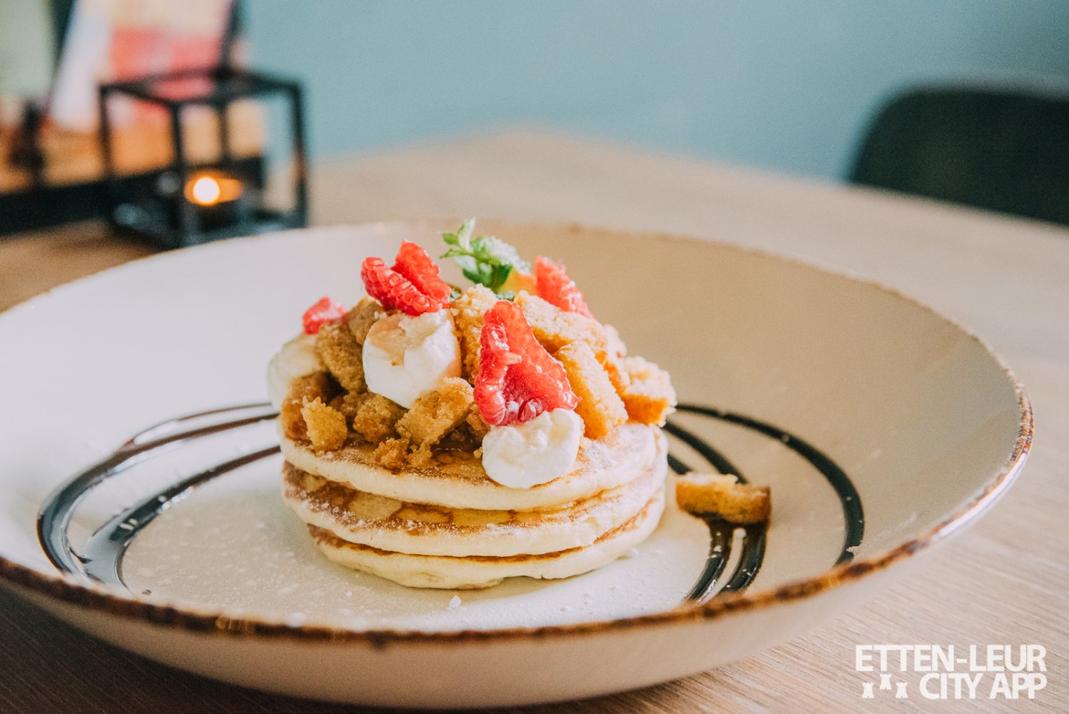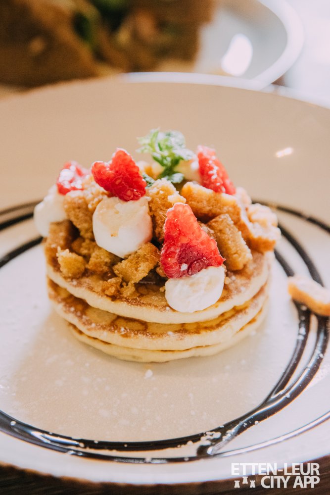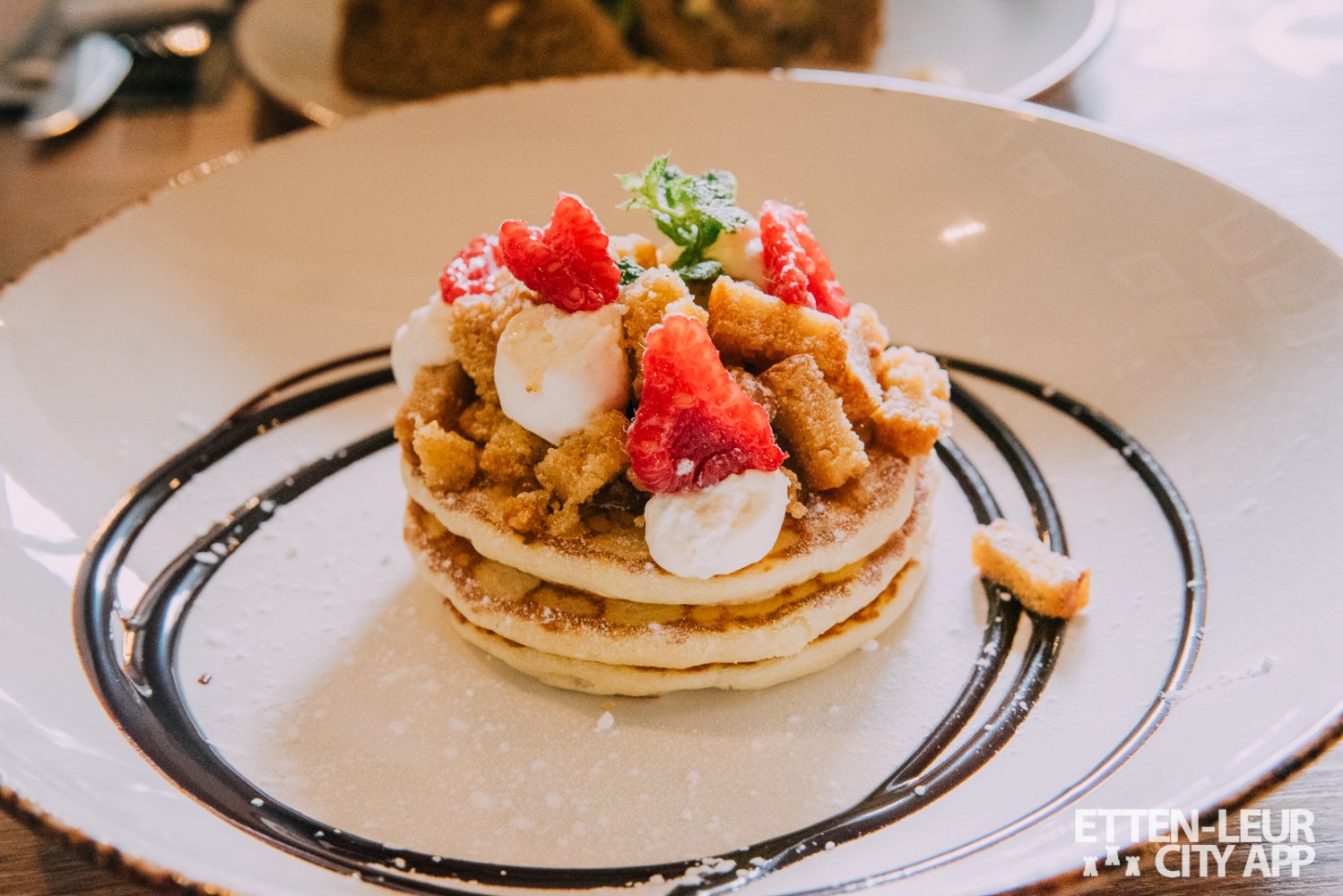 Daarnaast kiezen we voor American Pancakes met Blondie Crumble. Deze fluffy pancakes worden aangeraden door het nog altijd even enthousiaste personeel en wordt geserveerd met heerlijke toppings van mascarpone, frambozen en karamelsaus. Daarnaast is er duidelijk een vleugje citroen te proeven wat een frisse toevoeging geeft aan dit vooral zoete gerecht! Dit is een gerecht om je vingers bij af te likken!