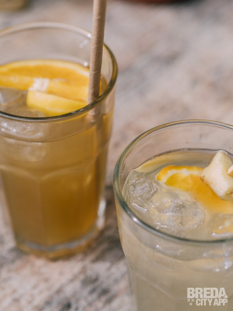 Bij binnenkomst worden we vriendelijk verwelkomt door Laurens. Hij brengt ons naar een tafeltje in de gezellige tuin. Je kunt lekker in de zon zitten maar je kunt ook jezelf terugtrekken in de schaduw onder de grote parasol. We beginnen met het uitzoeken van een drankje. Je kunt kiezen uit koffie, thee, bier, wijn of fris. Wij gaan voor de huisgemaakte ijsthee en ginger beer. Zelfgemaakte drankjes zijn altijd het leukste om te proberen.