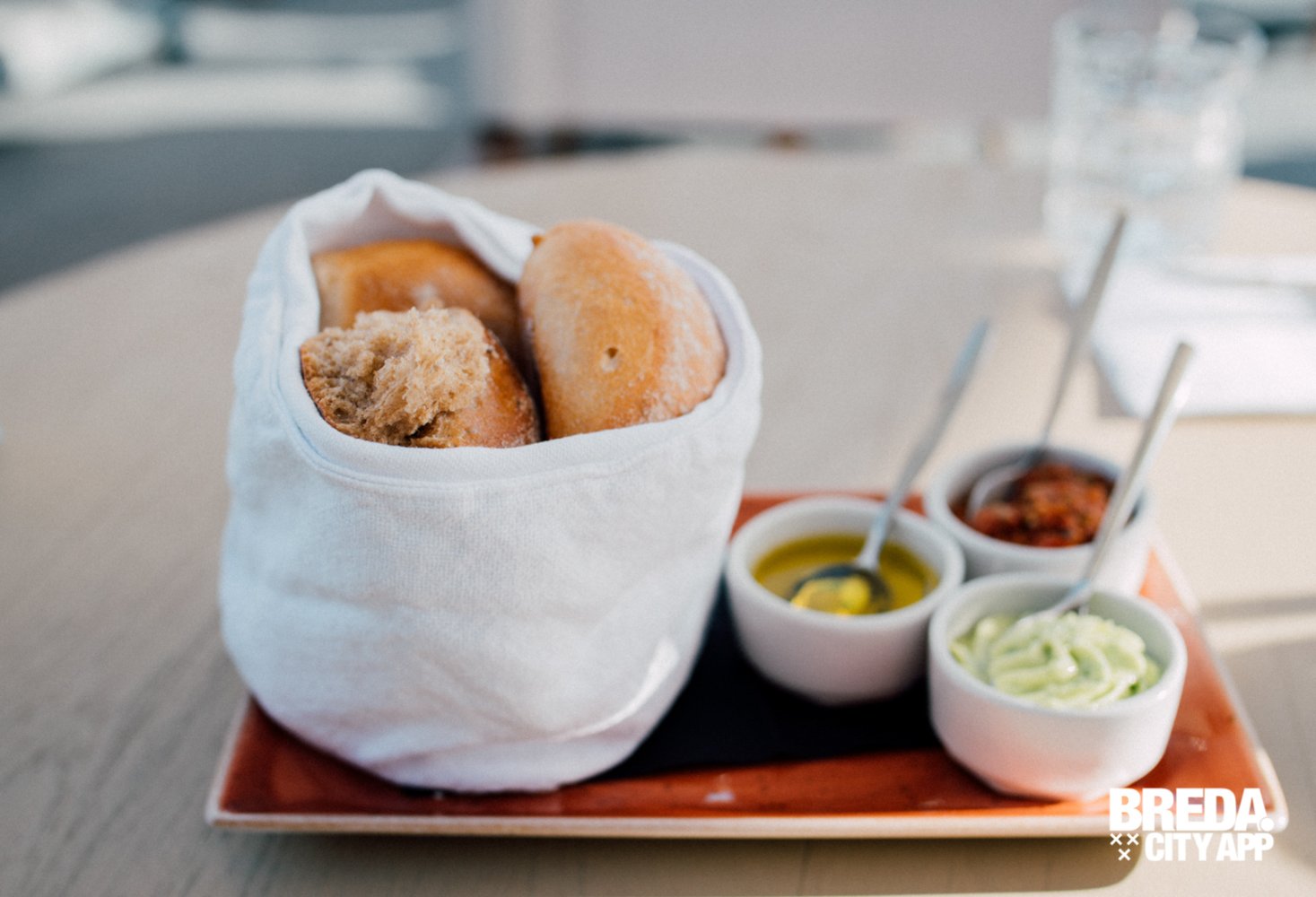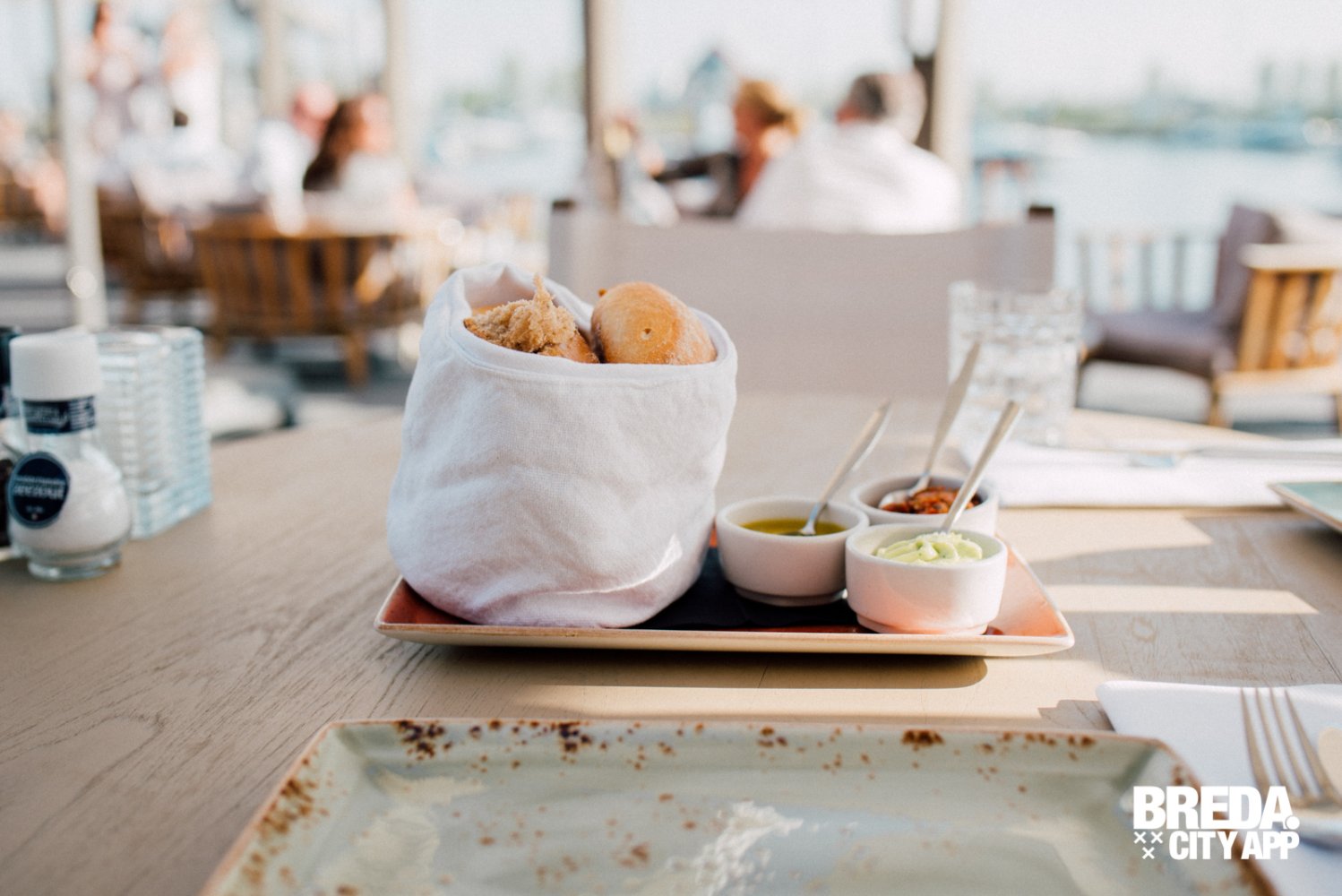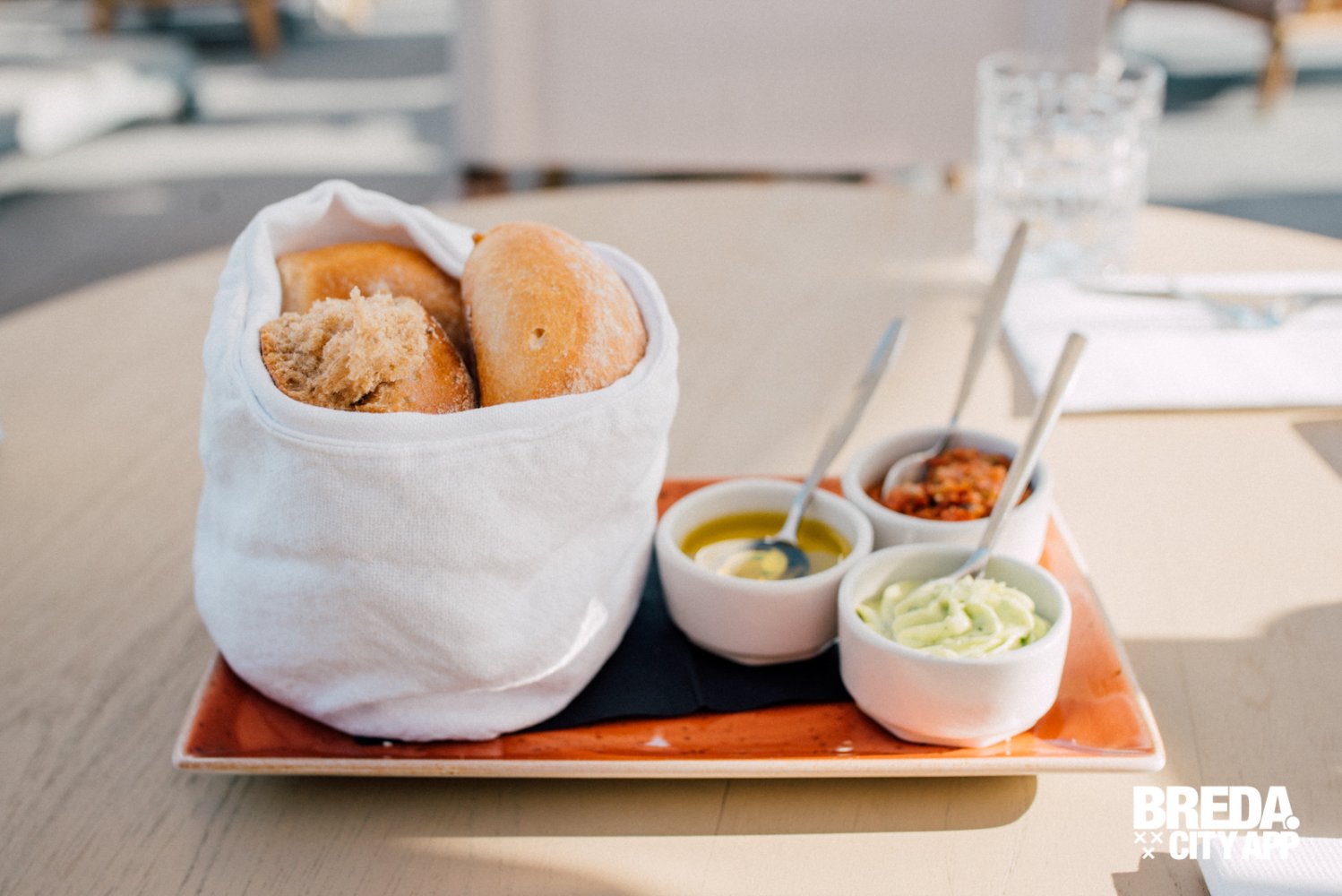 Wij kiezen voor een tafeltje in de schaduw en starten met een aperitief. Wat past er beter bij een zonnige vrijdagmiddag dan een goede gin-tonic? We krijgen een mandje vers brood met dips, en bestuderen de uitgebreide kaart. More-Itz lijkt wellicht prijzig, maar je krijgt er absoluut waar voor je geld! Meest besteld is de etagere, deze wordt in twee gangen geserveerd en beslaat een proeverij van al het lekkers dat More-Itz te bieden heeft.