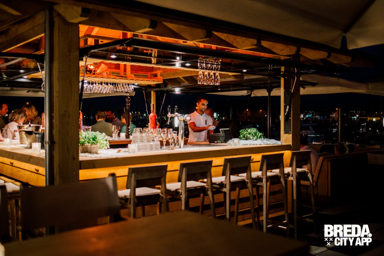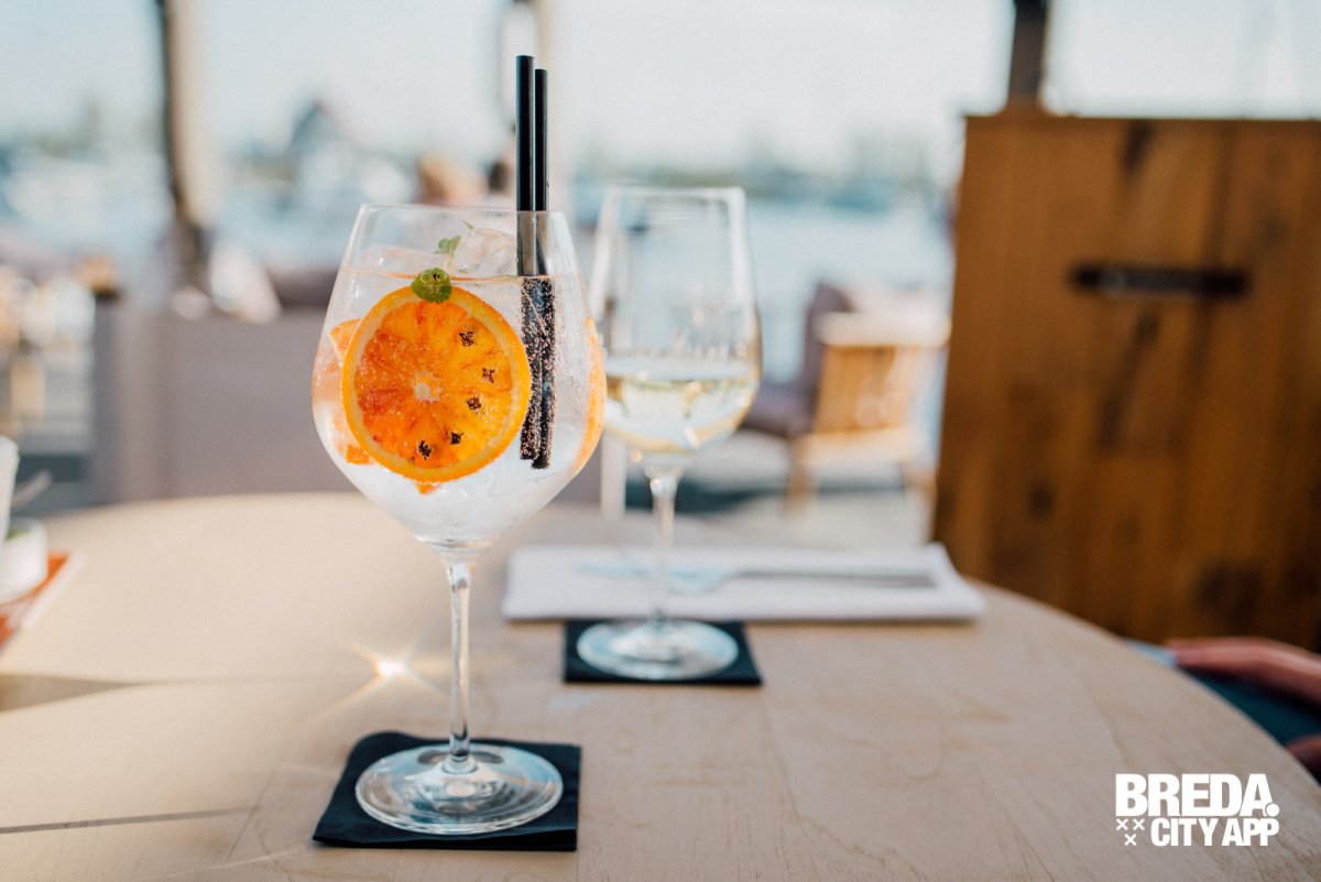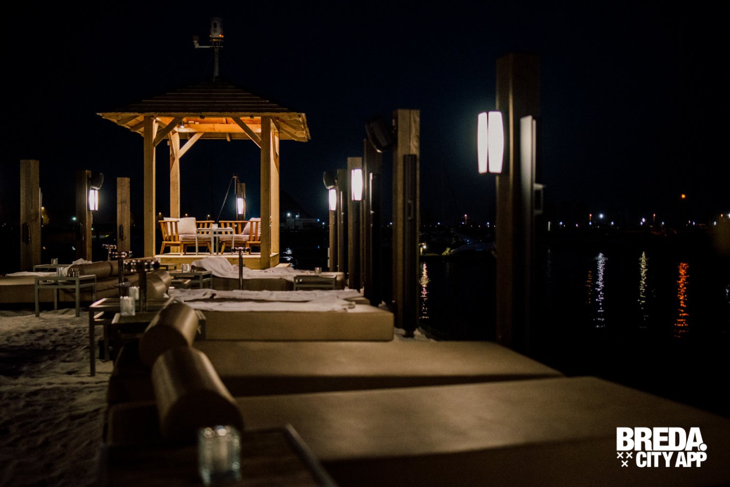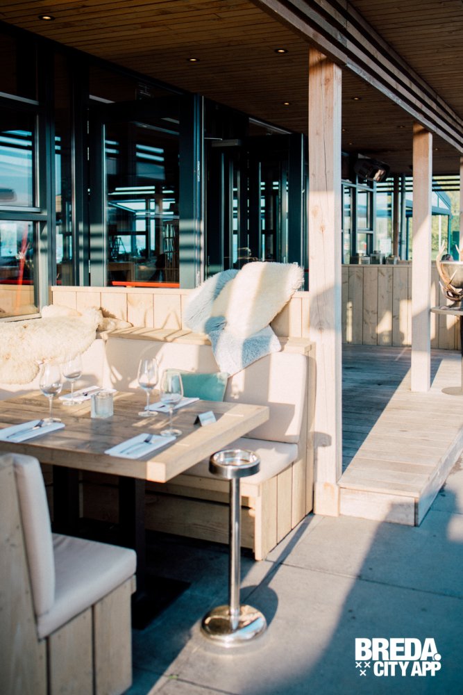 Inmiddels is het licht gaan schemeren en genieten we nog even van het uitzicht over de haven met de ondergaande zon. Het wordt wat frisser, maar daar is More-Itz op voorbereid. Kleedjes en haardvuren verschijnen, de serre wordt deels afgesloten en de warmte lampen gaan aan. Zo kun je nog uren genieten van het buiten zijn in de Biesbos.