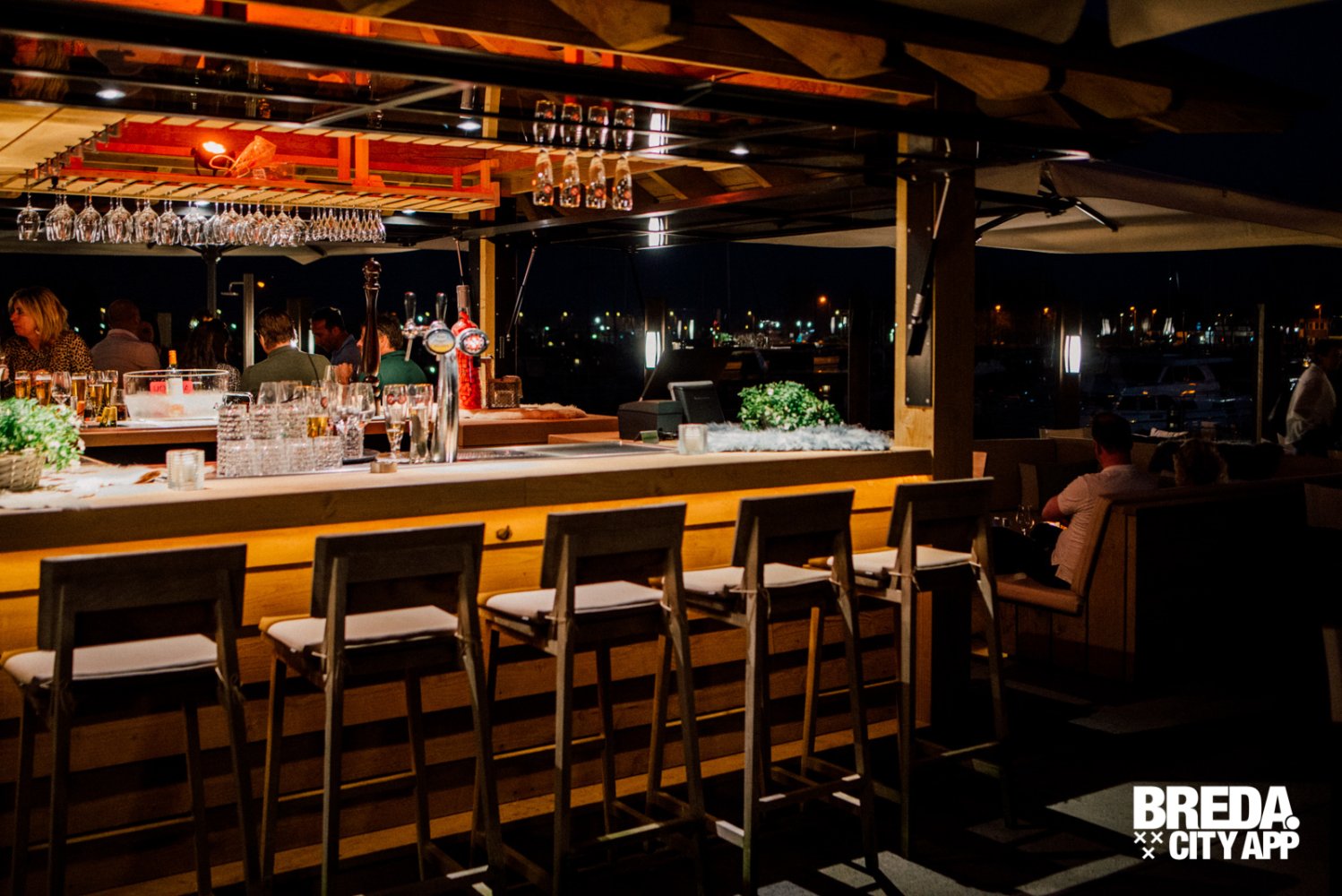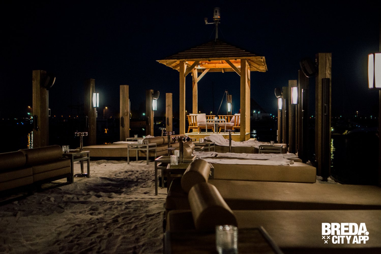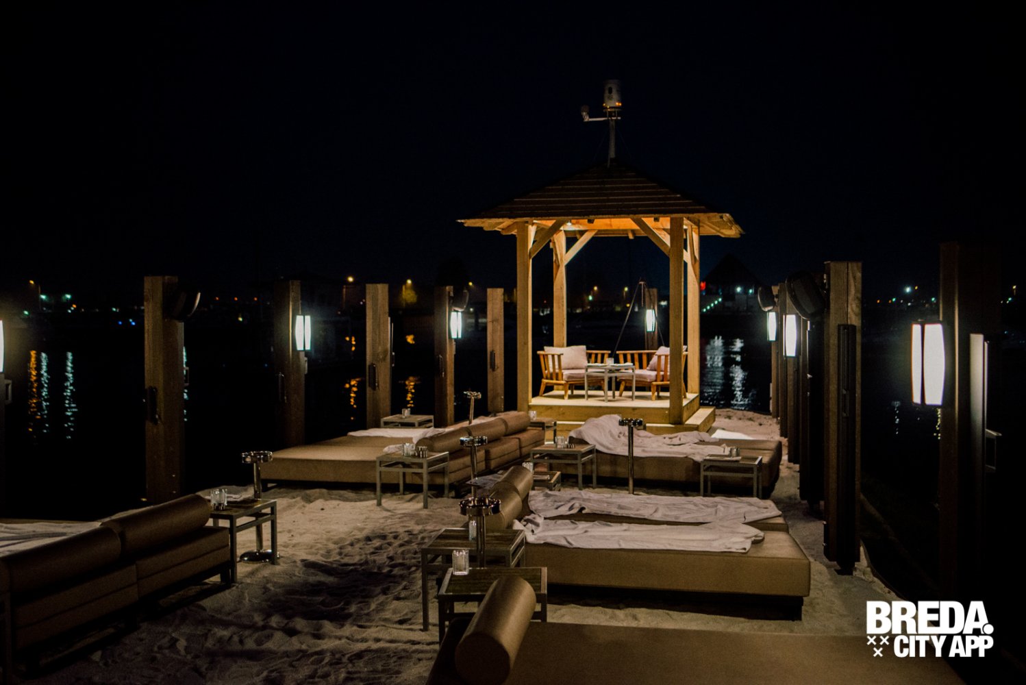 Inmiddels is het licht gaan schemeren en genieten we nog even van het uitzicht over de haven met de ondergaande zon. Het wordt wat frisser, maar daar is More-Itz op voorbereid. Kleedjes en haardvuren verschijnen, de serre wordt deels afgesloten en de warmte lampen gaan aan. Zo kun je nog uren genieten van het buiten zijn in de Biesbos.