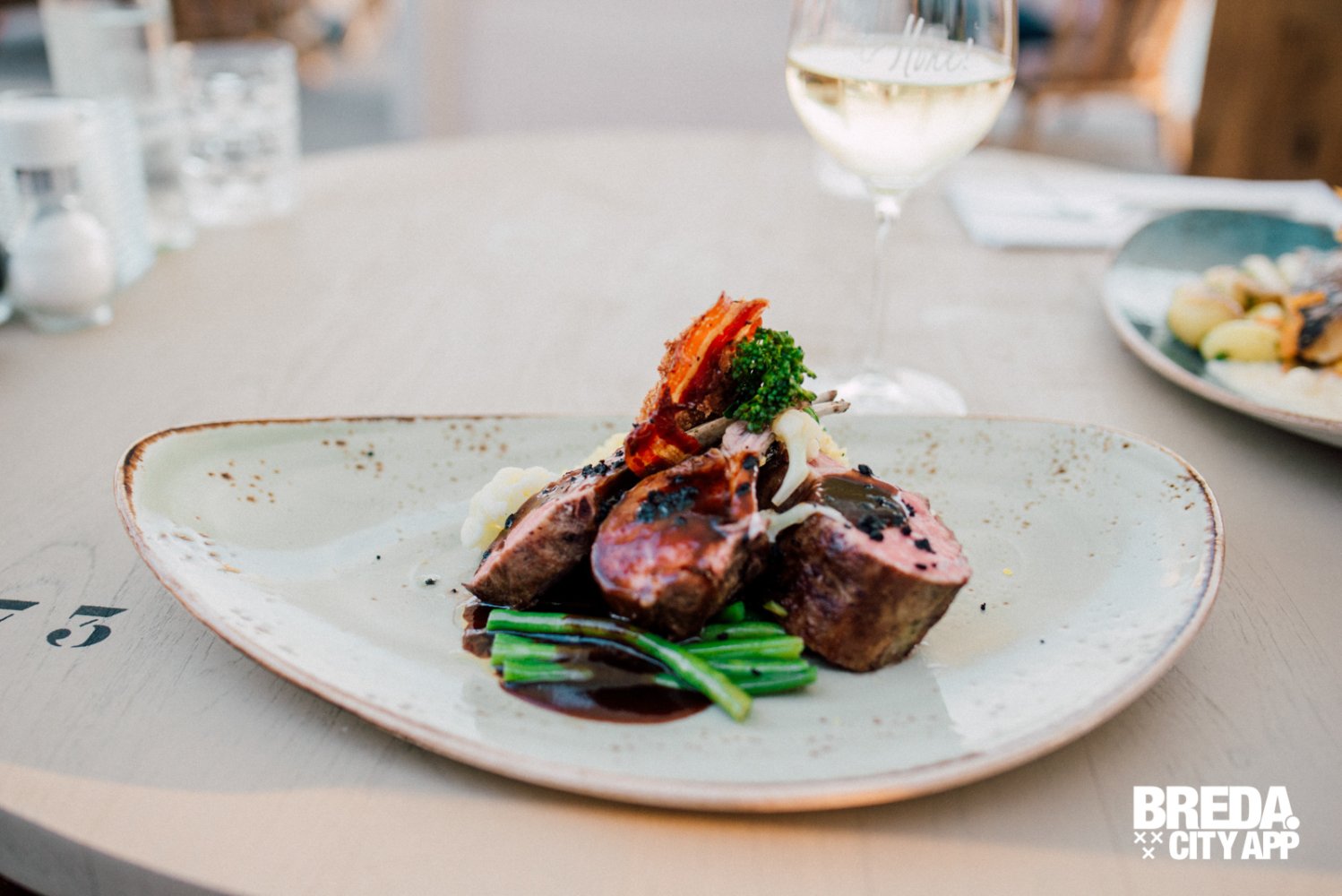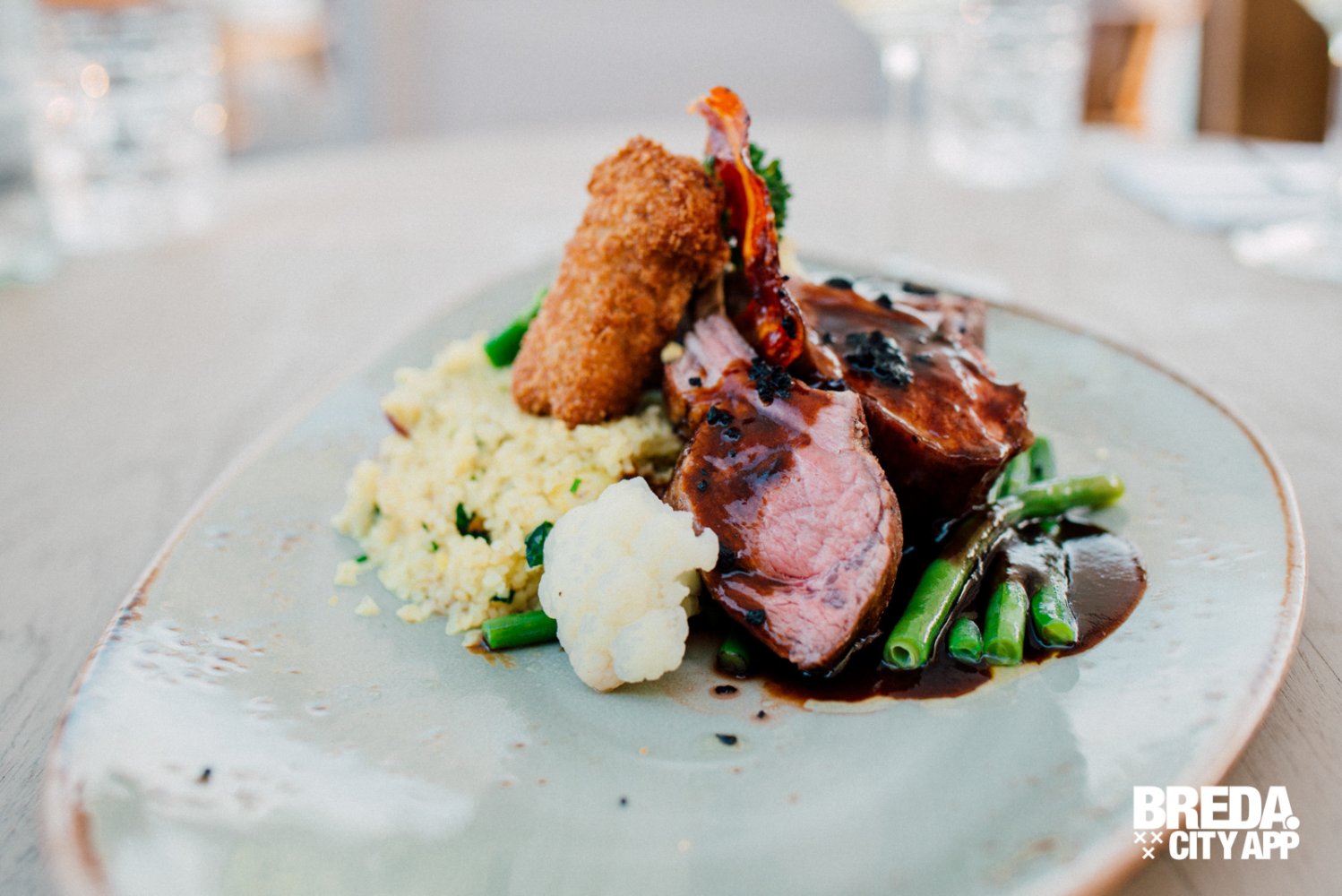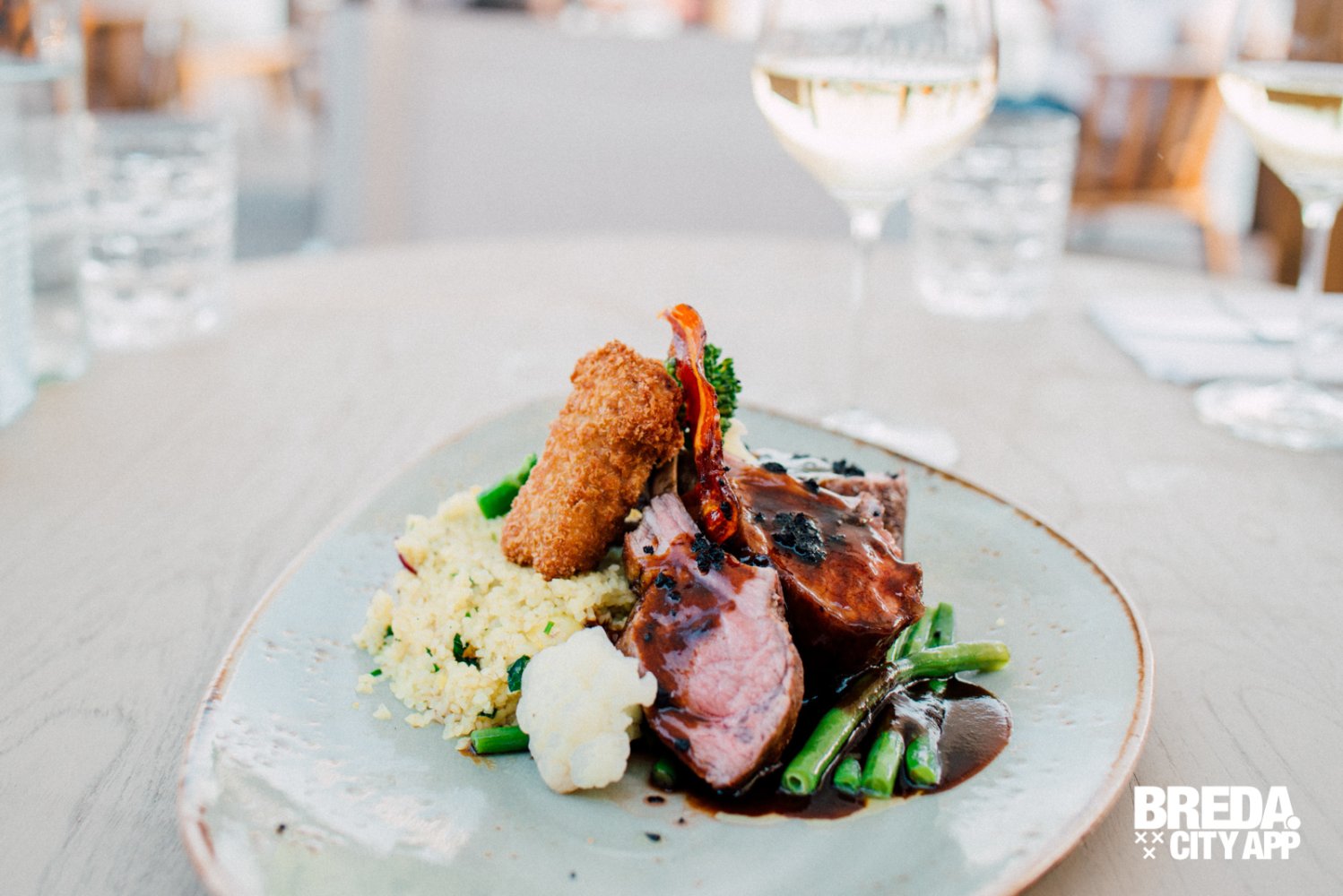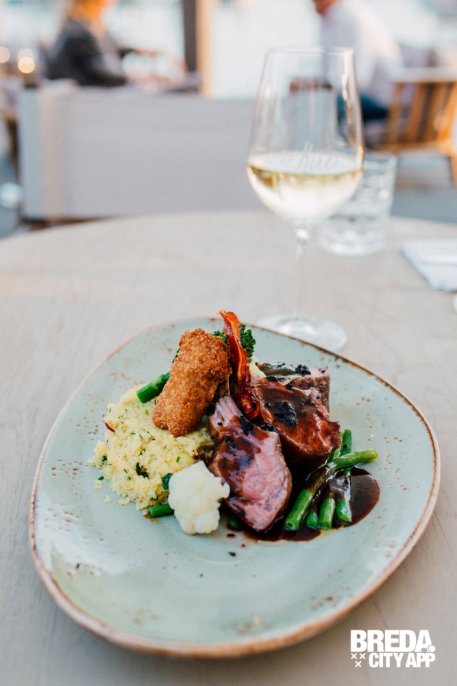 Om voor wat afwisseling te zorgen tussen de vis-gerechten bestelt mijn partner de lamsrack met gerookte knoflookjus. De lamsrack wordt geserveerd met een lamskroketje en tabouleh, vergelijkbaar met couscous. Een mooi lente-achtig vlees gerecht, vol van smaak, niet te zwaar en fris door de tabouleh. Het vlees is per-fect gegaard en super mals. De lam is zo zacht dat hij bijna smelt op je tong. Genieten!