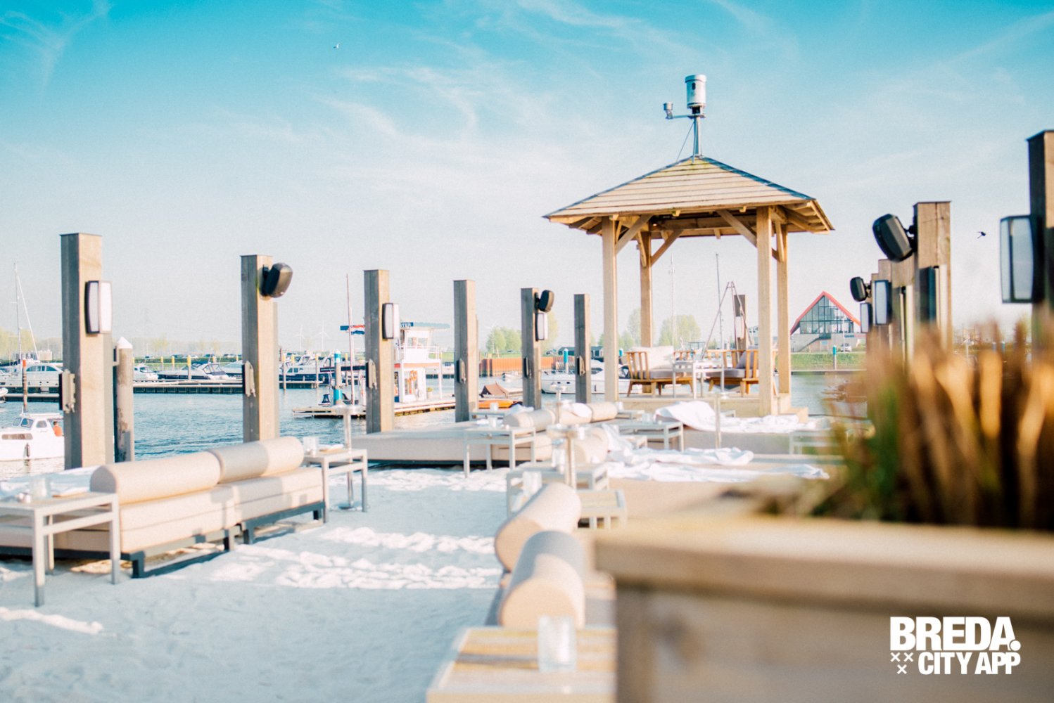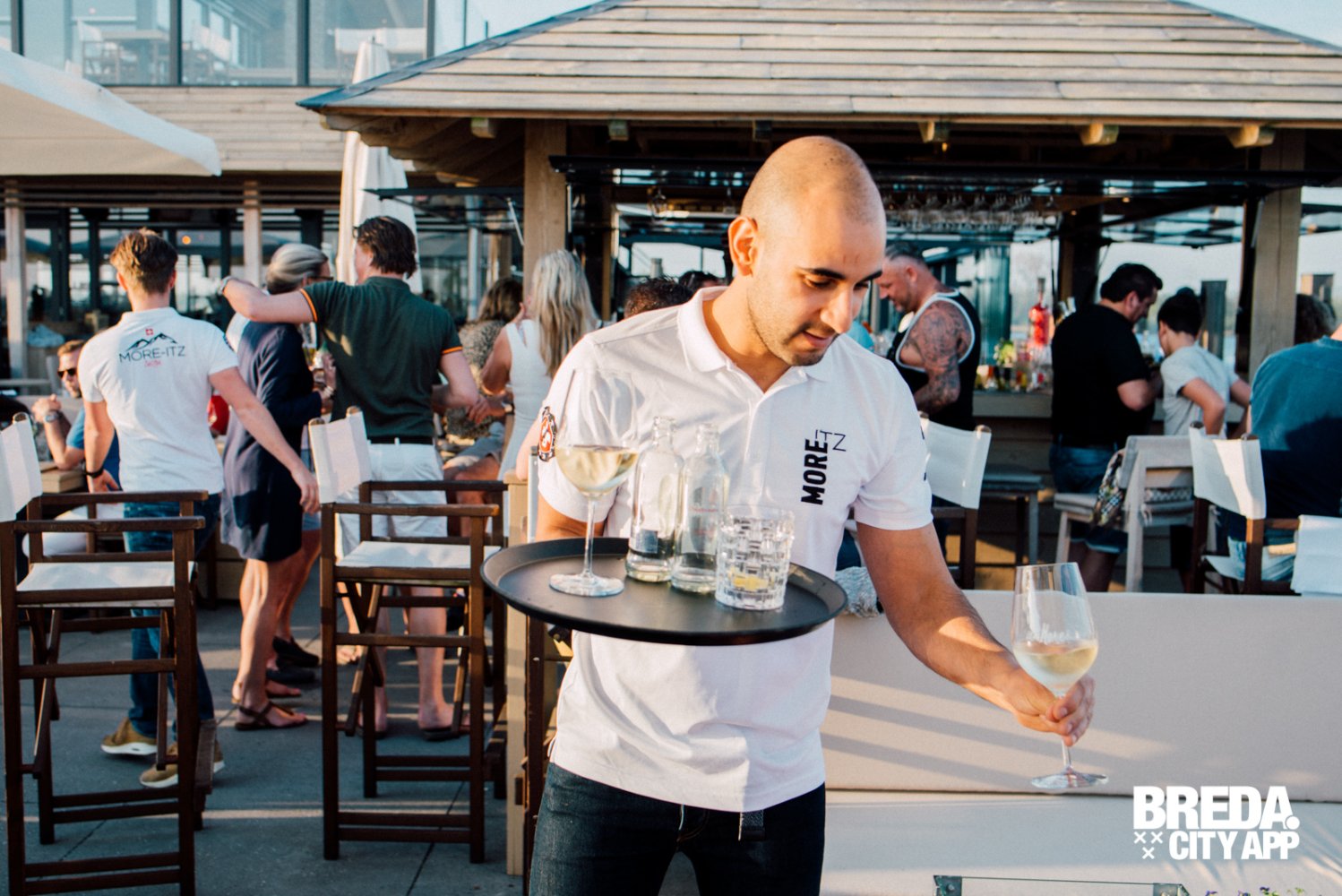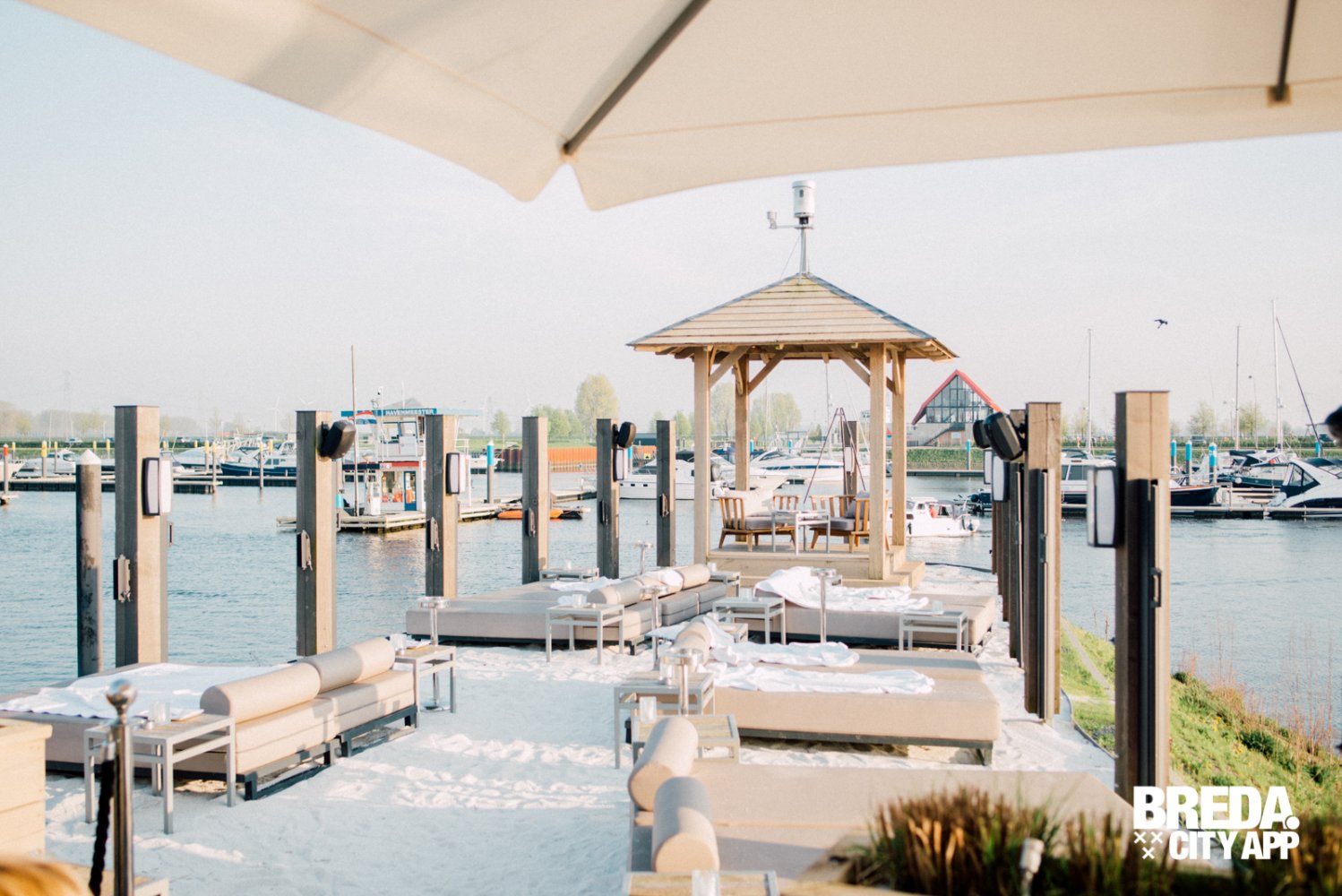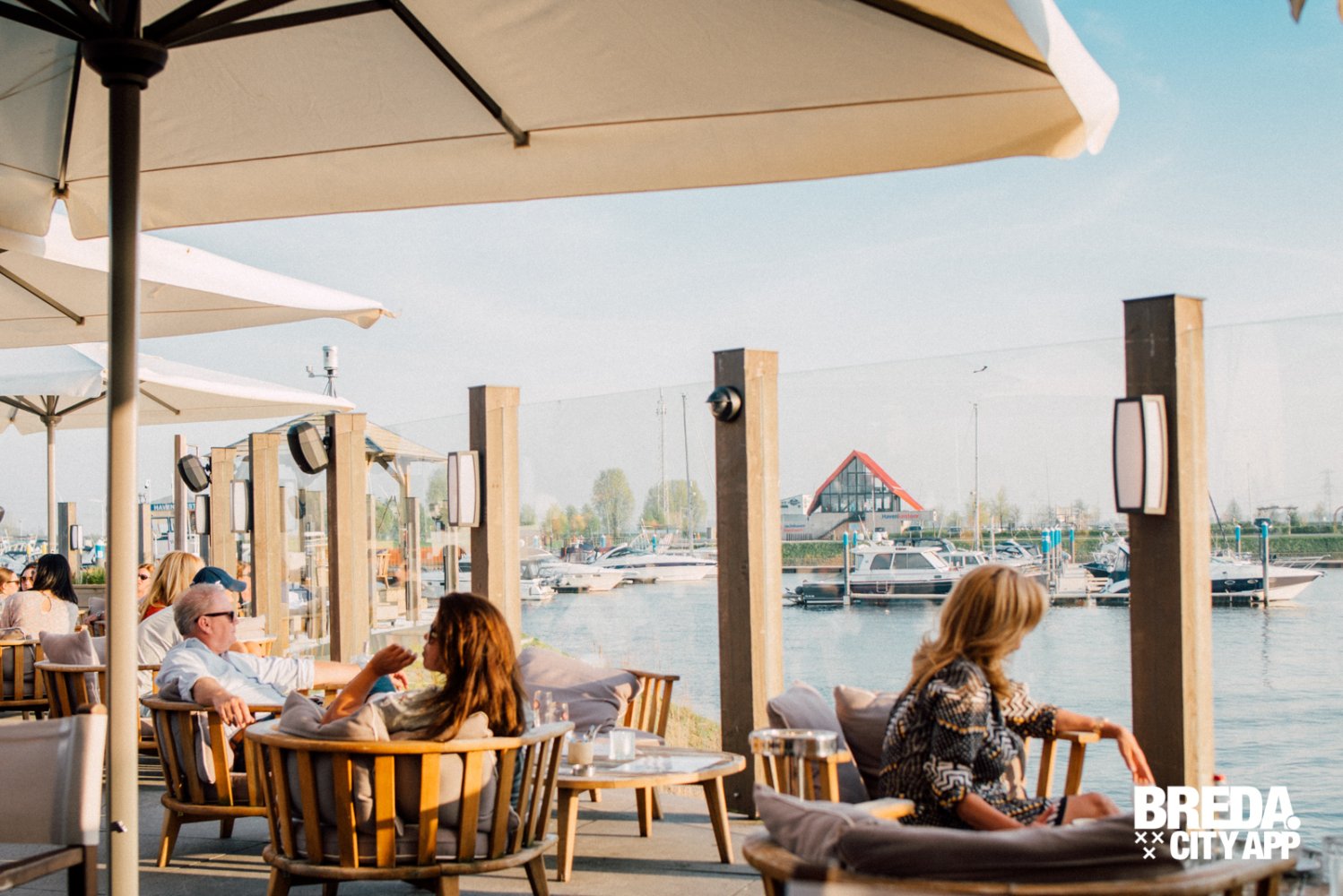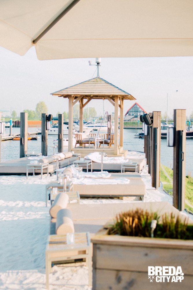 More-Itz ligt net iets buiten Oosterhout, zodra we de haven tegemoet rijden krijg ik direct een vakantiegevoel. Wat een prachtige omgeving en wat een rust heerst hier aan het water. We wandelen langs sloepjes, jachten en zeilboten naar het luxe-uitziende More-Itz. We worden direct hartelijk ontvangen door de hostess; een tafeltje, in de zon, in de schaduw, het kan allemaal. Wat me opvalt is de sfeer, het is hier heel relaxed; lounge muziek, knusse zitjes, fijne banken, warme kleuren, kussens, plekjes in en uit de zon. Thomas laat ons het strandje zien, onlangs geopend voor het seizoen. Wauw! Hier kun je heerlijk vertoeven aan het water, op een bedje met het meest prachtige uitzicht.