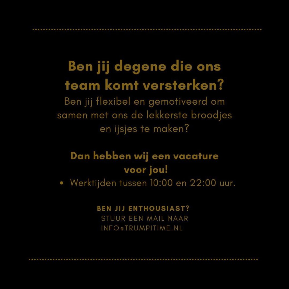 Ze zijn nu nog niet open, maar ze zijn wel op zoek naar nieuwe werknemers. Ze bieden je gevarieerde tijden, dagen en een leuke baan. Dus ben jij flexibel en gemotiveerd? En vind je het leuk om broodjes en ijsjes te maken? Solliciteer dan bij Trump Time en mail naar info@trumpitime.nl.