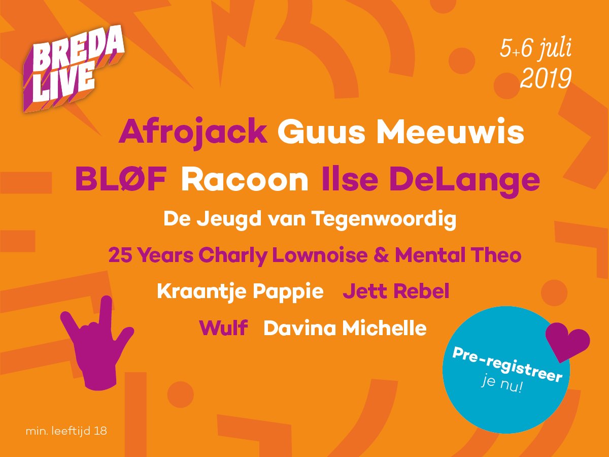 Ze hebben een prachtig programma met voor het eerst op Breda Live: Afrojack, 25 Years Charly Lownoise & Mental Theo, Kraantje Pappie, Jett Rebel en Davina Michelle. Daarnaast zijn Guus Meeuwis, Bløf, Racoon, Ilse DeLange, De Jeugd van Tegenwoordig en Wulf er ook weer bij!