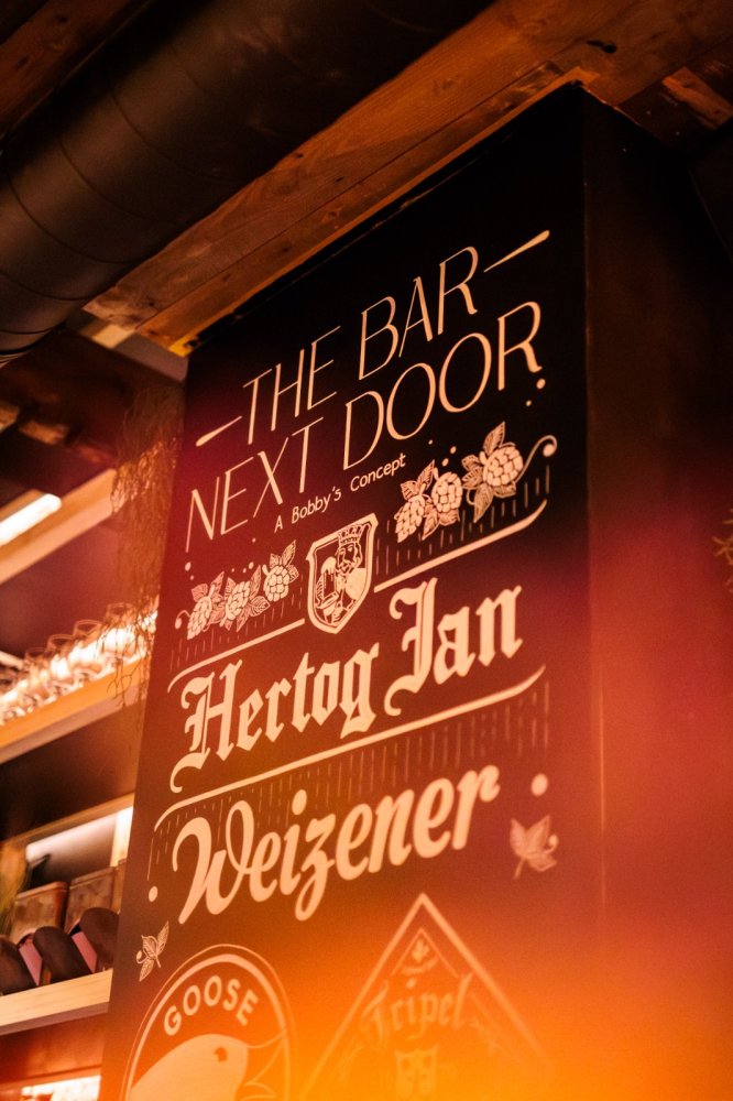 The Bar Next Door biedt een grote selectie dranken, waaronder 50 soorten gin, 35 soorten whisky, 20 soorten rum, talloze cocktails en een uitgebreide keuze aan gin & tonics. De bar ademt een vintage sfeer met veel hout, donkere kleuren en graffiti.