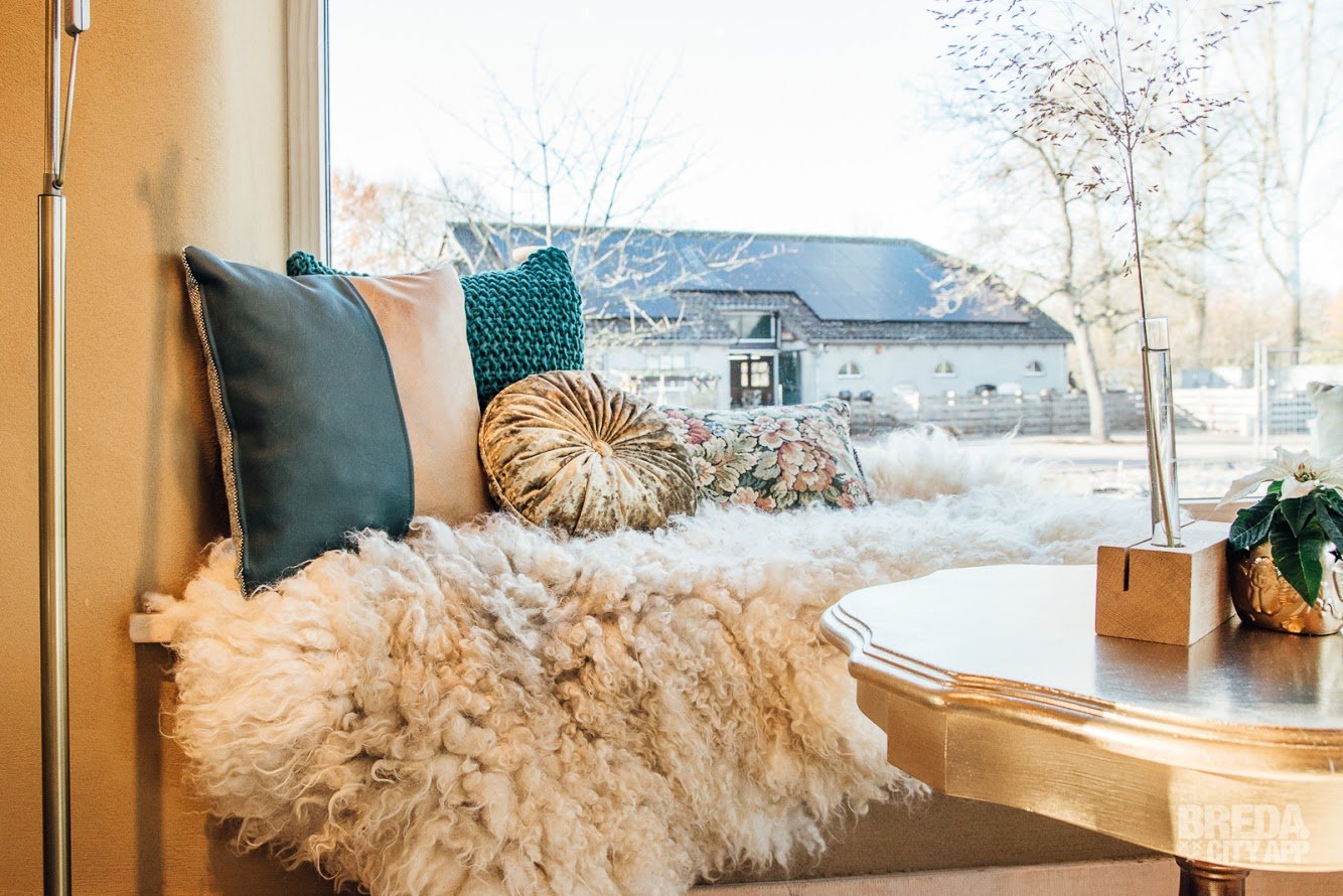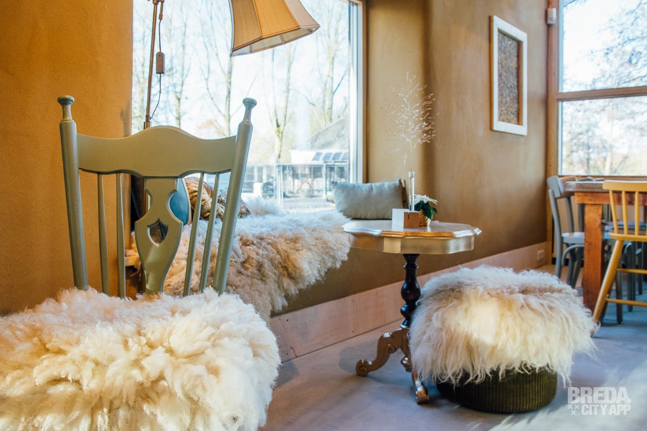 De welbekende 'Schapenscheerdag' op boerderij Wolfslaar wordt elk jaar in mei georganiseerd. De diervriendelijke schapenvachten zijn vervolgens bewerkt en nu gebruikt voor het interieur van het Tuinhuis. Een mooie en pure decoratie! Persoonlijk mijn favoriete hoekje van het Tuinhuis.