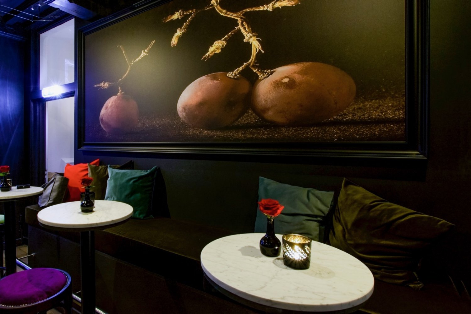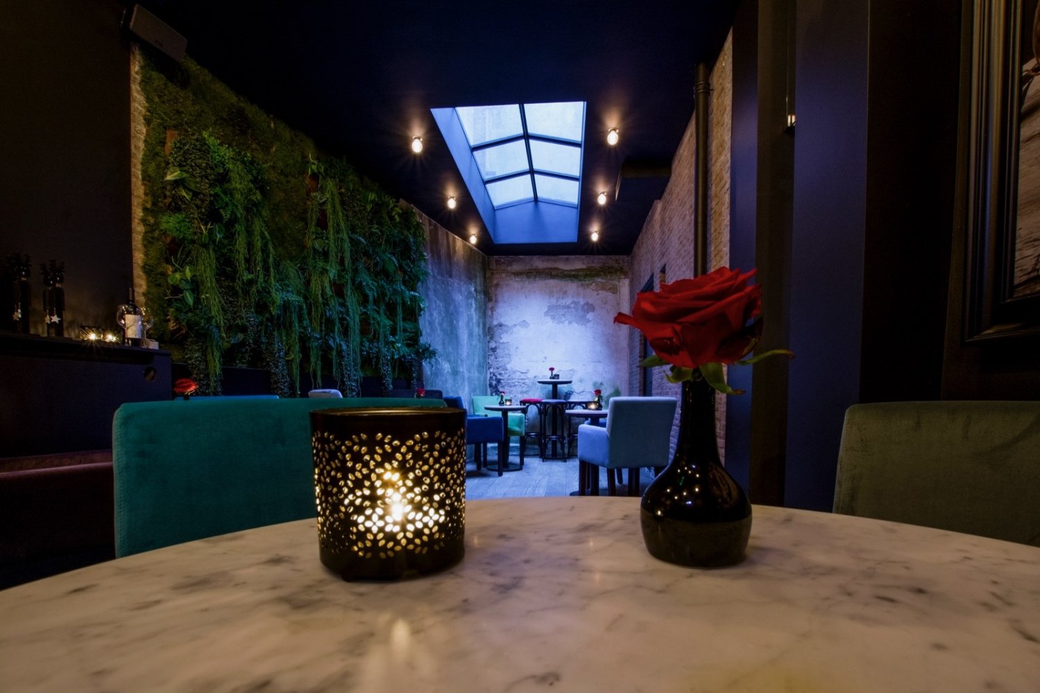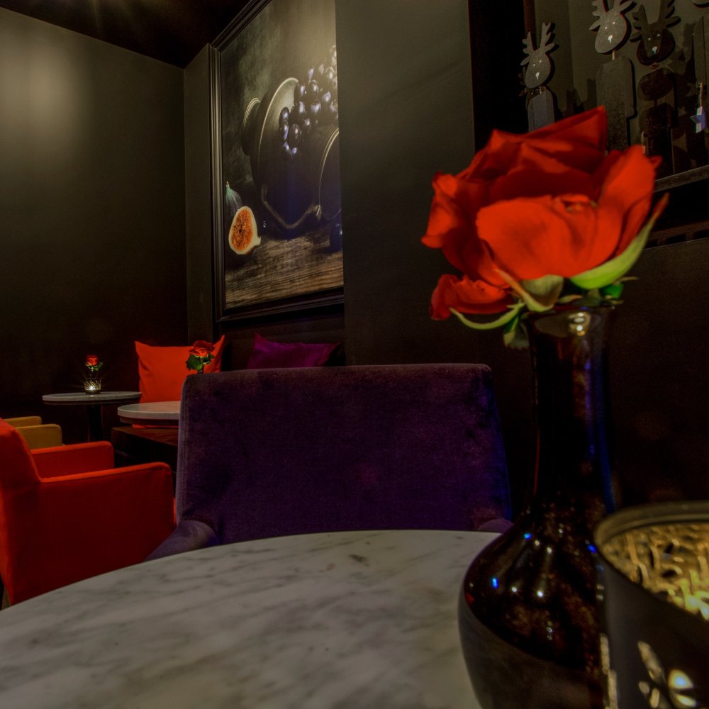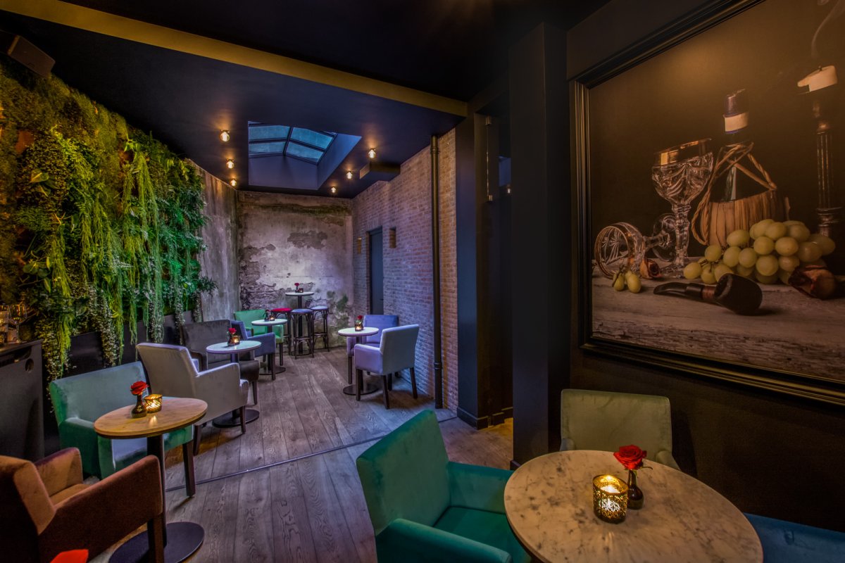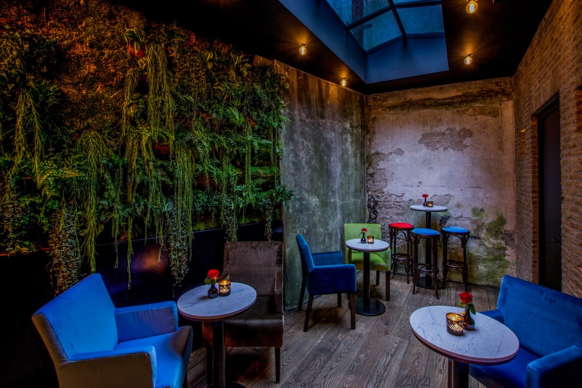 Vanuit de bar kun je doorlopen naar het grotere zitgedeelte. Hier staan ook lage tafeltjes, waar je rustig kunt borrelen. Achterin deze ruimte, waar vroeger het binnenplaatsje was, is een mooie dakkapel geplaatst maar zijn de originele buitenmuren behouden gebleven. Om het binnen-buiten gevoel te versterken is er een levende groenmuur geplaatst.