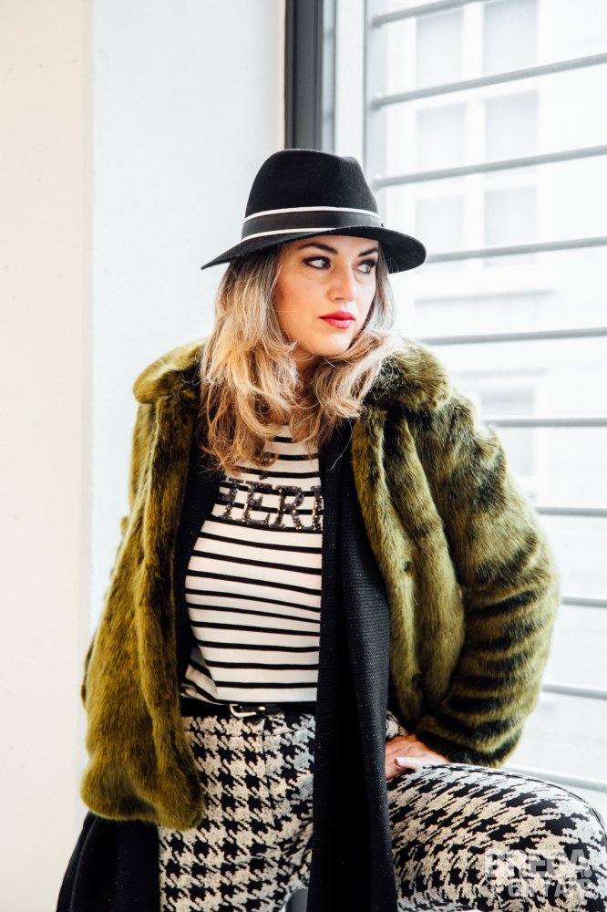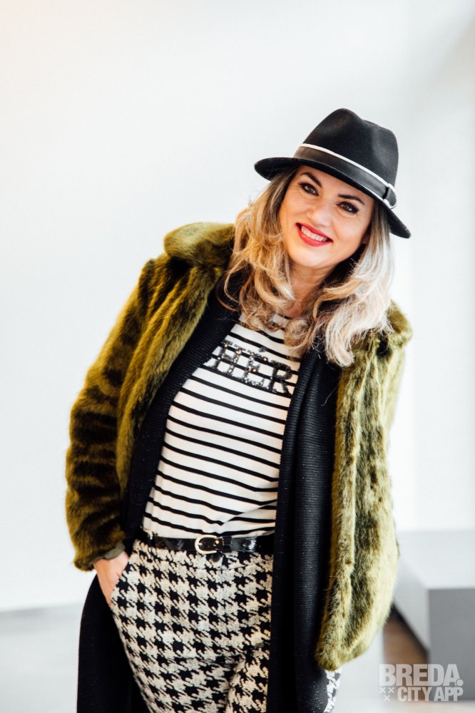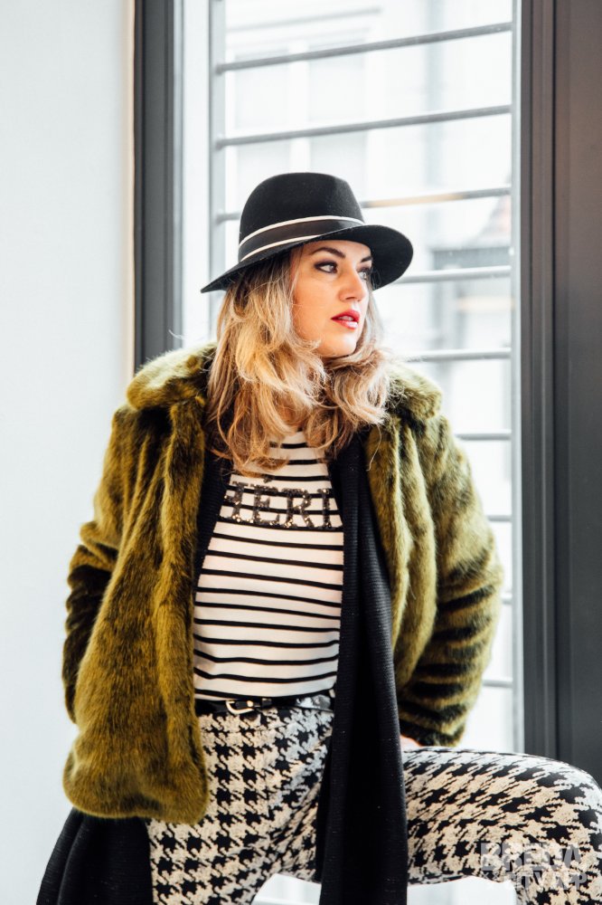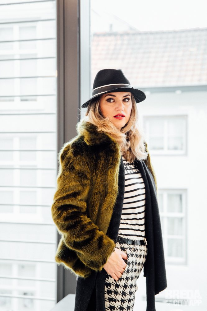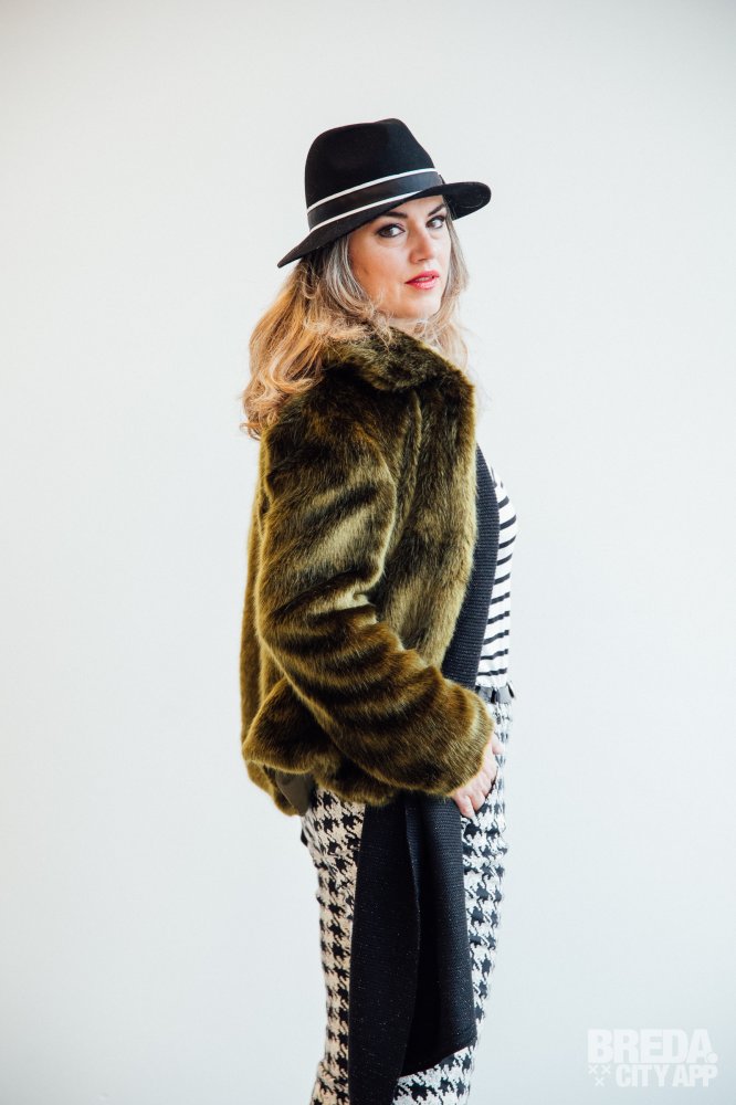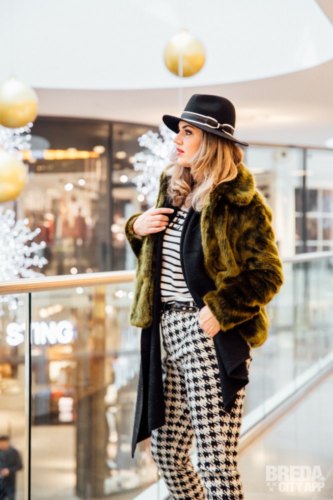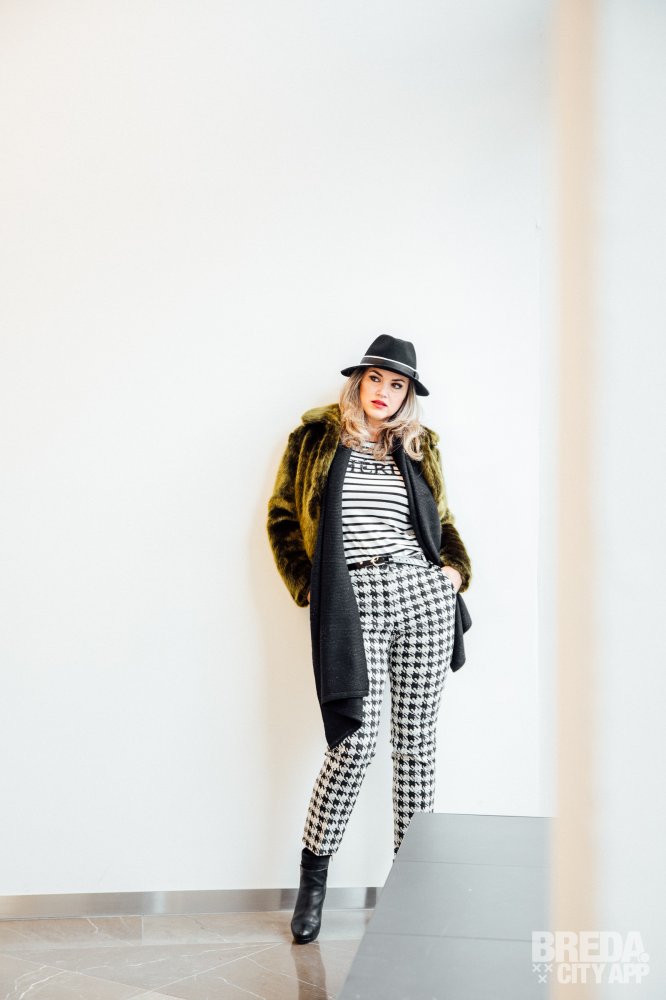 Aangekomen bij de Van Uffelen mode kiest Katalin voor een toffe broek met een Pied-de-Poule patroon. Dit patroon komt oorspronkelijk uit Schotland en geeft een chique uitstraling. Op deze broek draagt Katalin een gestreept t-shirt met lange mouwen. De opdruk met pailletten maakt het geheel nog wat feestelijker. Om ook buiten de deur stijlvol te verschijnen is deze outfit afgemaakt met een heerlijke furcoat. Niet alleen de stof is helemaal volgens de laatste trends, maar ook de groene kleur is super hip!