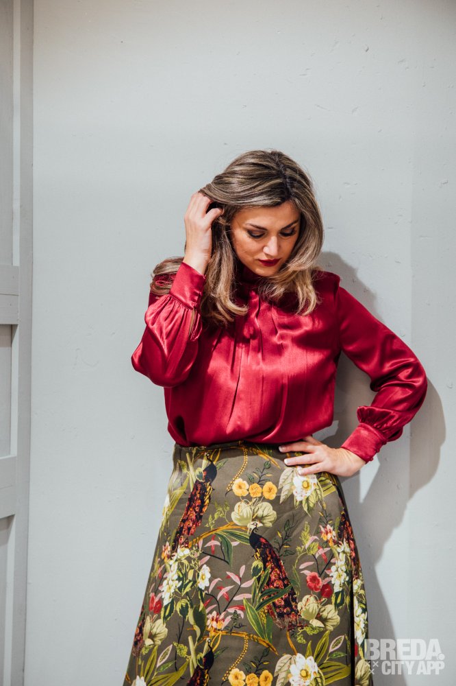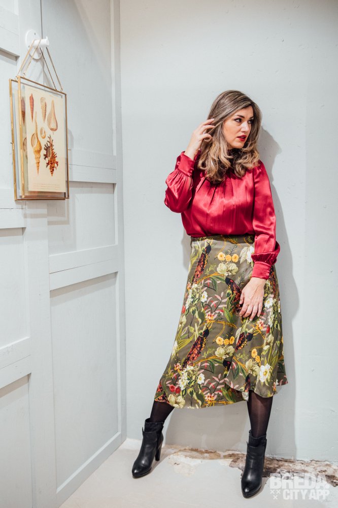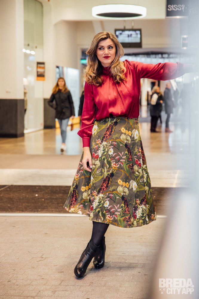 Aangekomen bij de onlangs geopende Sissy-Boy zijn wij heel erg benieuwd wat er voor ons is klaargelegd. Katalin komt het pashokje uitgelopen in een súper toffe klokkende midirok met all over print. De rok heeft een blinde ritssluiting aan de achterkant. Deze rok komt het beste tot zijn recht met een effen blouse. Katalin kiest voor een prachtige satijnen blouse met opstaande kraag, plooien voor, lange mouwen met manchet én een knoopsluiting in de hals. De blouse heeft een los vallende fit. De rode kleur van de blouse zie je ook terug in de rok. Wij zijn hélemaal weg van deze outfit! Wat vinden jullie?