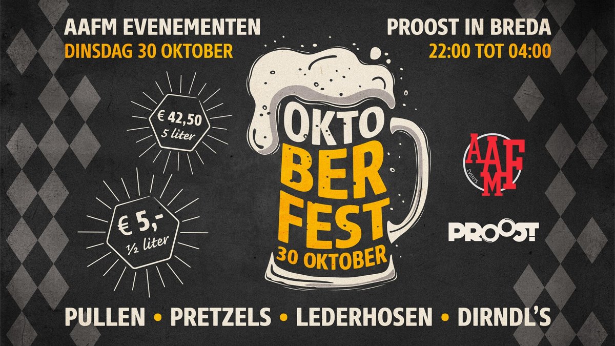 Biertafels, bierpullen, Gunther en Heidi-outfits en Pretzels zijn dé ingrediënten voor het Oktoberfest bij Proost in Breda op 30 oktober.  Samen met AAFM Events organiseert Proost een heus Oktoberfest in Breda. Oktoberfest is één van de grootste bier-festivals bij onze buren, Duitsland. Een Oktoberfest komt altijd met enorm veel gezelligheid, uiteraard enorm veel bier, mooie outfits en lekkere Pretzels… dat hoort ook in ons mooi Breda thuis! En daarom hebben AAFM Events en Proost in Breda hun krachten gebundeld om op 30 oktober een Oktoberfest te organiseren.