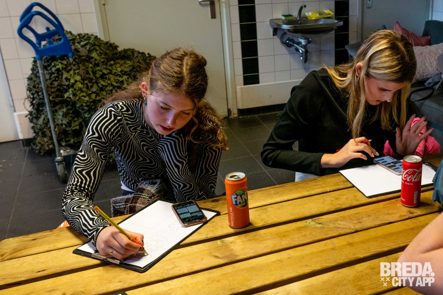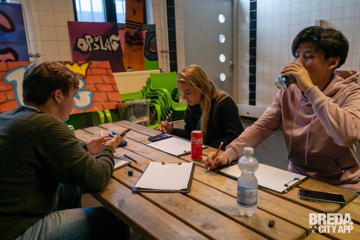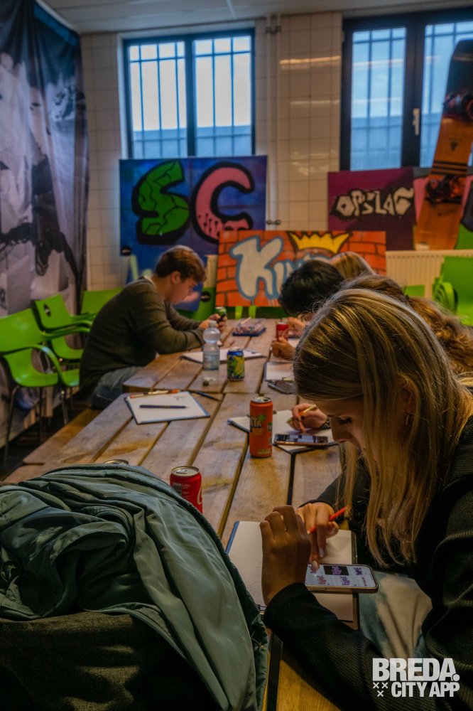 Toen we terugkwamen in de schetsruimte kregen we een drankje aangeboden. Ze hebben frisjes, voor de groepen met volwassenen biertjes en mocht je even wakker willen worden hebben ze ook een lekker kopje koffie. Toen we de drankjes ontvingen mochten we aan de slag met het schetsen van ons kunstwerk, in pure concentratie konden we onze creativiteit op papier uiten. Ciam liep ondertussen rond om ons te helpen met de schets en leerde ons in graffiti letters een 'tag' te tekenen.