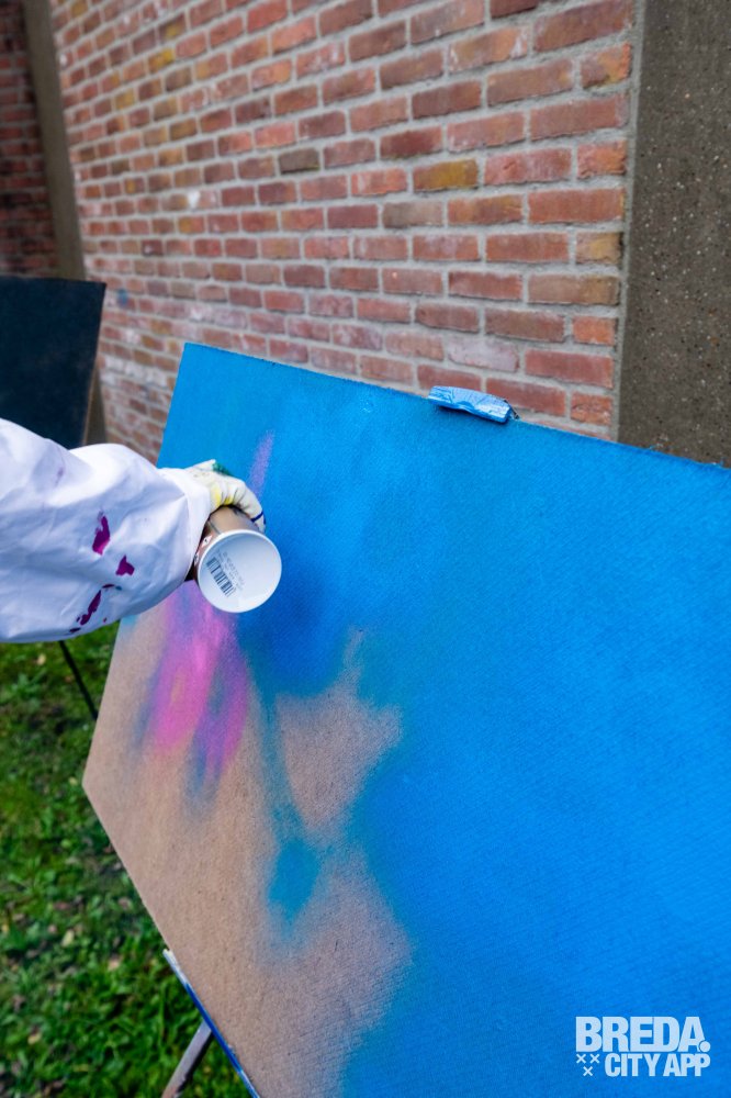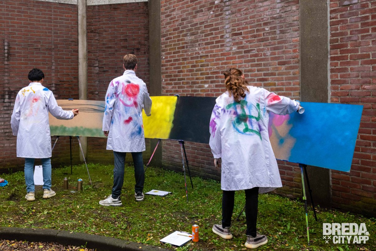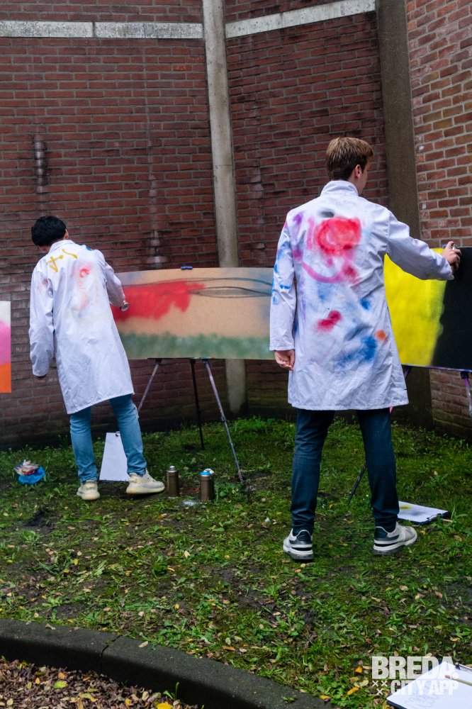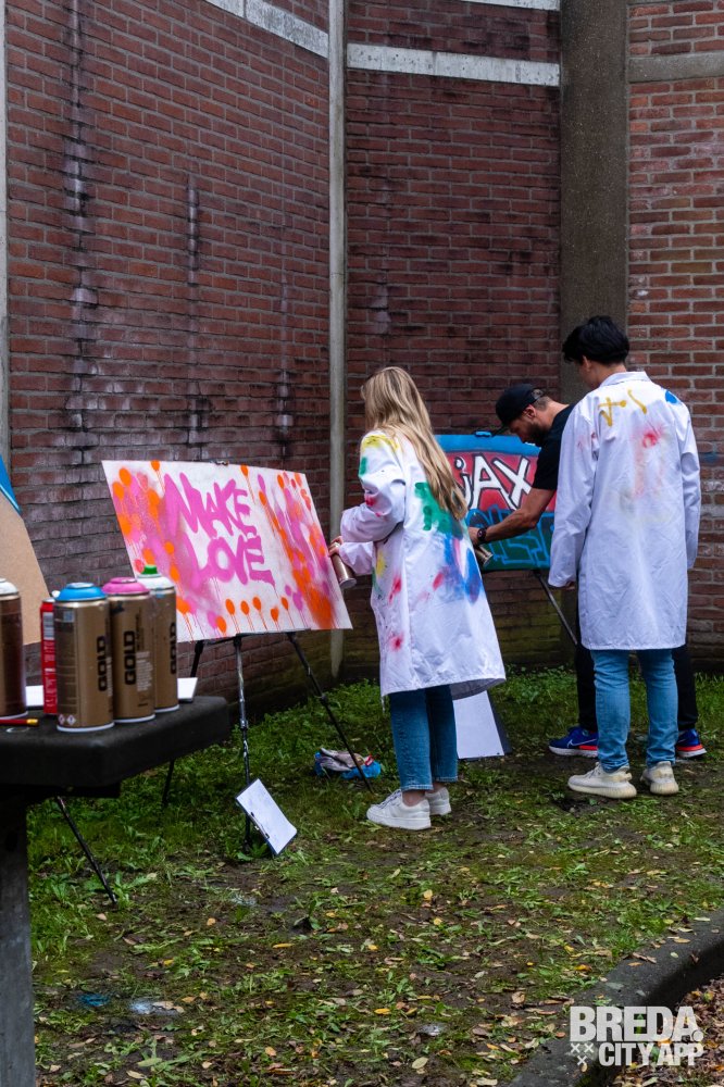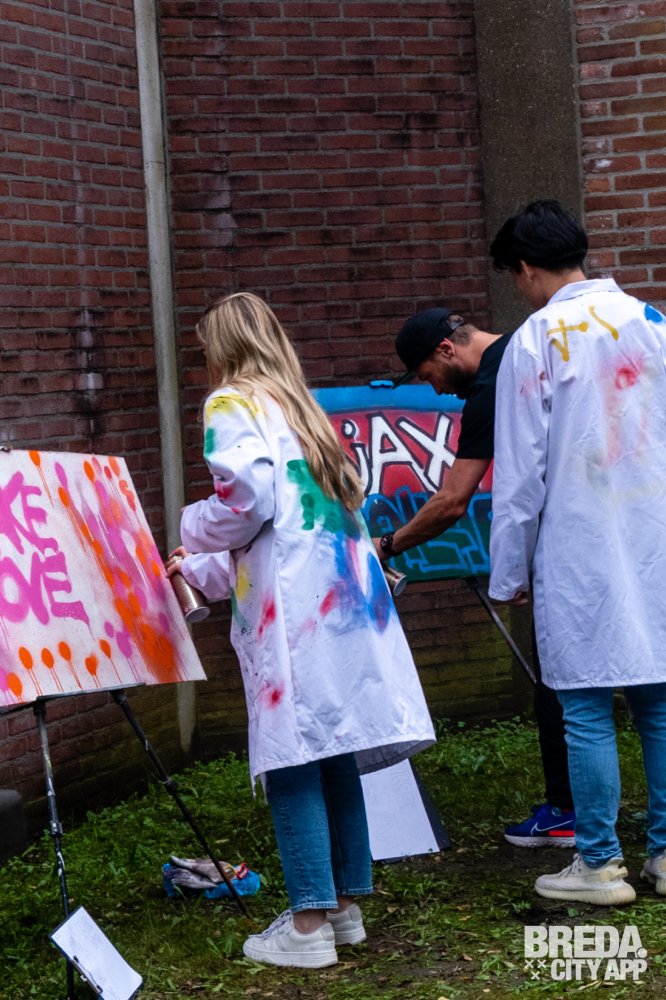 Vervolgens zijn we aan de slag gegaan met experimenteren met de graffiti bussen. We hadden al snel door hoe we verschillende lijnen kunnen zetten, hierdoor kun je veel diepte creëren in je kunstwerk. Bram en Ciam liepen rond en we kregen leuke tips om met bepaalde technieken een 'Galaxy' of 'druipers' te creëren. Om het nog gezelliger te maken stond er muziek op uit een van de muziekboxen.