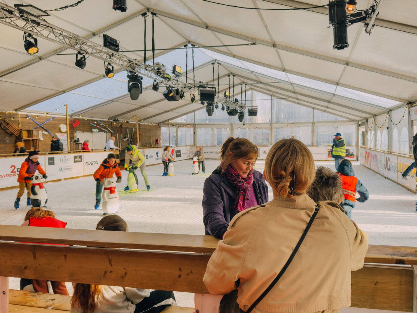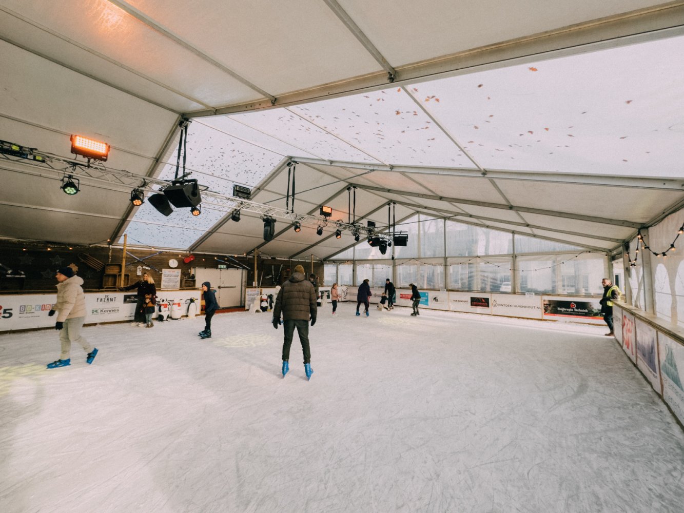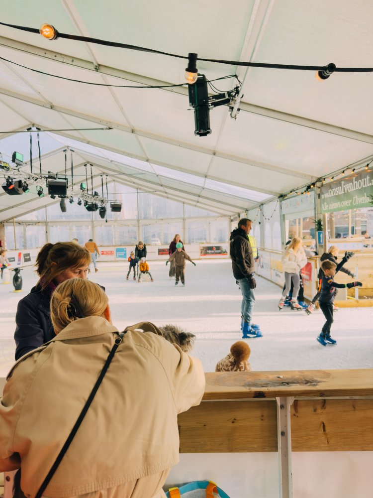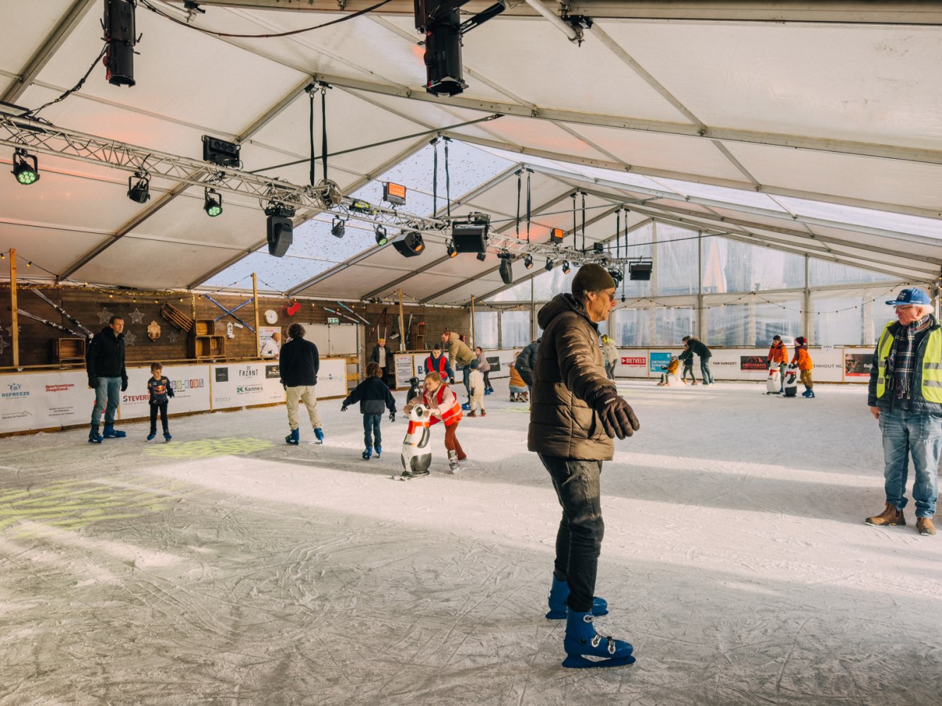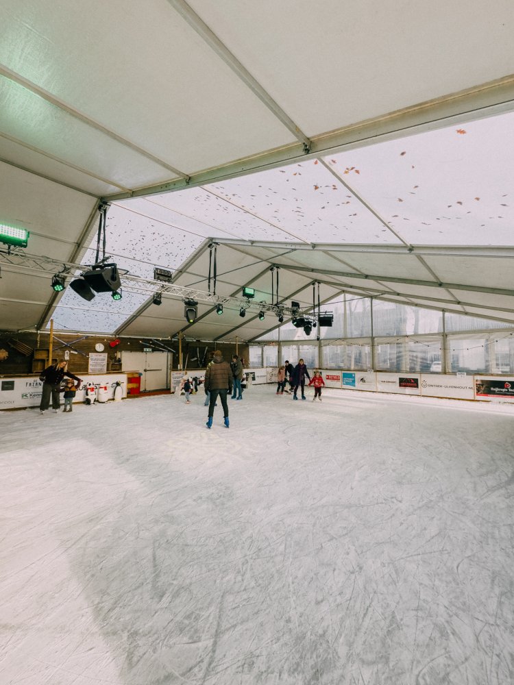 De kunstijsbaan is dagelijks geopend voor vrij schaatsen. Jong en oud kunnen hier hun rondjes draaien, via de unieke slingerende baan aan het buitenkant van de tent. Schaatsen zijn te huur en ook voor de allerkleinsten is het ijs goed toegankelijk.