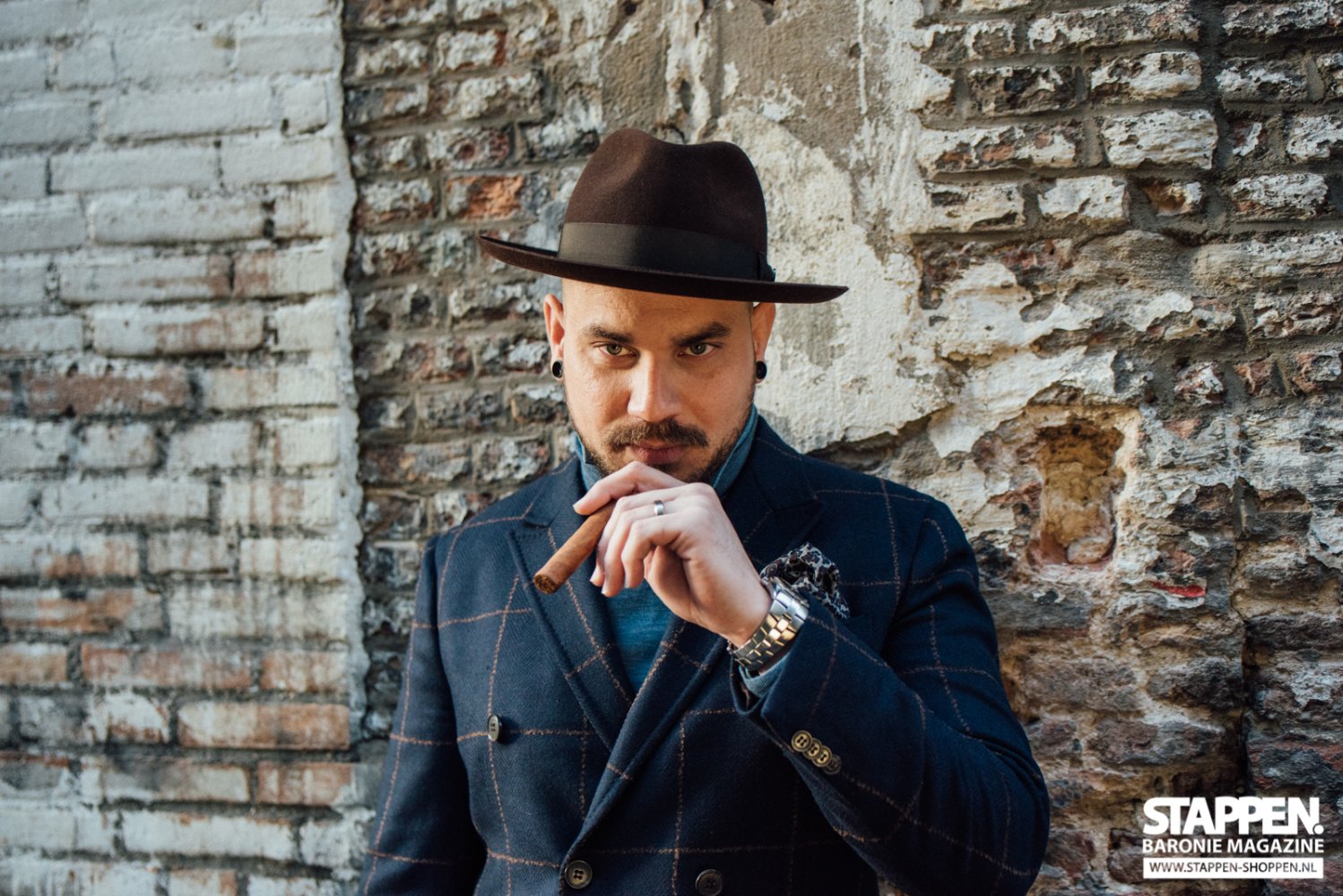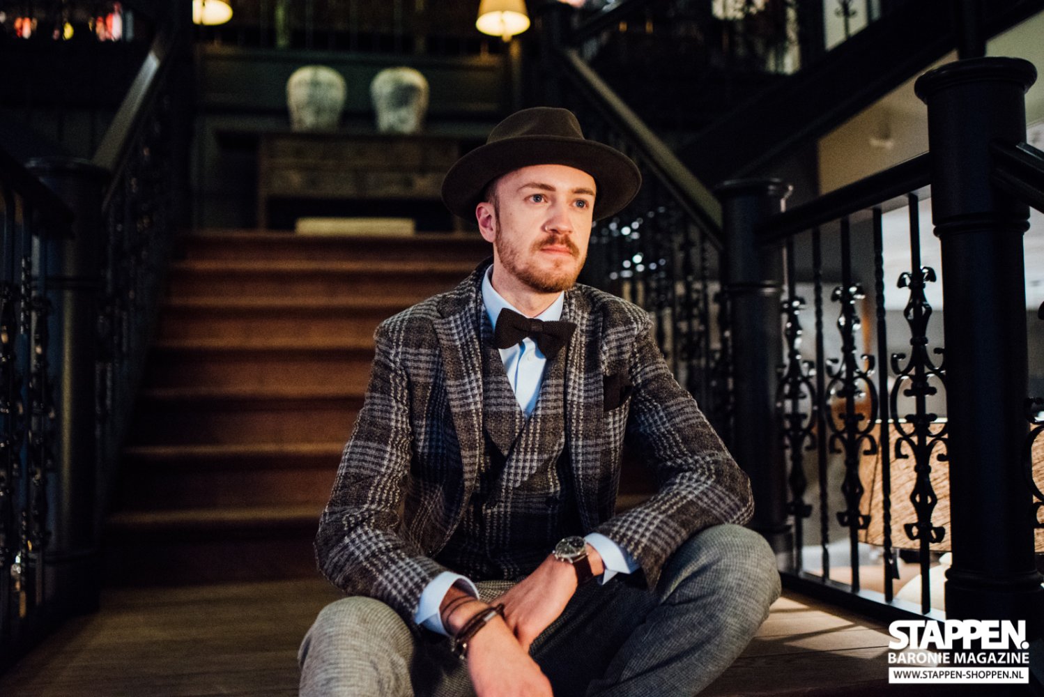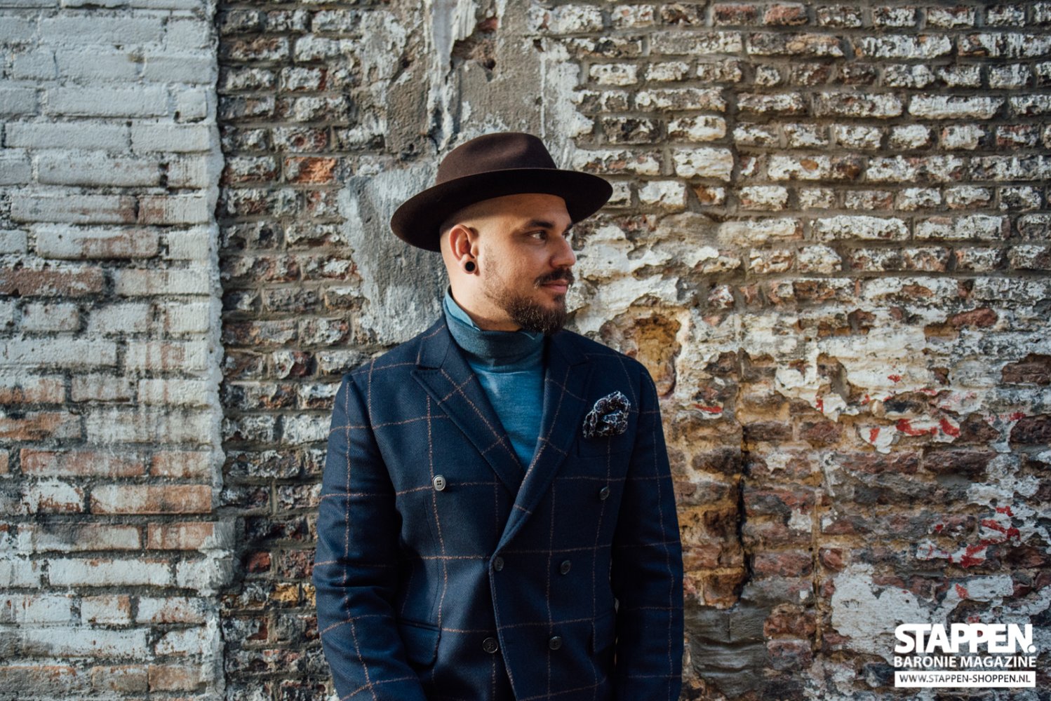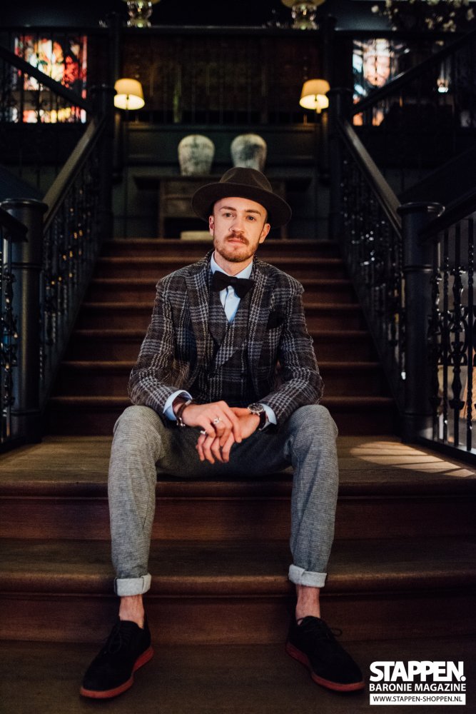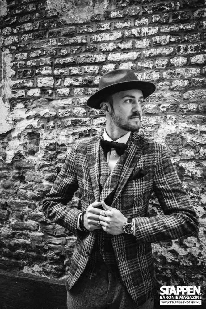 Het model draagt een op maat gemaakte outfit van Michael & Giso, een winkel waar het om de individu draait. Opgemeten met het meetlint zorgt Michael & Giso voor de perfecte pasvorm, perfect voor de uitgesproken dandy.