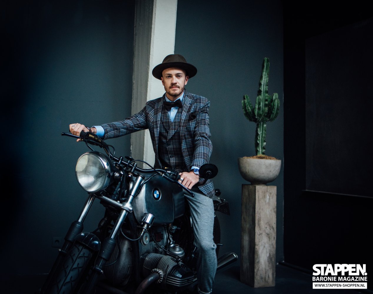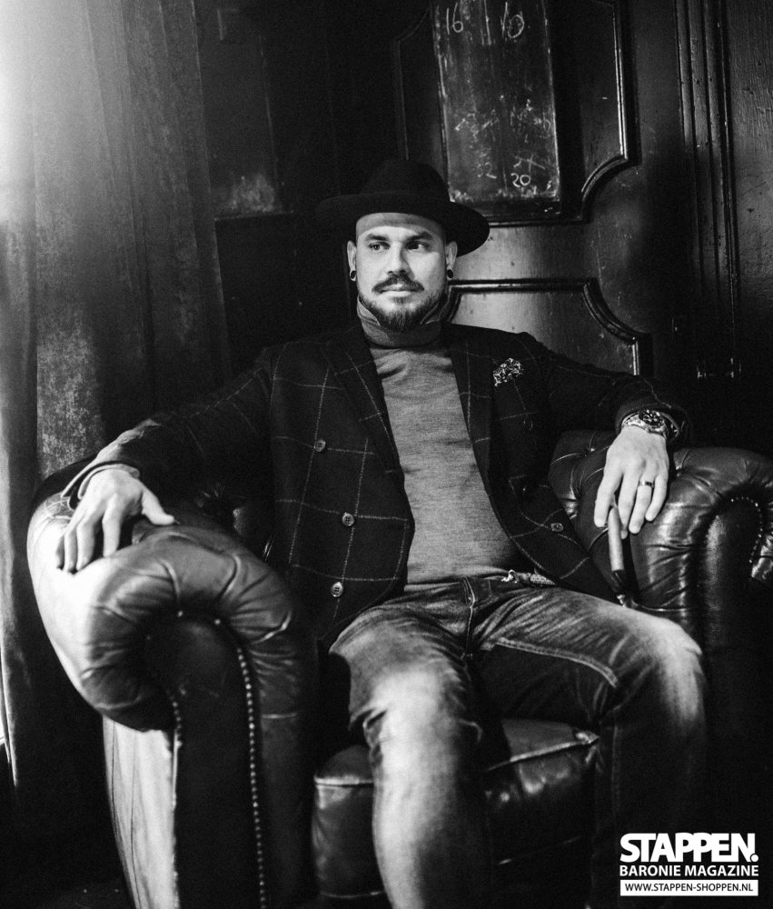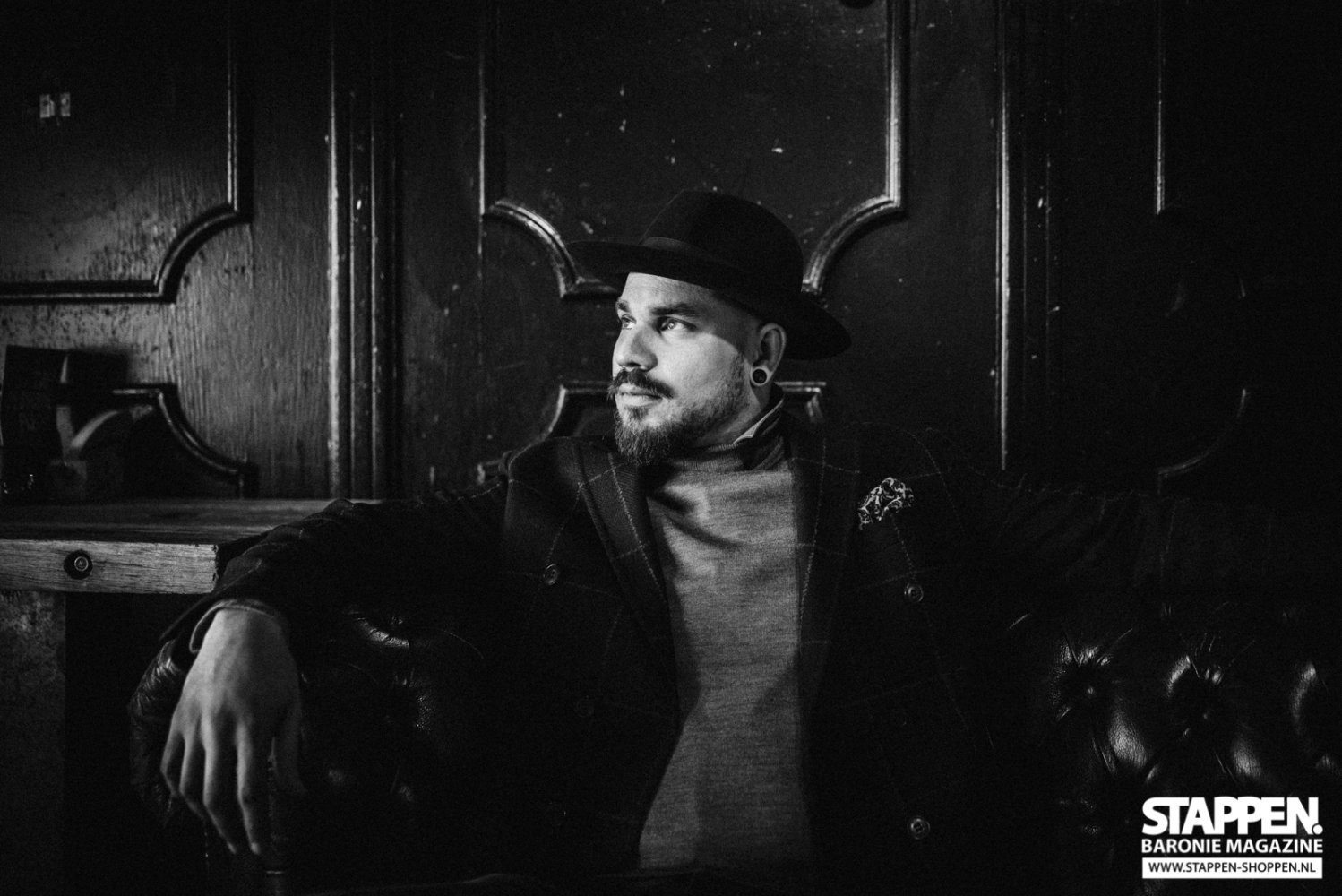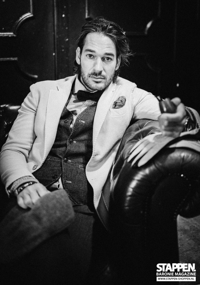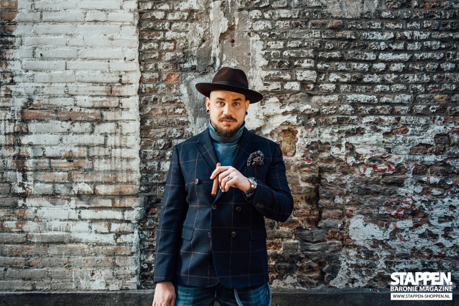 Het model draagt een op maat gemaakte outfit van Michael & Giso, een winkel waar het om de individu draait. Opgemeten met het meetlint zorgt Michael & Giso voor de perfecte pasvorm, perfect voor de uitgesproken dandy.
