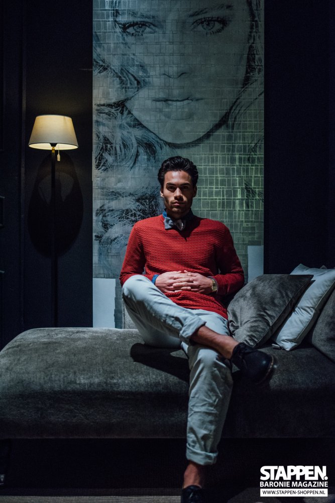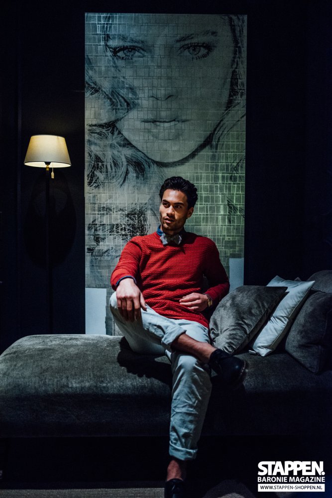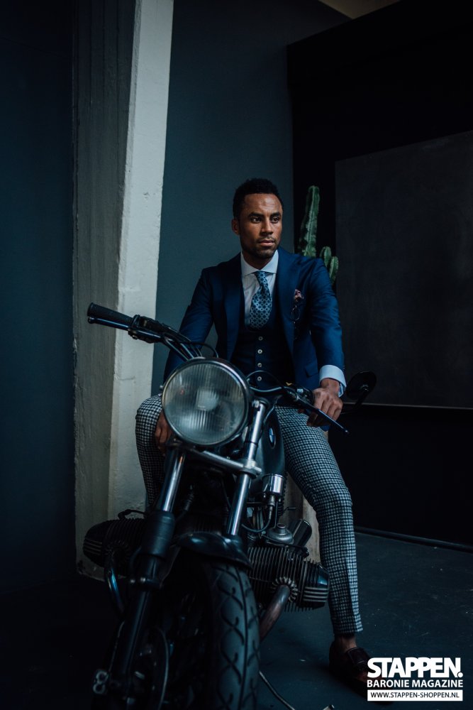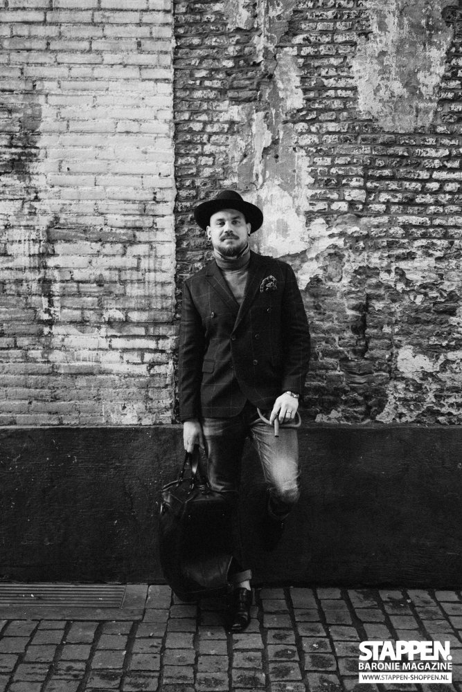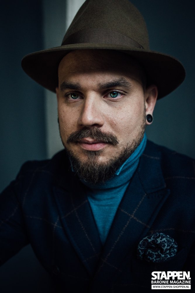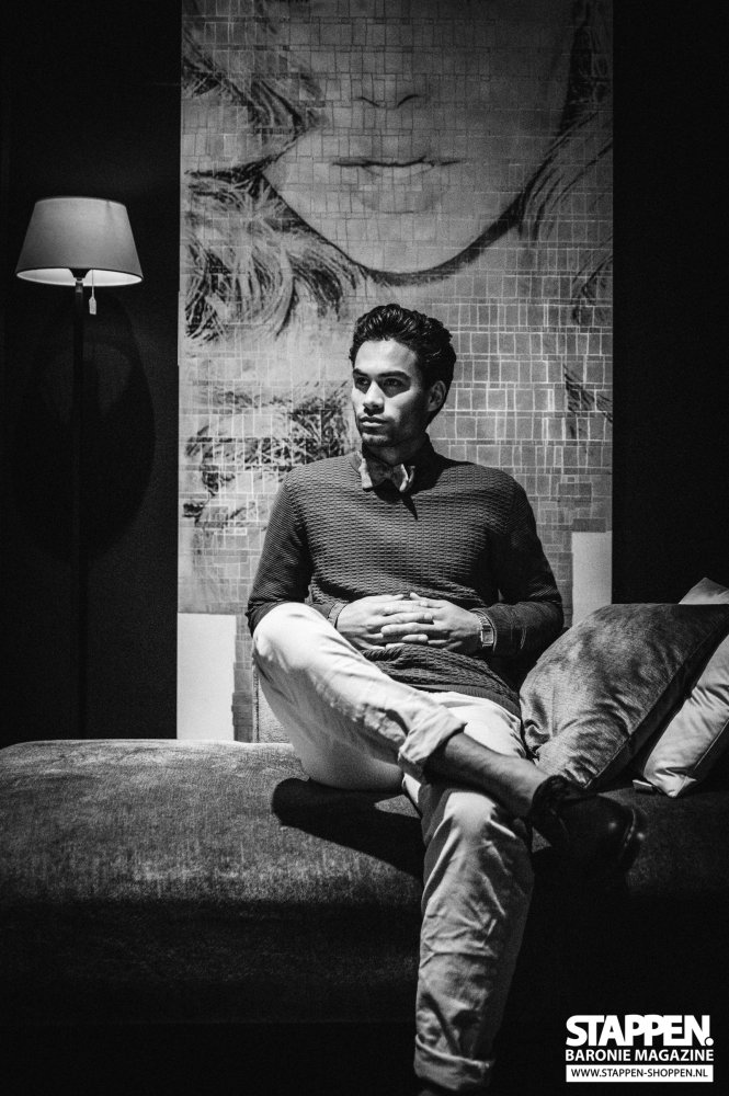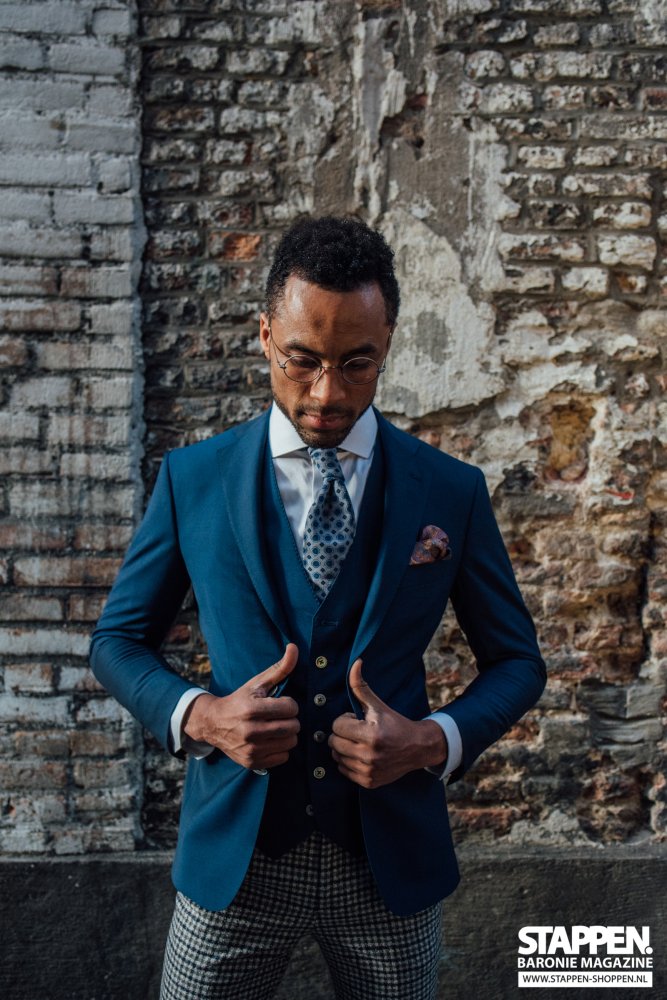 Het model draagt een op maat gemaakte outfit van Michael & Giso, een winkel waar het om de individu draait. Opgemeten met het meetlint zorgt Michael & Giso voor de perfecte pasvorm, perfect voor de uitgesproken dandy.