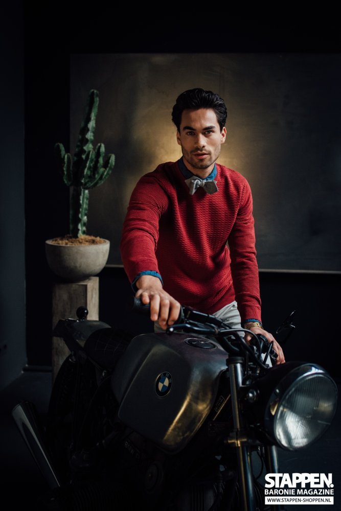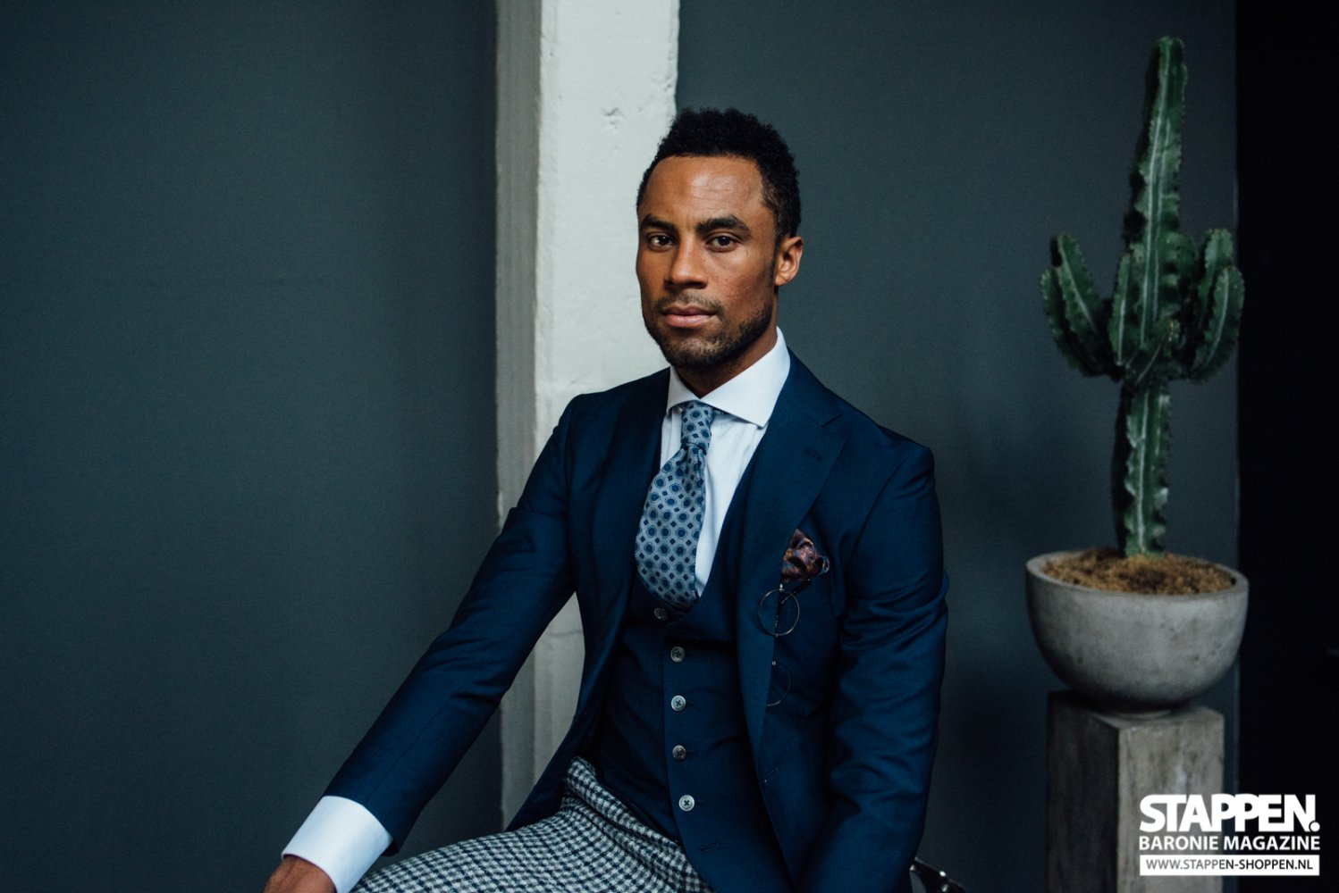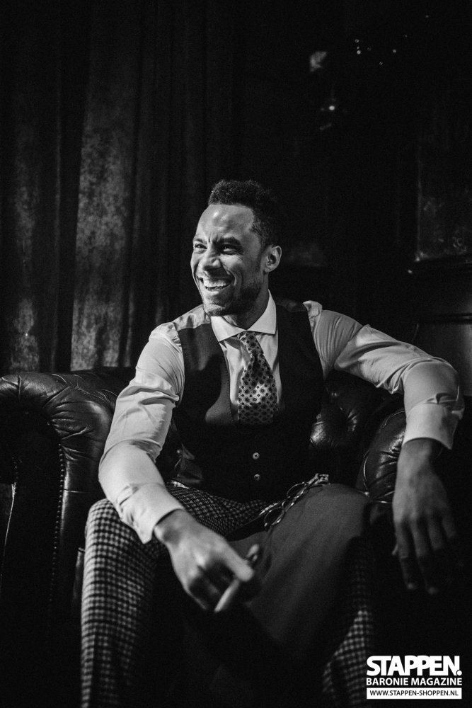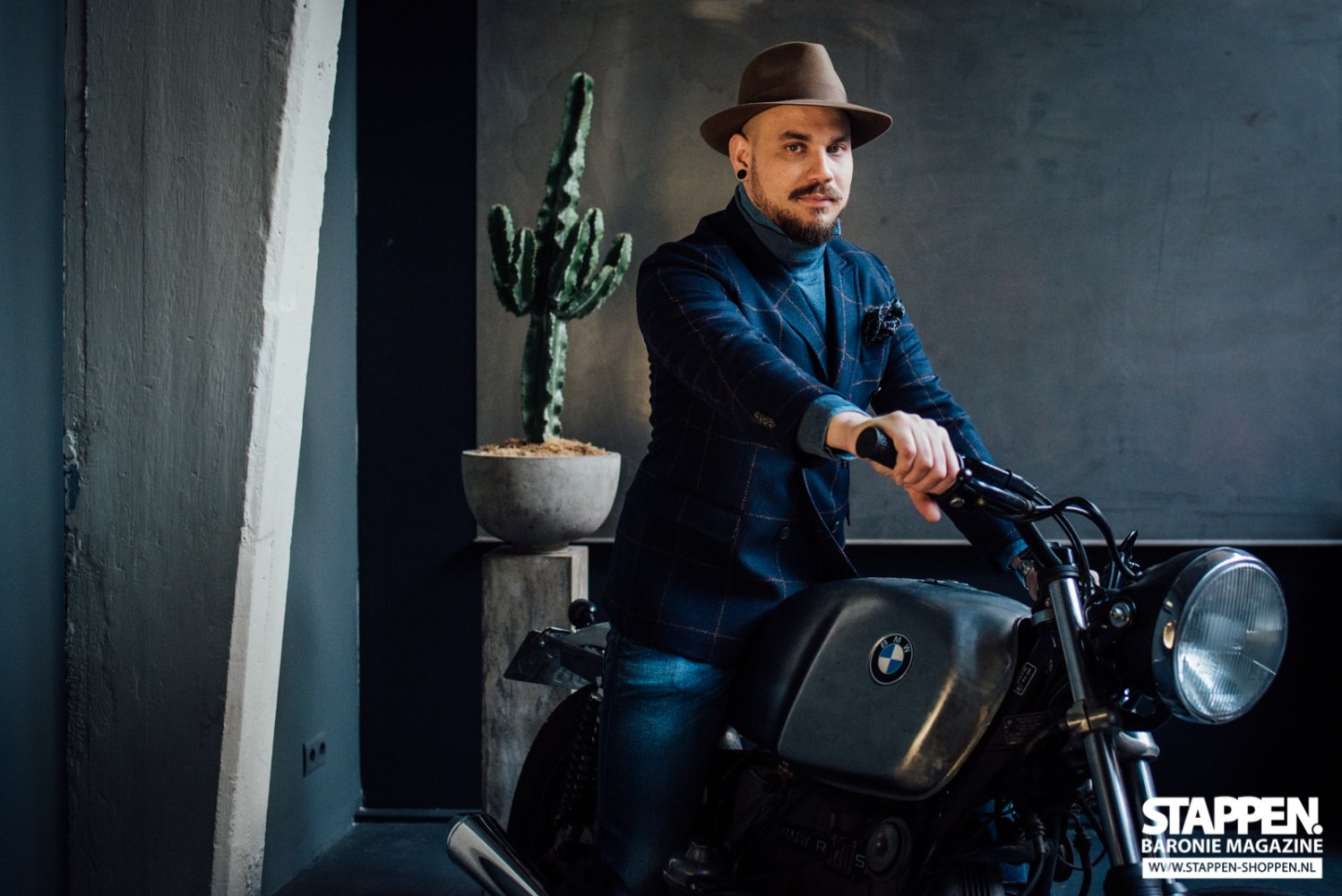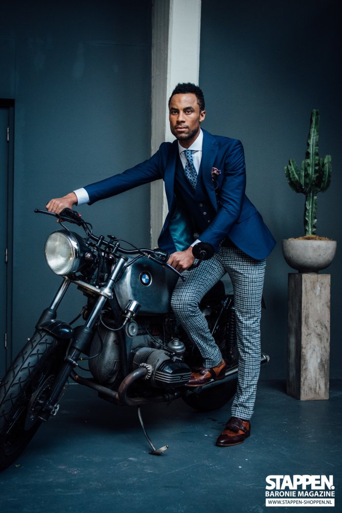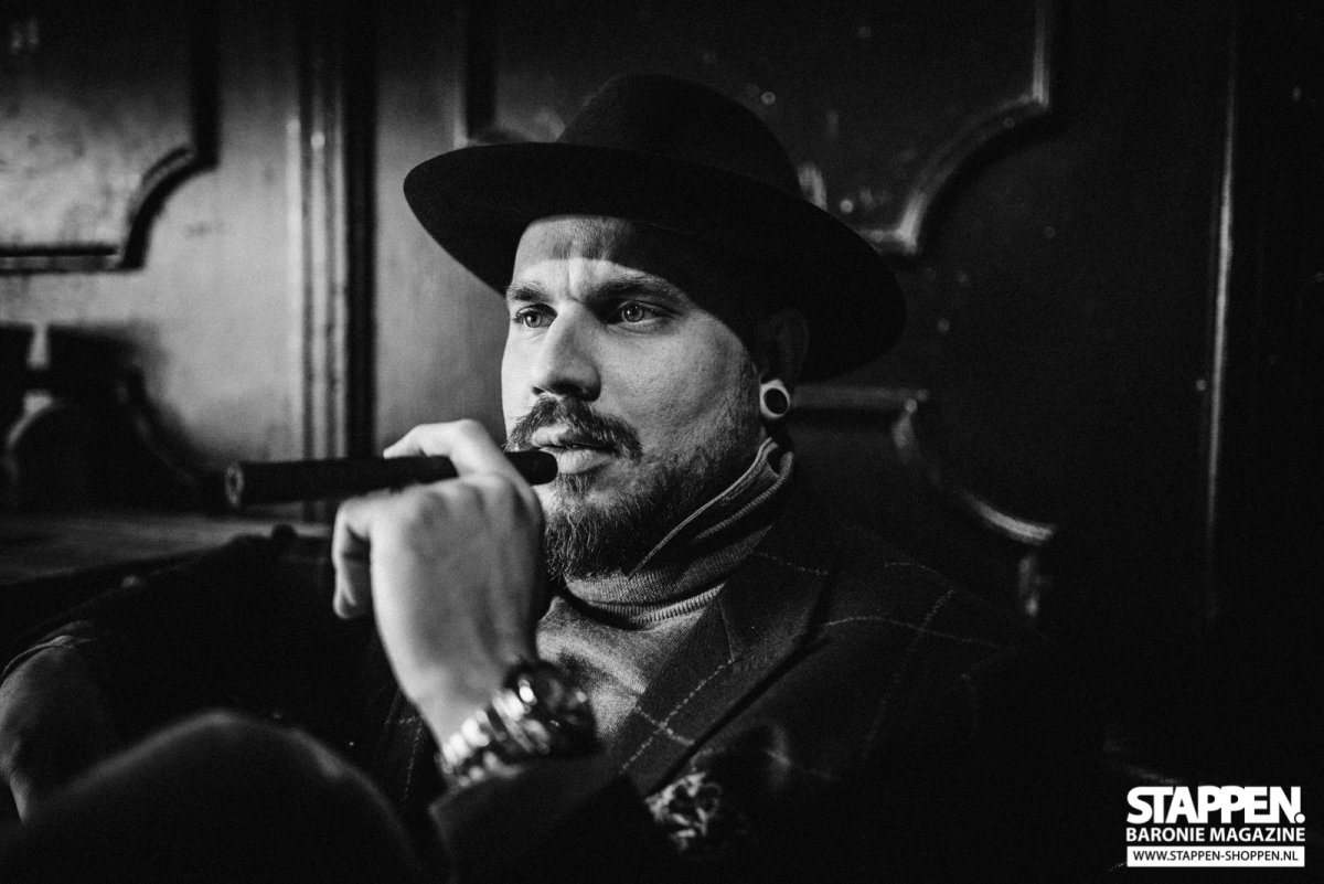 Het model draagt een op maat gemaakte outfit van Michael & Giso, een winkel waar het om de individu draait. Opgemeten met het meetlint zorgt Michael & Giso voor de perfecte pasvorm, perfect voor de uitgesproken dandy.