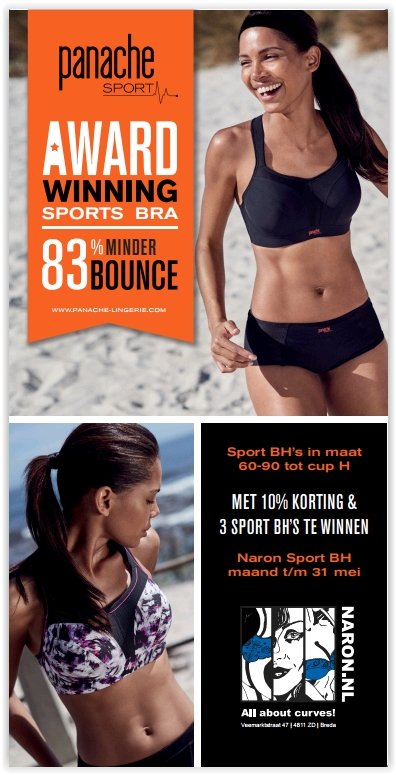Bij lingeriezaak Naron aan de Veemarktstraat staat deze maand de sportbh centraal! Want zo net voor de zomer willen we ons vaak nog even in het zweet werken voordat we in een bikini op het strand liggen. Een goede sport-bh is dan onmisbaar. Met name voor de dames met een (cup)maatje meer. Voor een perfecte pasvorm, goed advies en een uitgebreid aanbod ga je dan naar de zussen Nathalie en Sharon, dé experts in Breda op het gebied van grote maten lingerie, tevens oprichtsters van Naron. Super leuk zijn bovendien de vele acties die deze maand plaatsvinden in de shop. Lees snel verder om te zien waarvan je kunt profiteren...