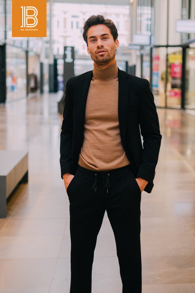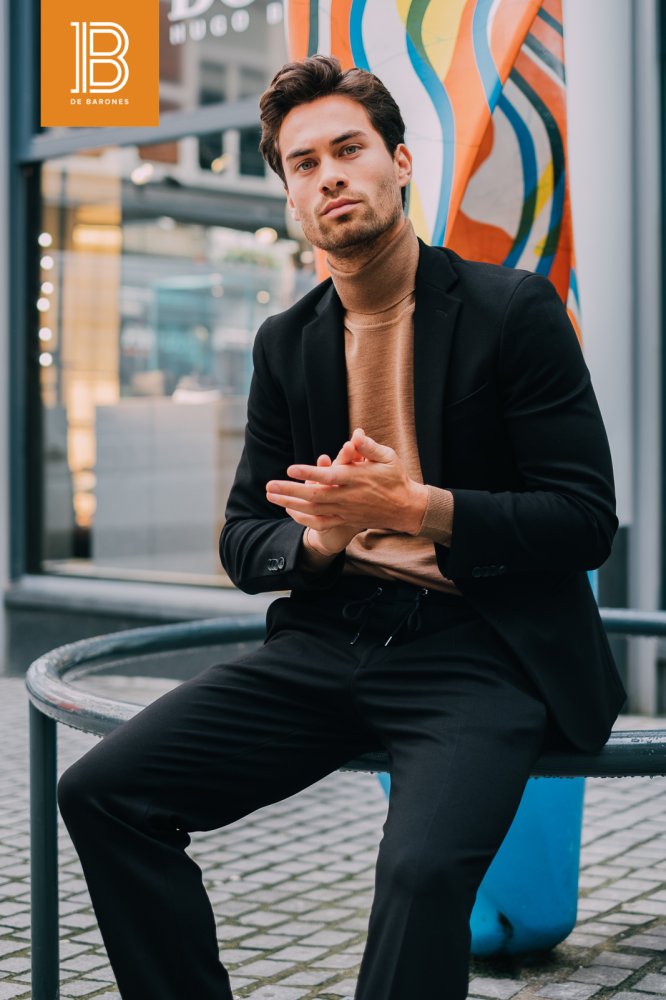 De coltrui is niet meer weg te denken dit najaar! De coltrui combineer je op talloze manieren. In deze outfit van Hugo Boss wordt de coltrui in stijl gecombineerd met een zwarte colbert en sportieve pantalon. De karamel bruine kleur in combinatie met het zwart zorgt voor een luxe en stijlvolle uitstraling van de outfit. De keuze voor de sportieve pantalon maakt de outfit casual-chic.
